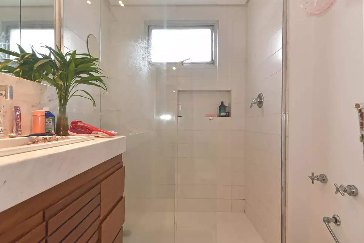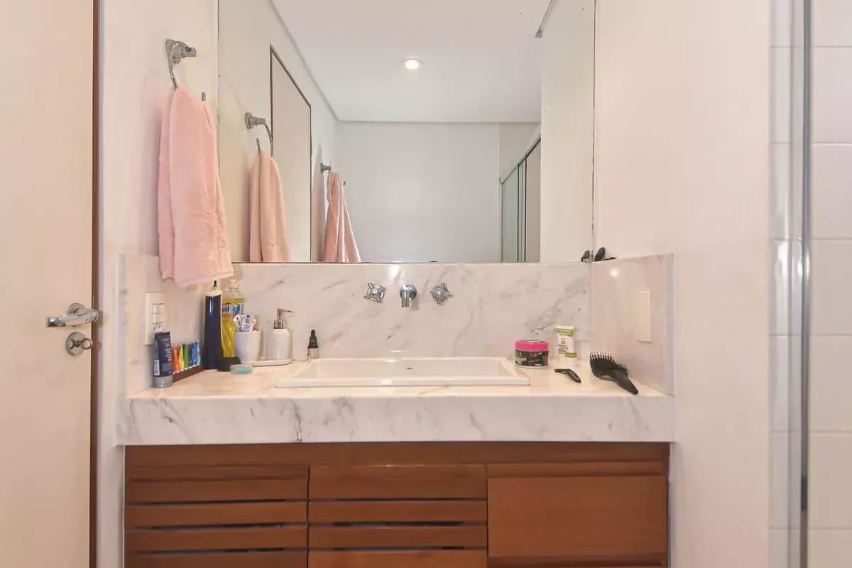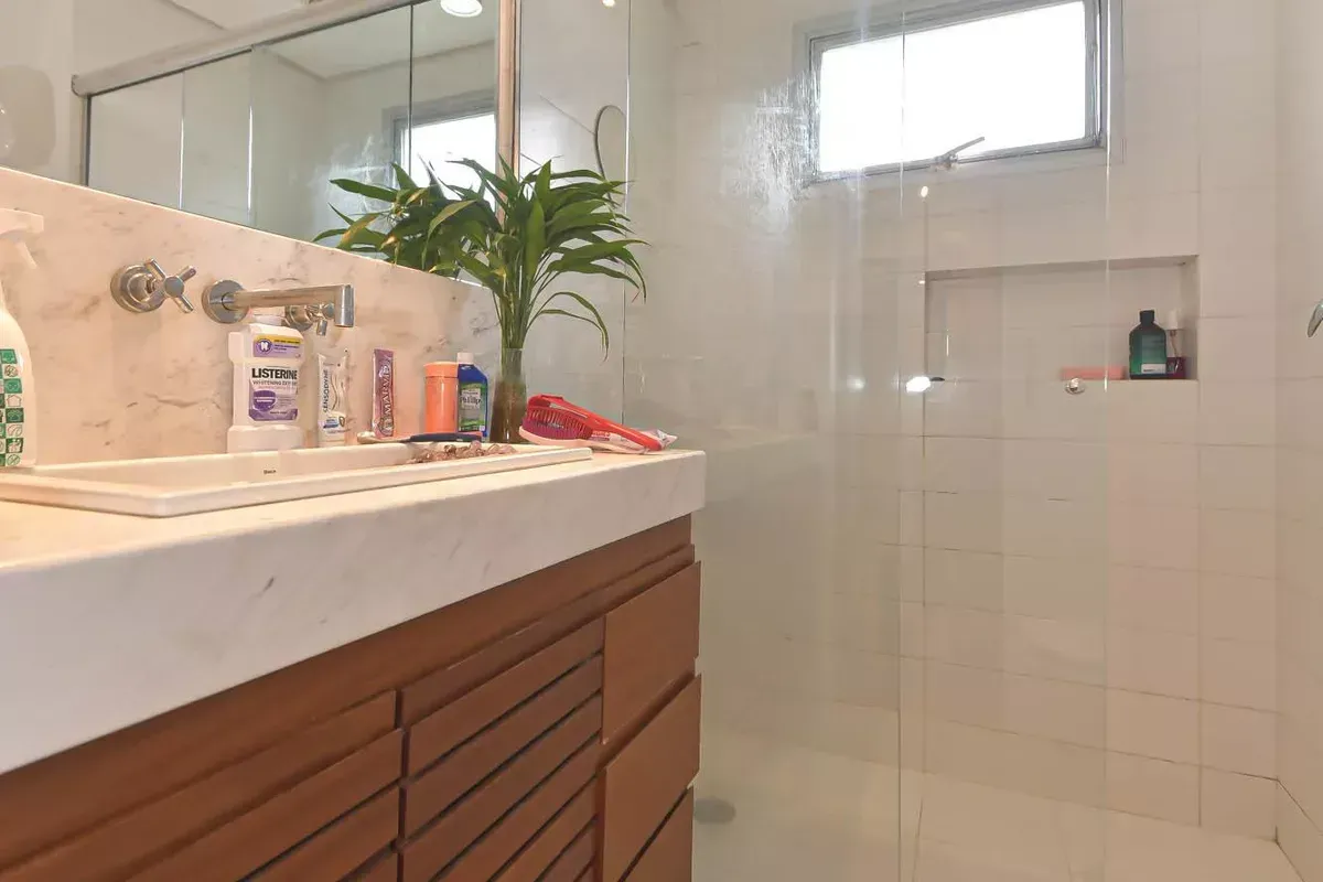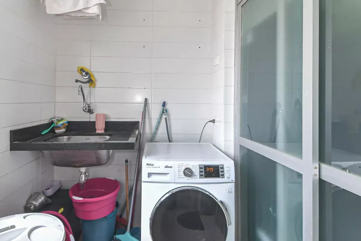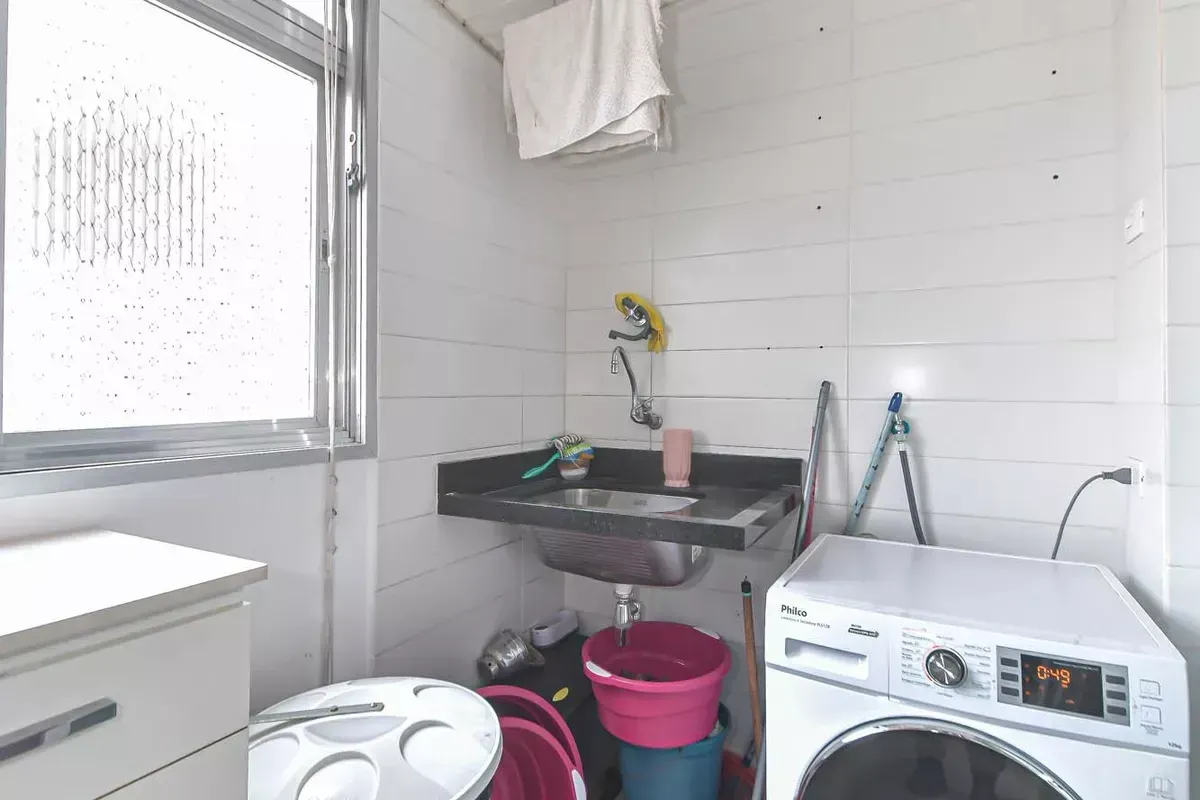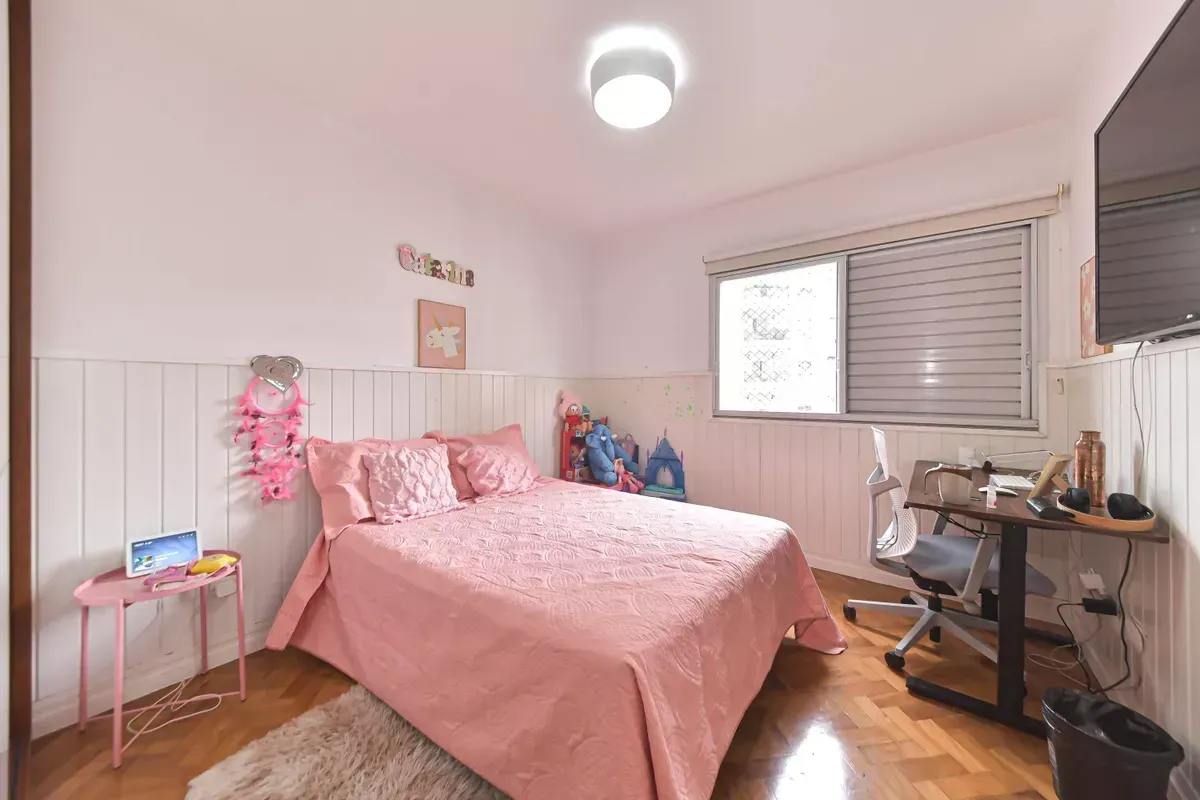 Apartamento com três dormitórios, sendo uma suíte, três banheiros, incluindo lavabo, sala de estar e jantar integradas, cozinha americana com armários planejados e área de serviço, além de quarto e banheiro de serviço. Conta com ar-condicionado, closet, chuveiro a gás, portas amplas em quartos e corredores e piso em taco. Possui duas vagas de garagem. Imóvel em andar alto, com boa iluminação natural e excelente ventilação. Condomínio com portaria 24h, elevador, piscina, academia, salão de festas, playground e área verde. Localizado em rua residencial do Campo Belo, com acesso rápido ao Aeroporto de Congonhas e a uma completa rede de serviços do bairro, como escolas, padarias, restaurantes, farmácias, petshops e o Shopping Ibirapuera. Mobília pode ser negociada.