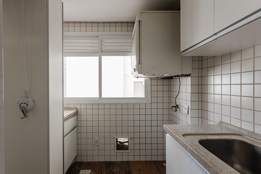 Sala de estar e jantar espaçosas, cozinha e lavanderia. Uma vaga de garagem. Necessita uma atualização.