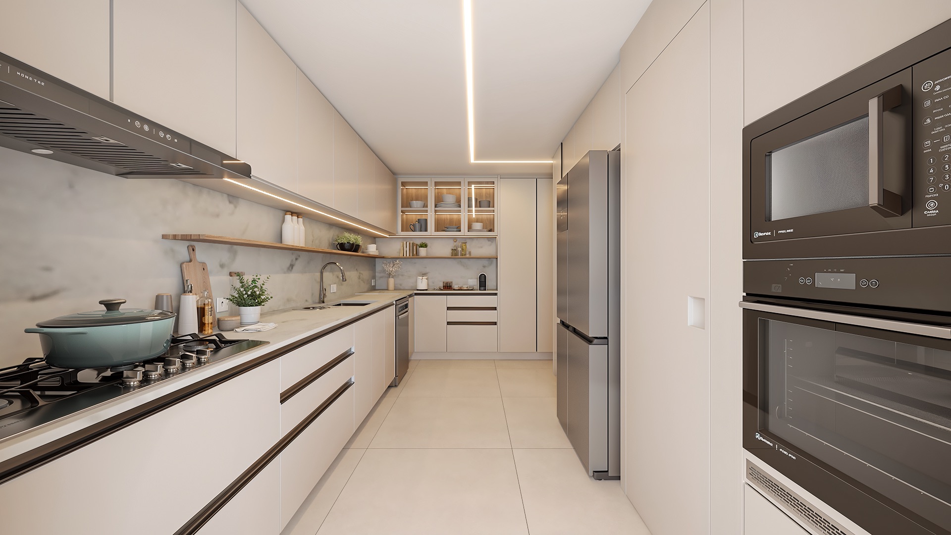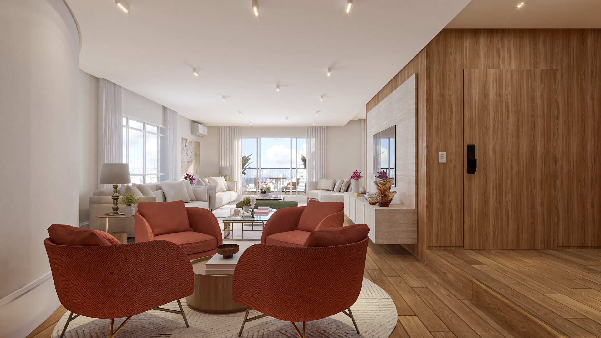 O apartamento oferece ambientes generosos e iluminados, sendo um amplo living para quatro ambientes, sala de jantar com vista para a cidade, copa integrada e cozinha equipada com eletrodomésticos Electrolux e marcenaria Bontempo.