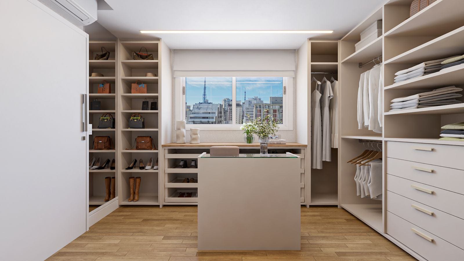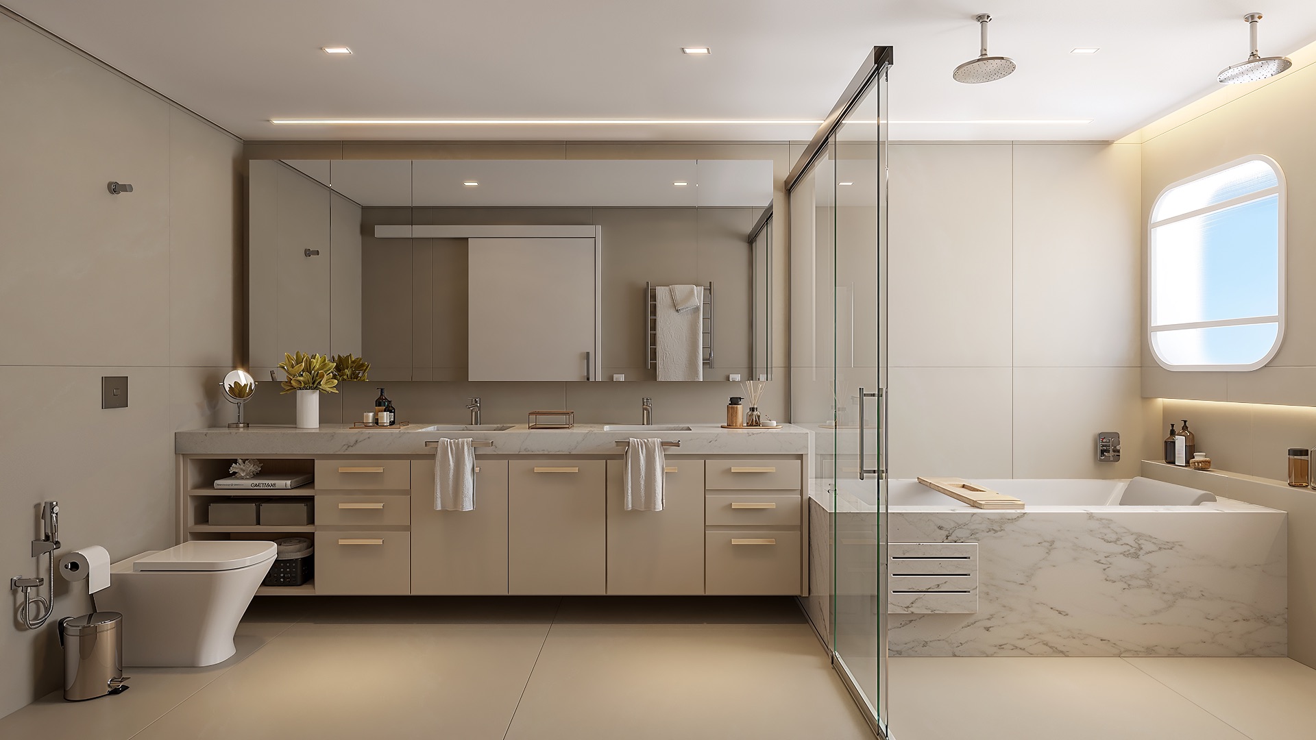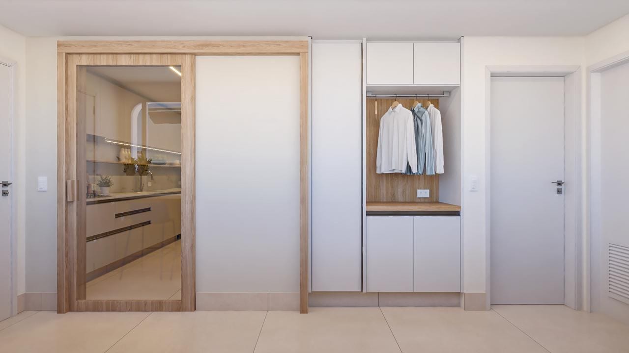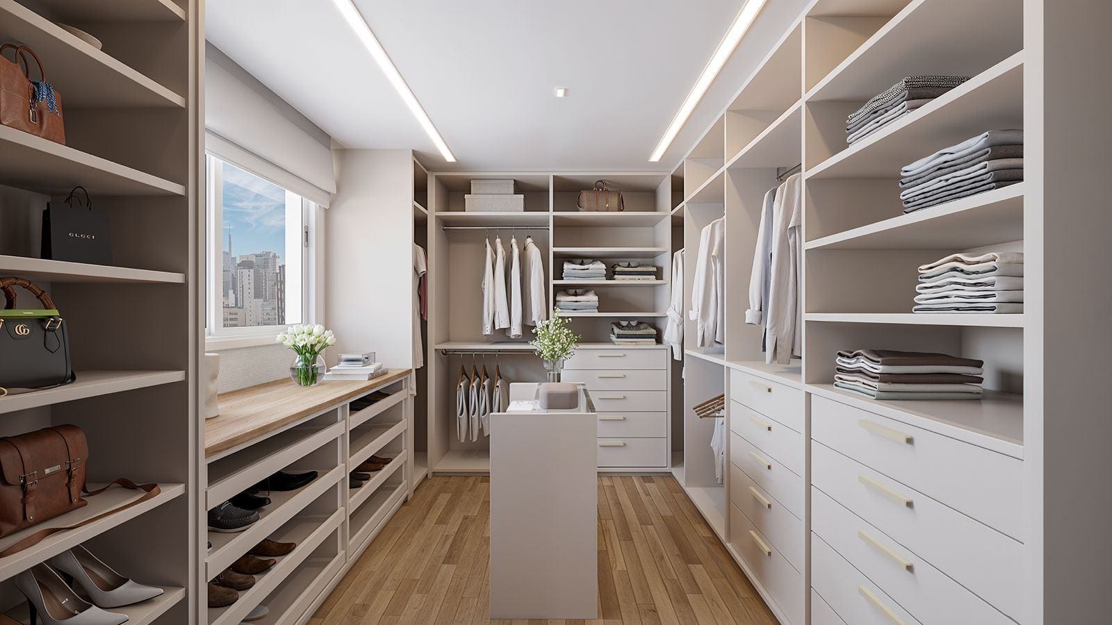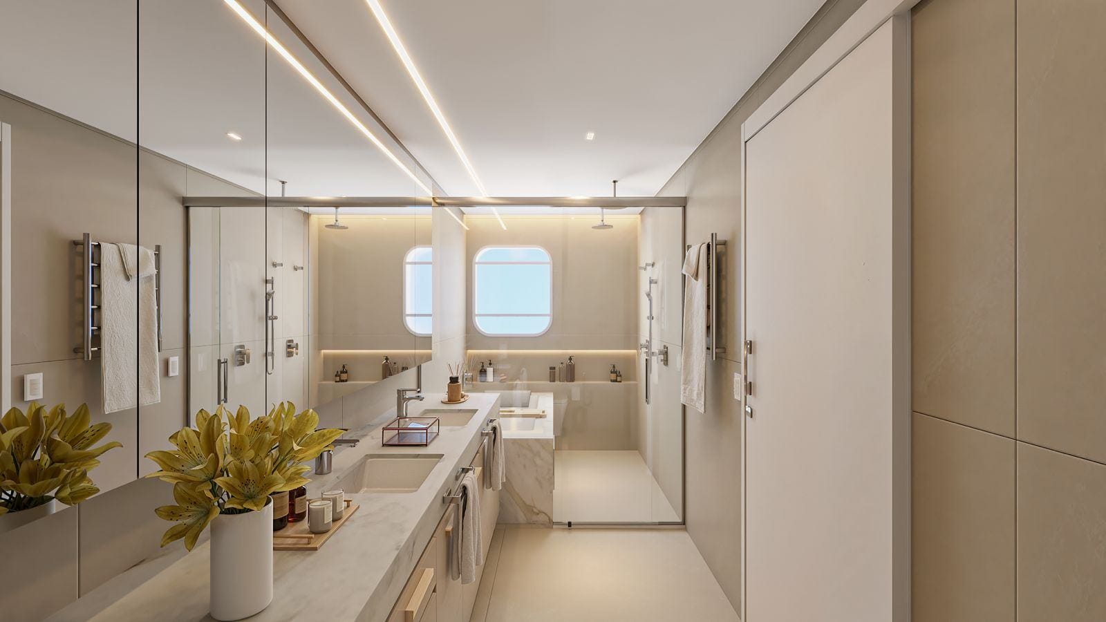 A suíte master oferece walk-in closet, banho spa em mármore Branco Paraná, duchas duplas e jacuzzi.