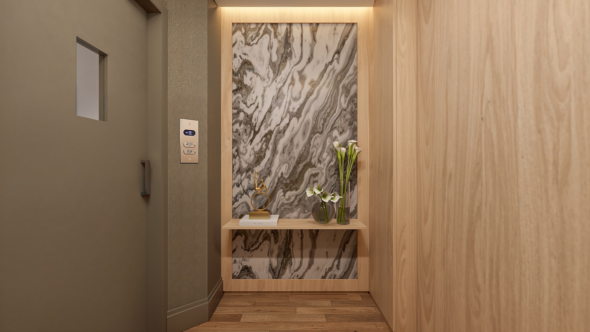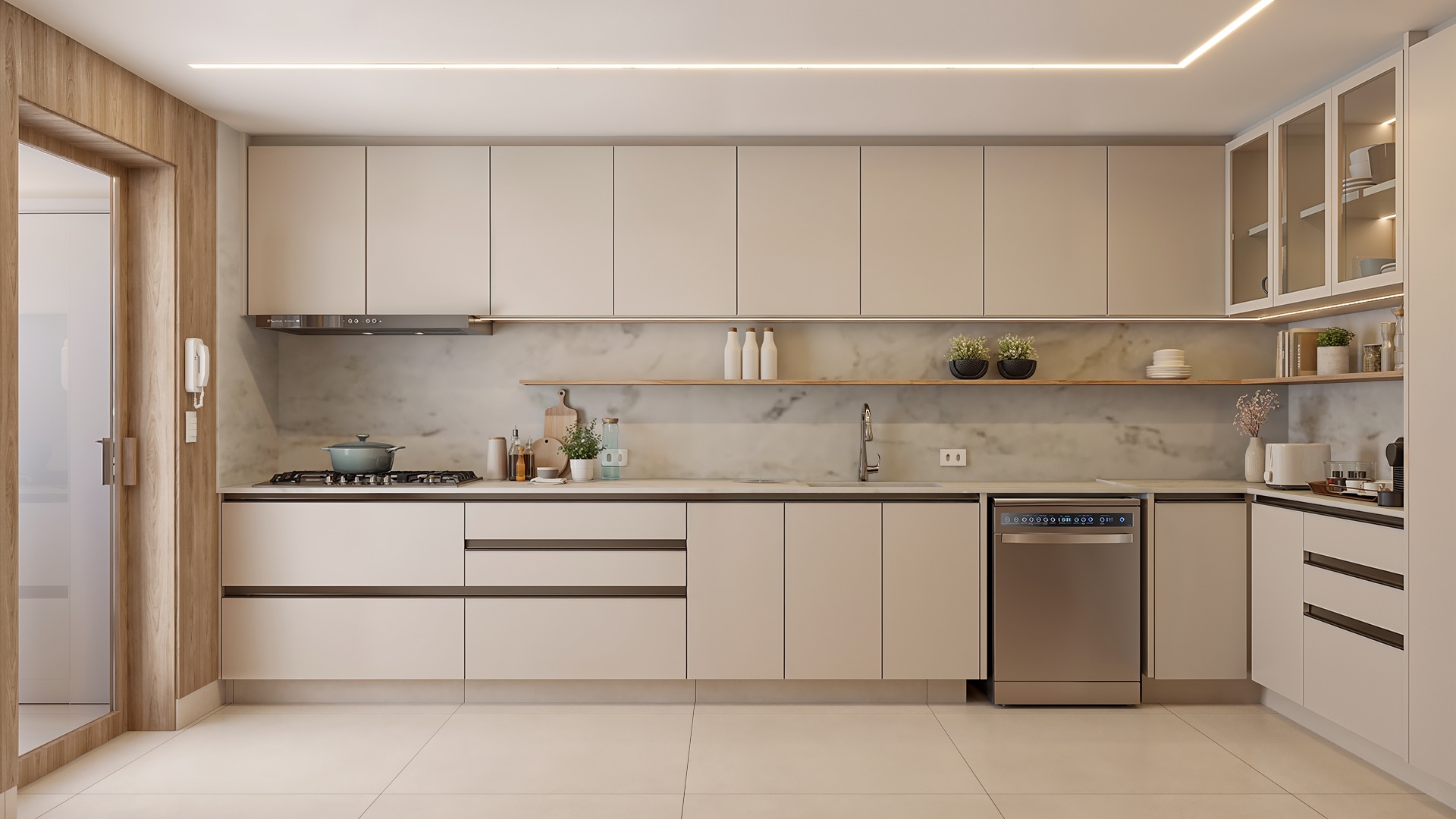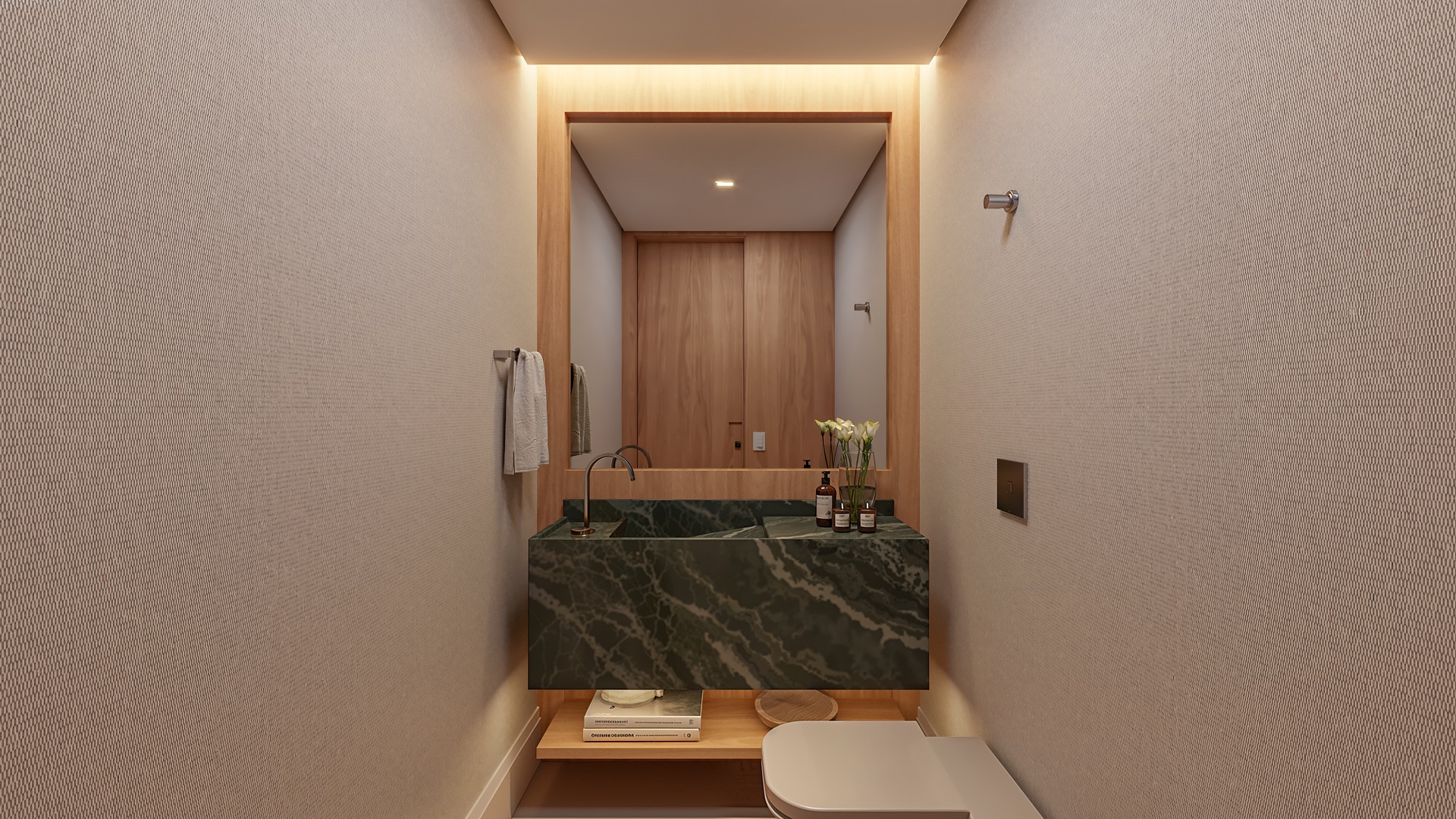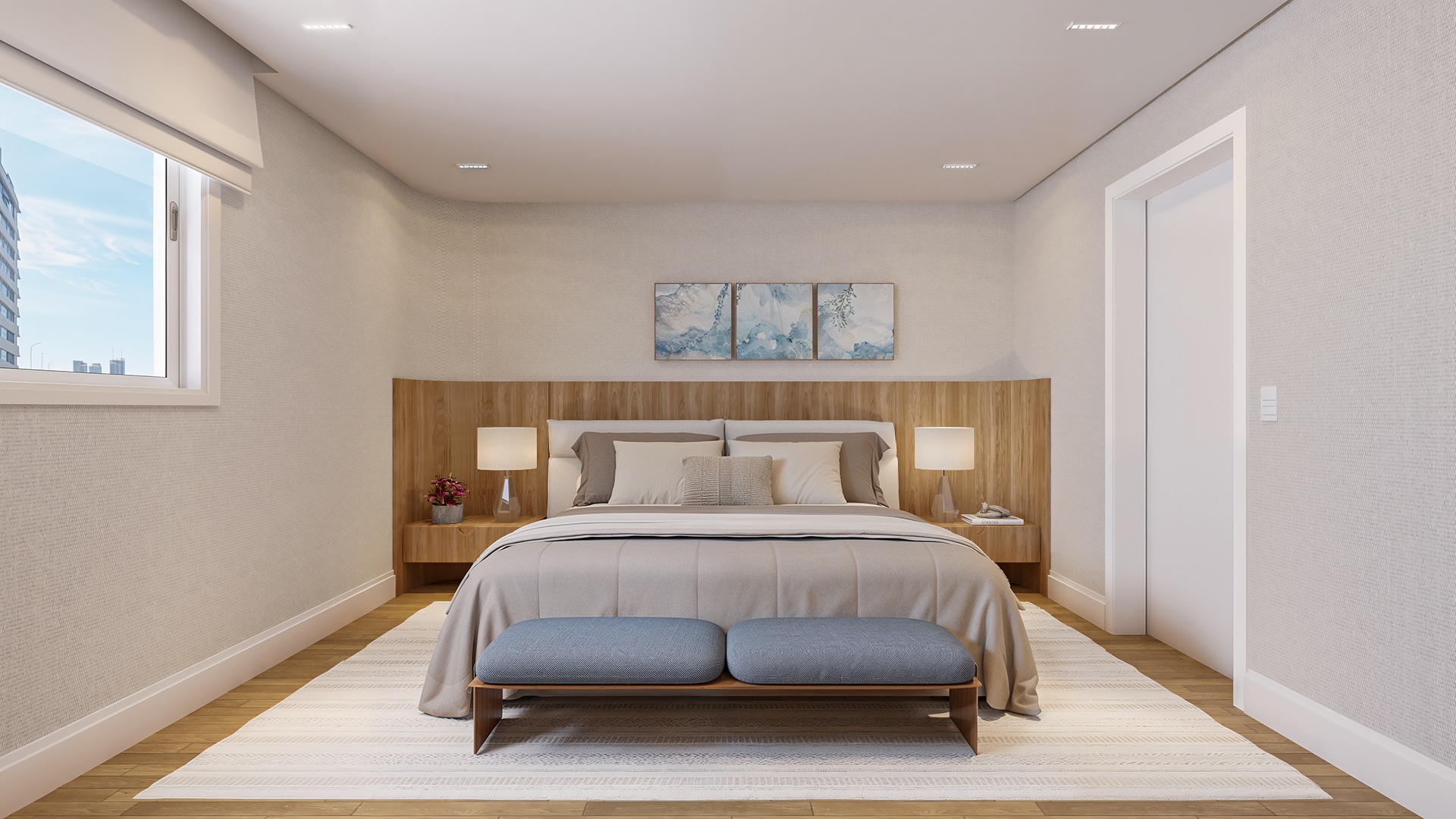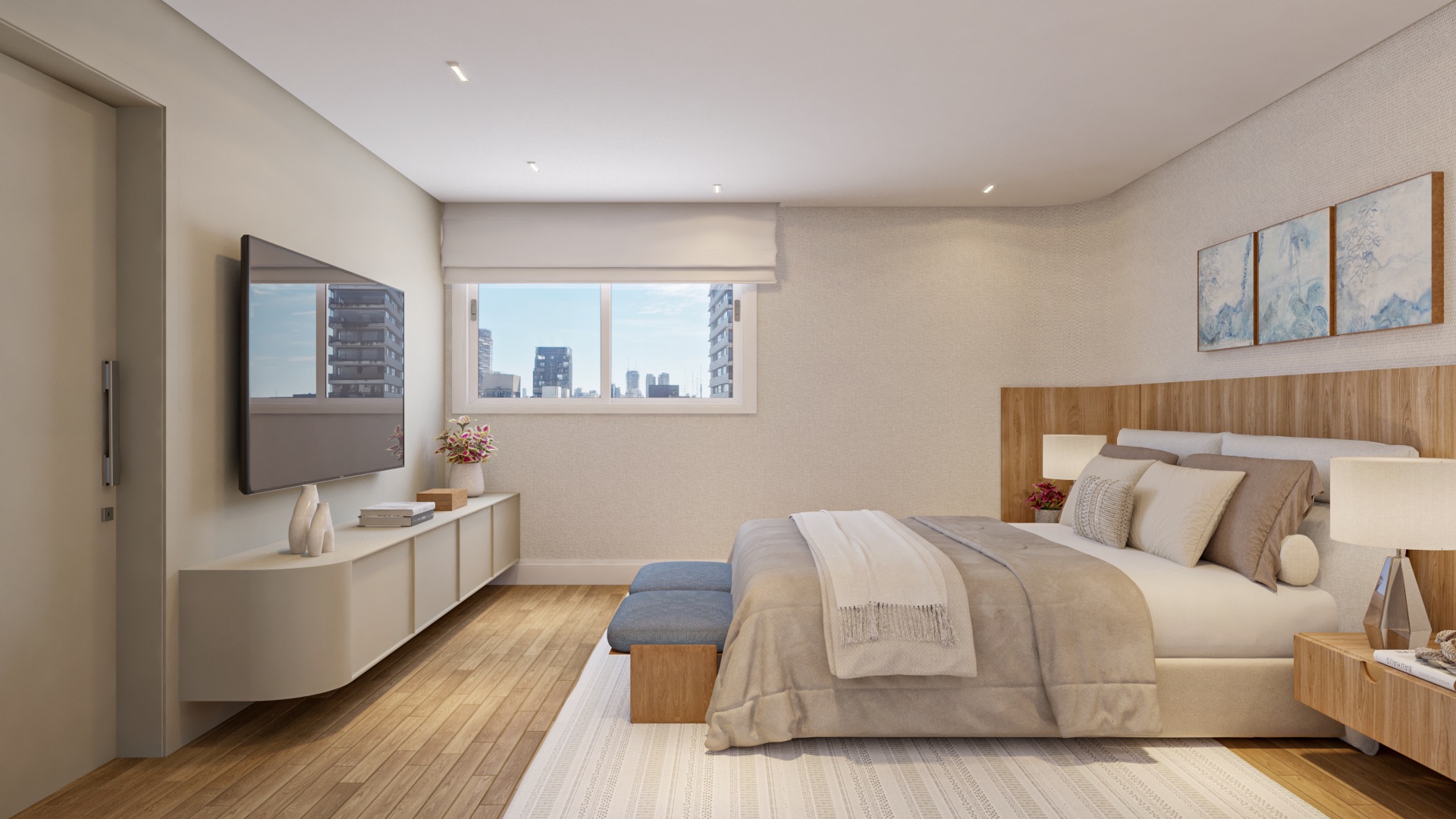 A suíte master oferece walk-in closet, banho spa em mármore Branco Paraná, duchas duplas e jacuzzi.