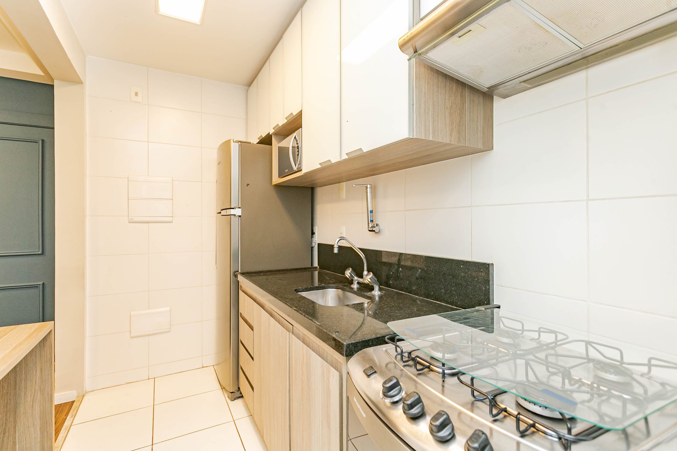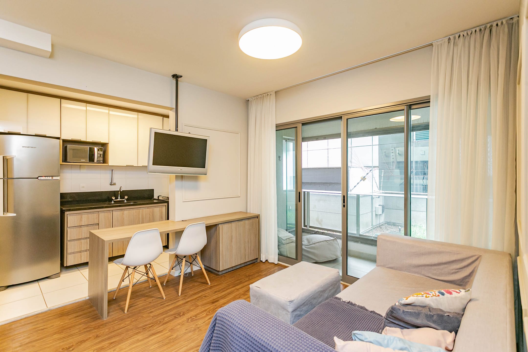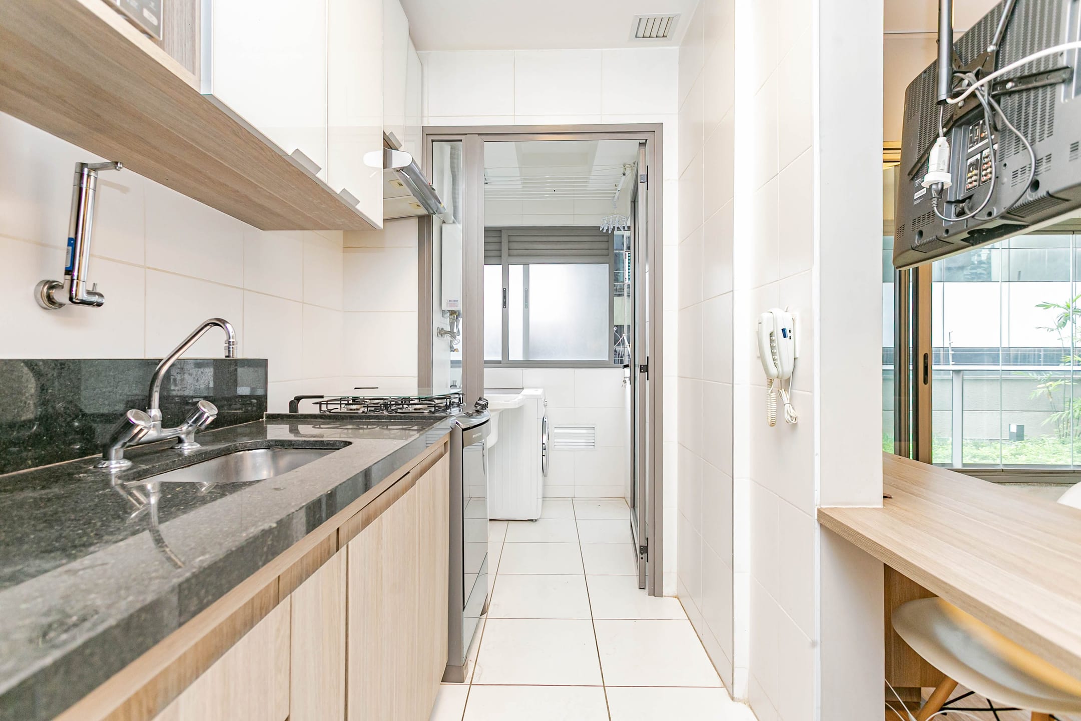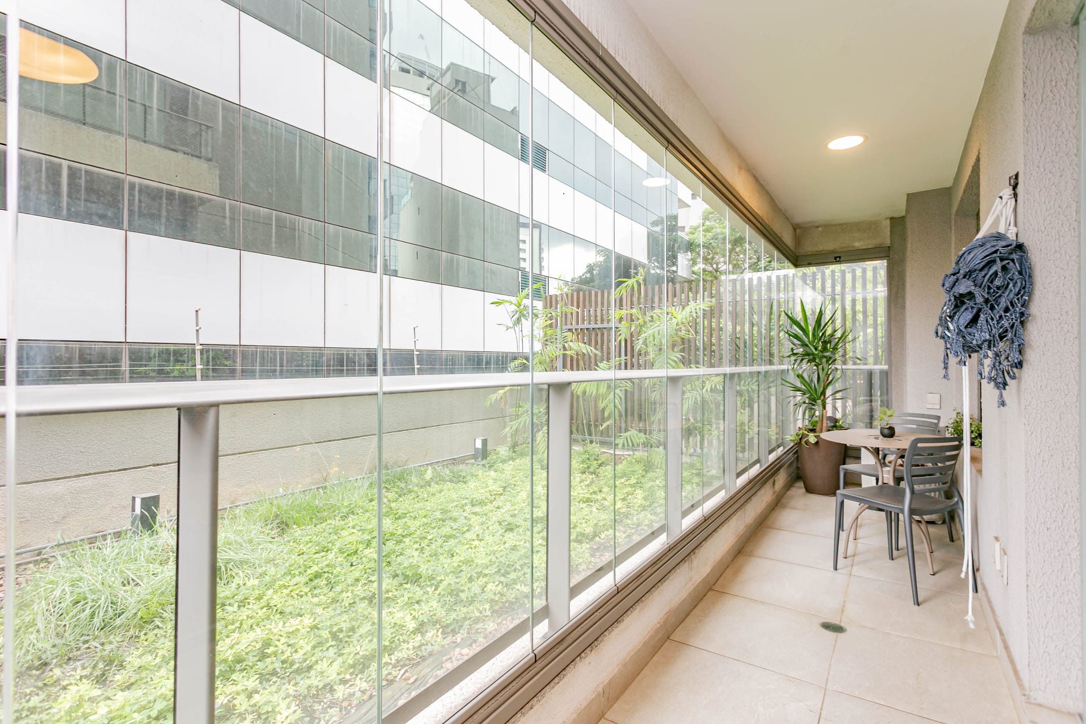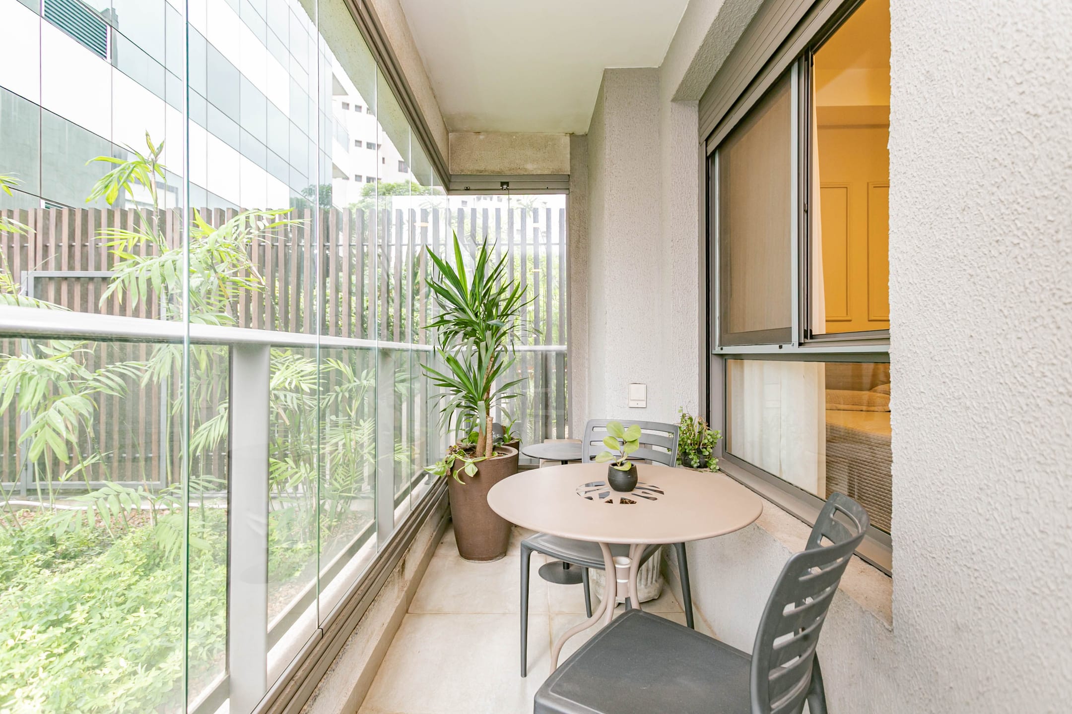 Conta com 1 dormitório bem confortável, cozinha integrada à sala, banheiro e lavanderia, além de uma extensa varanda com envidraçamento, que garante silêncio e muita luz natural, com vista para as áreas verdes do condomínio.