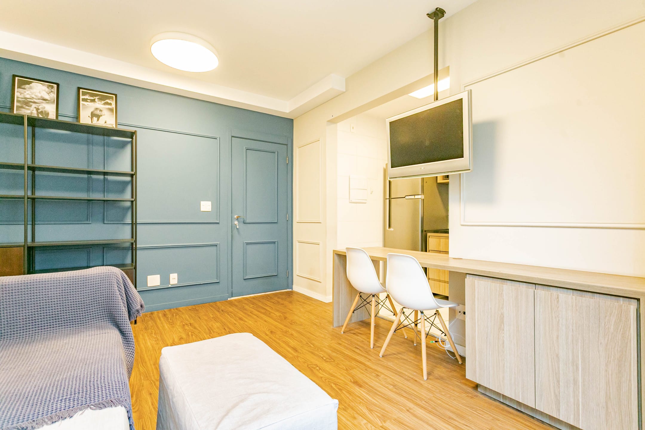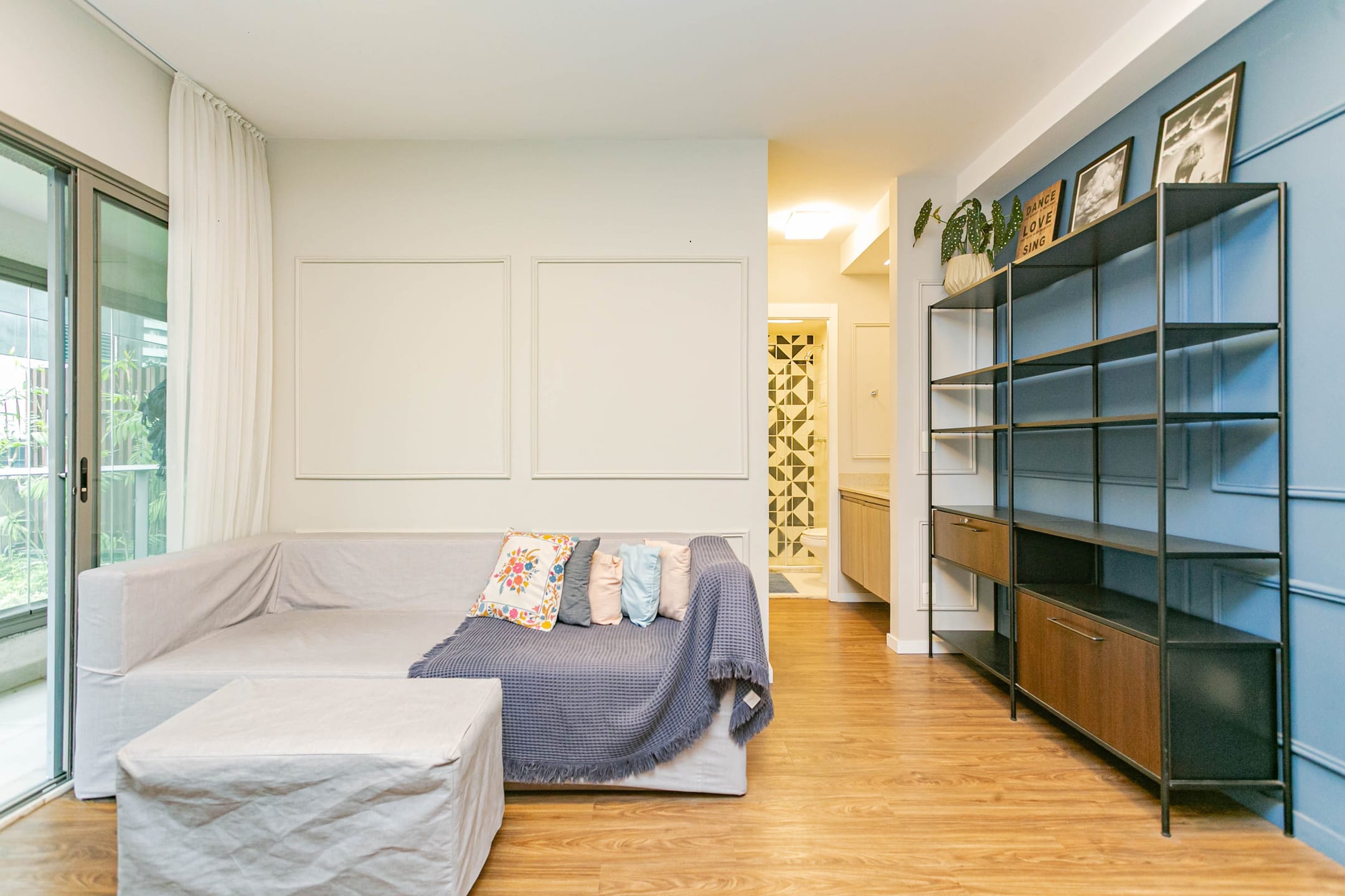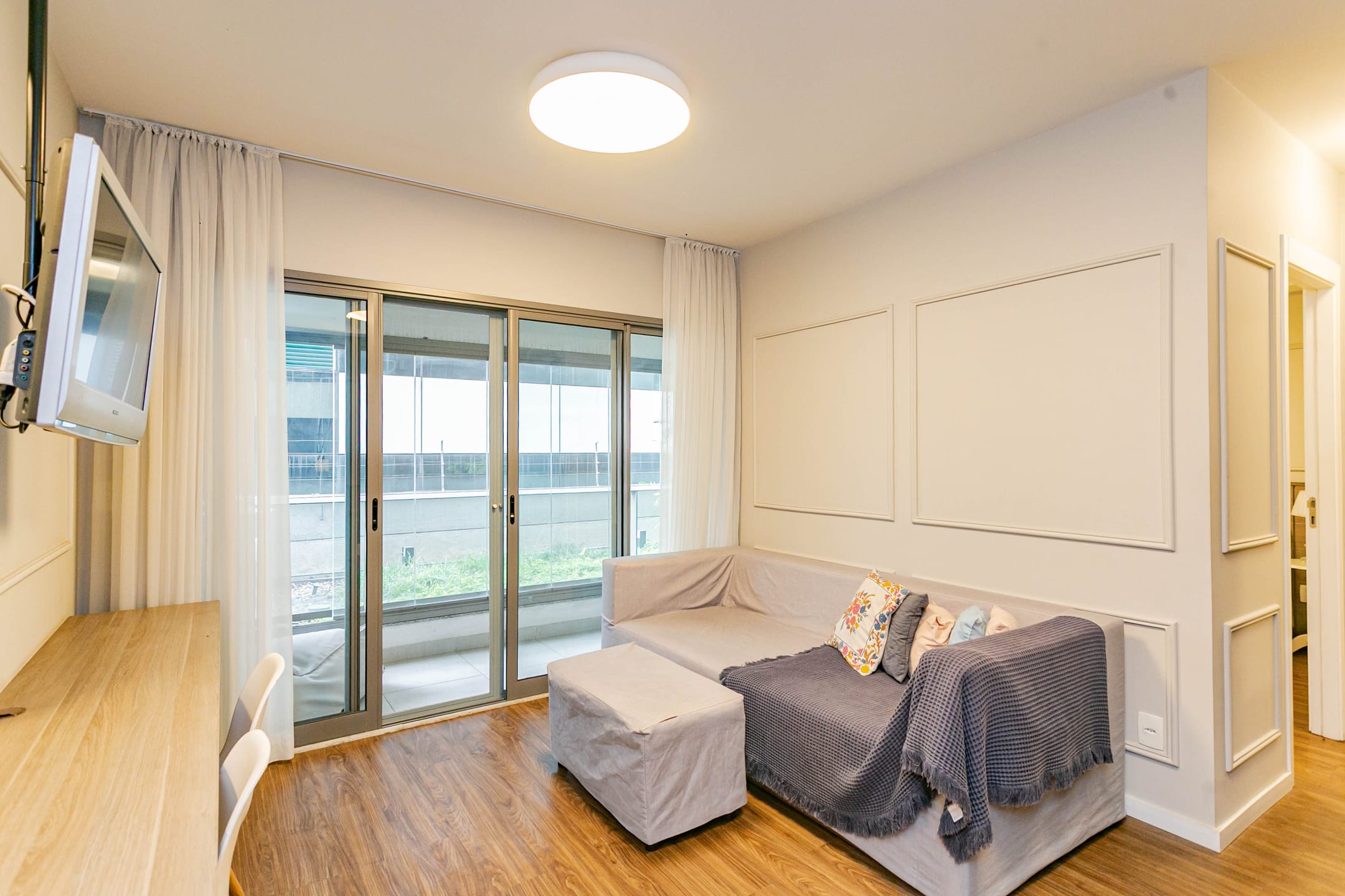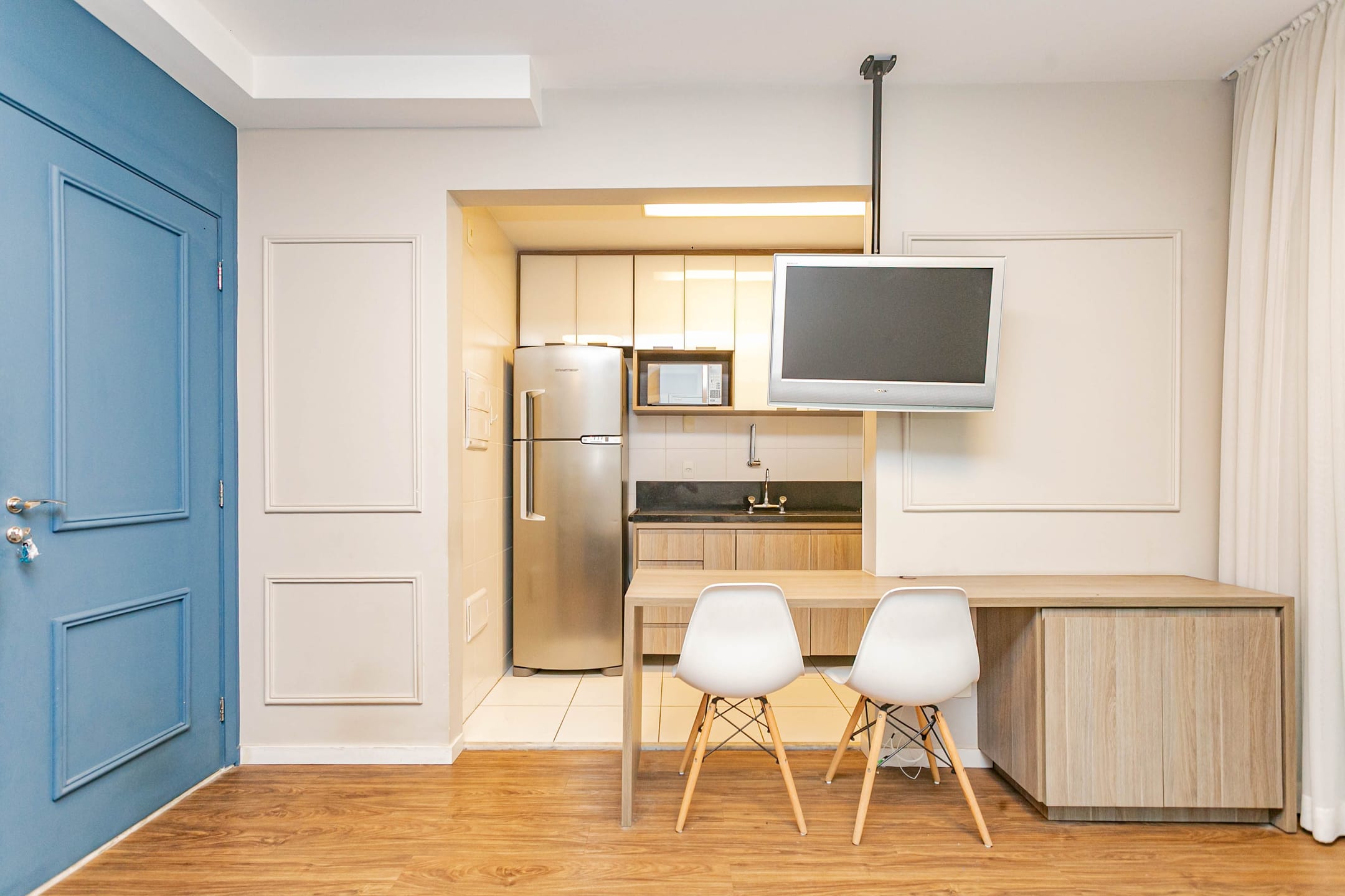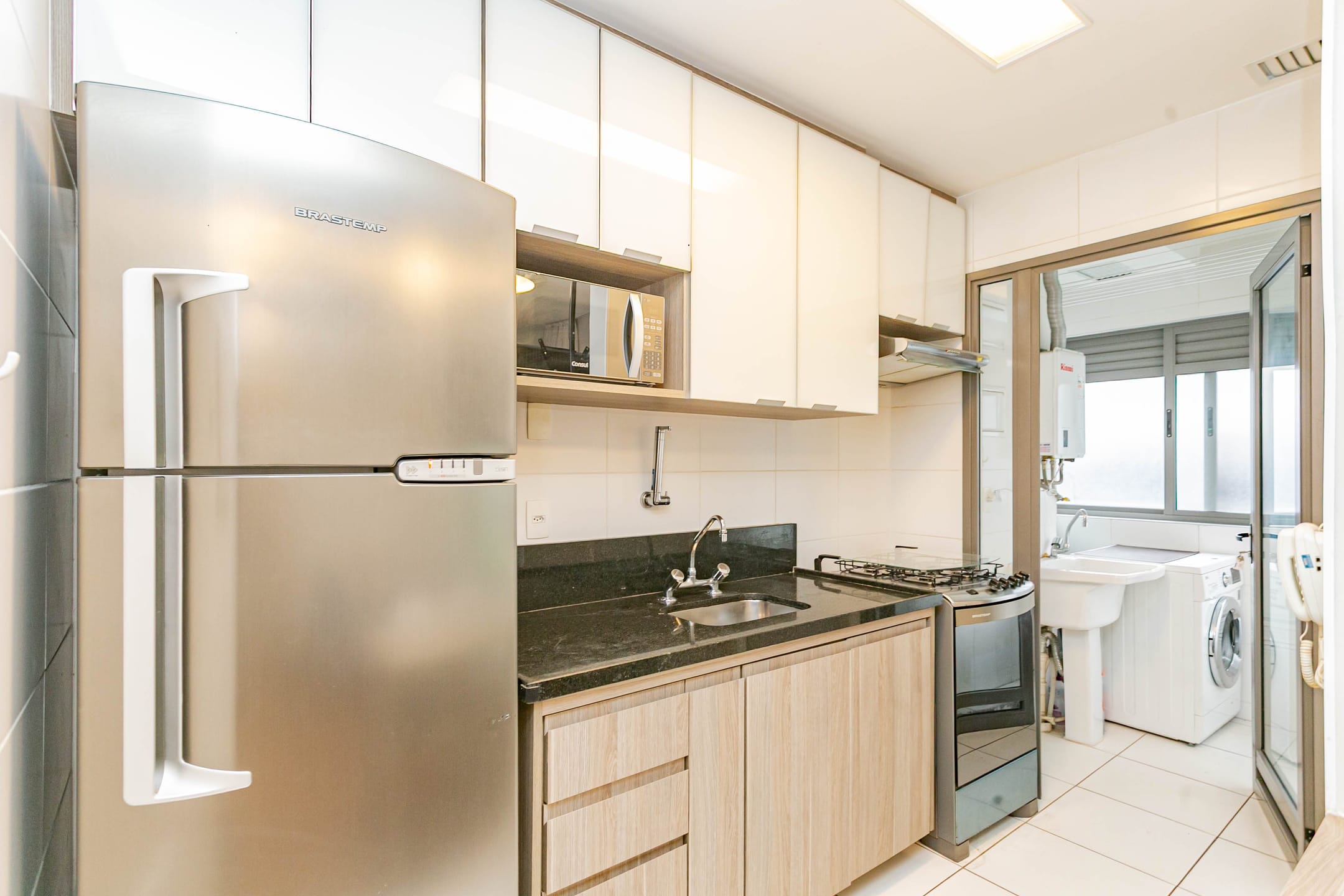 Conta com 1 dormitório bem confortável, cozinha integrada à sala, banheiro e lavanderia, além de uma extensa varanda com envidraçamento, que garante silêncio e muita luz natural, com vista para as áreas verdes do condomínio.