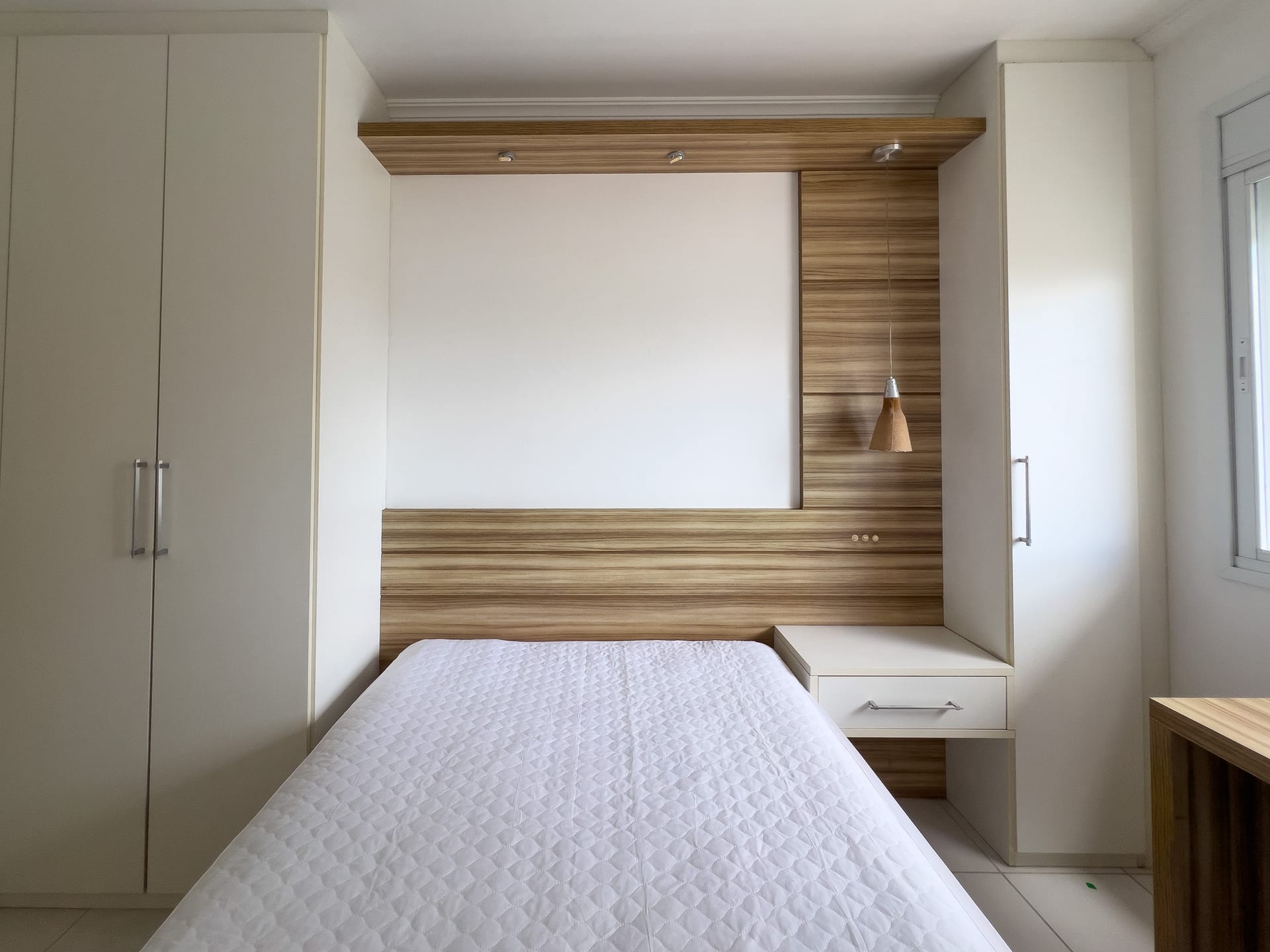 Unidade mobiliada pronto pra morar, com aquecedor de água e ar condicionado no quarto. Sol da tarde.