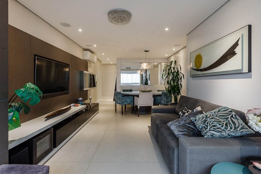 Amplo living com sala de jantar, sala de estar e sacada integradas. A cozinha e área de serviço possuem armários planejados.