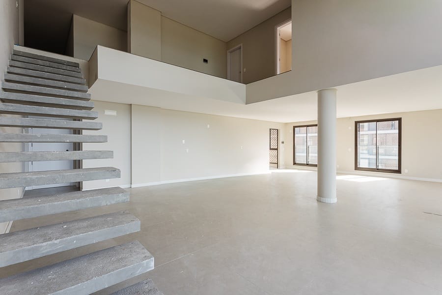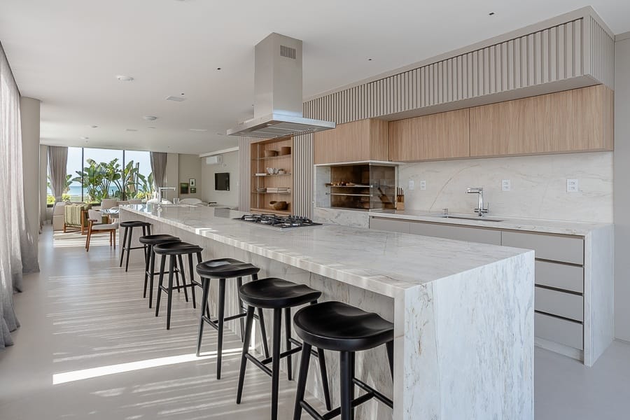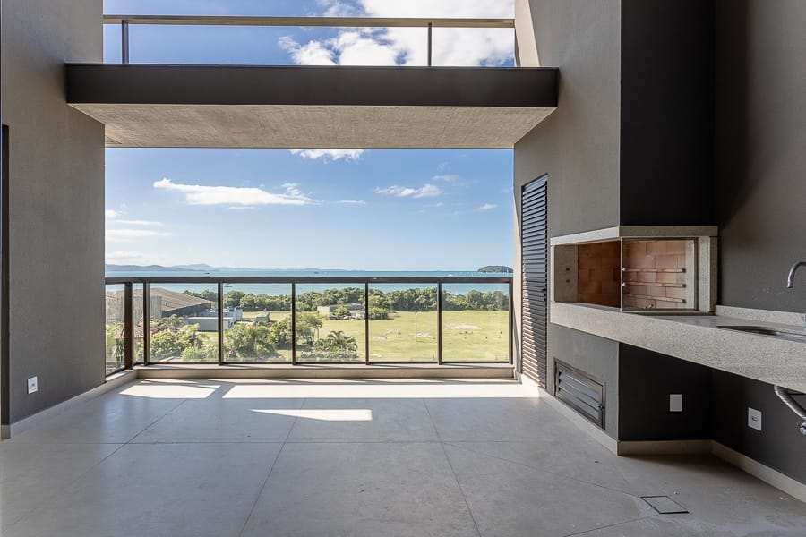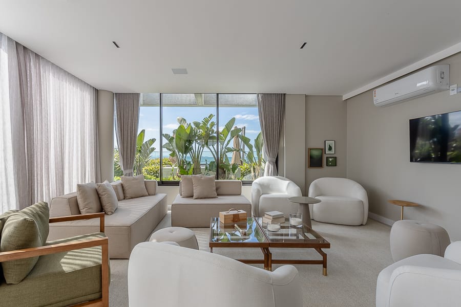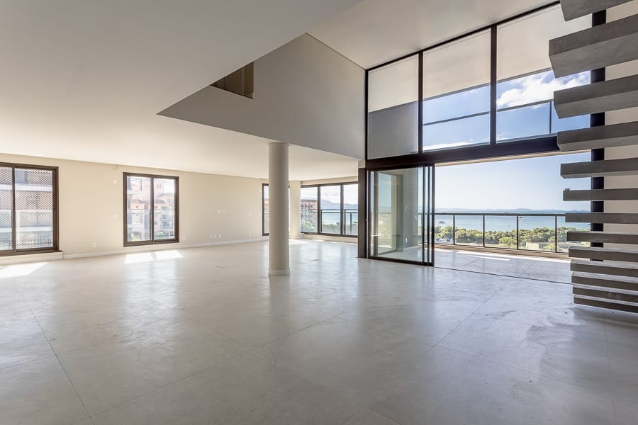 O apartamento é duplex frente mar, possui três suítes, lavabo, sala e cozinha integrada.