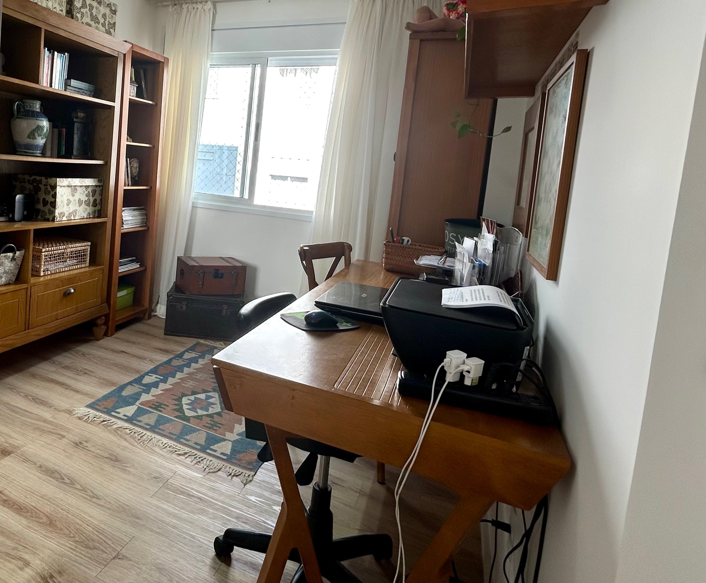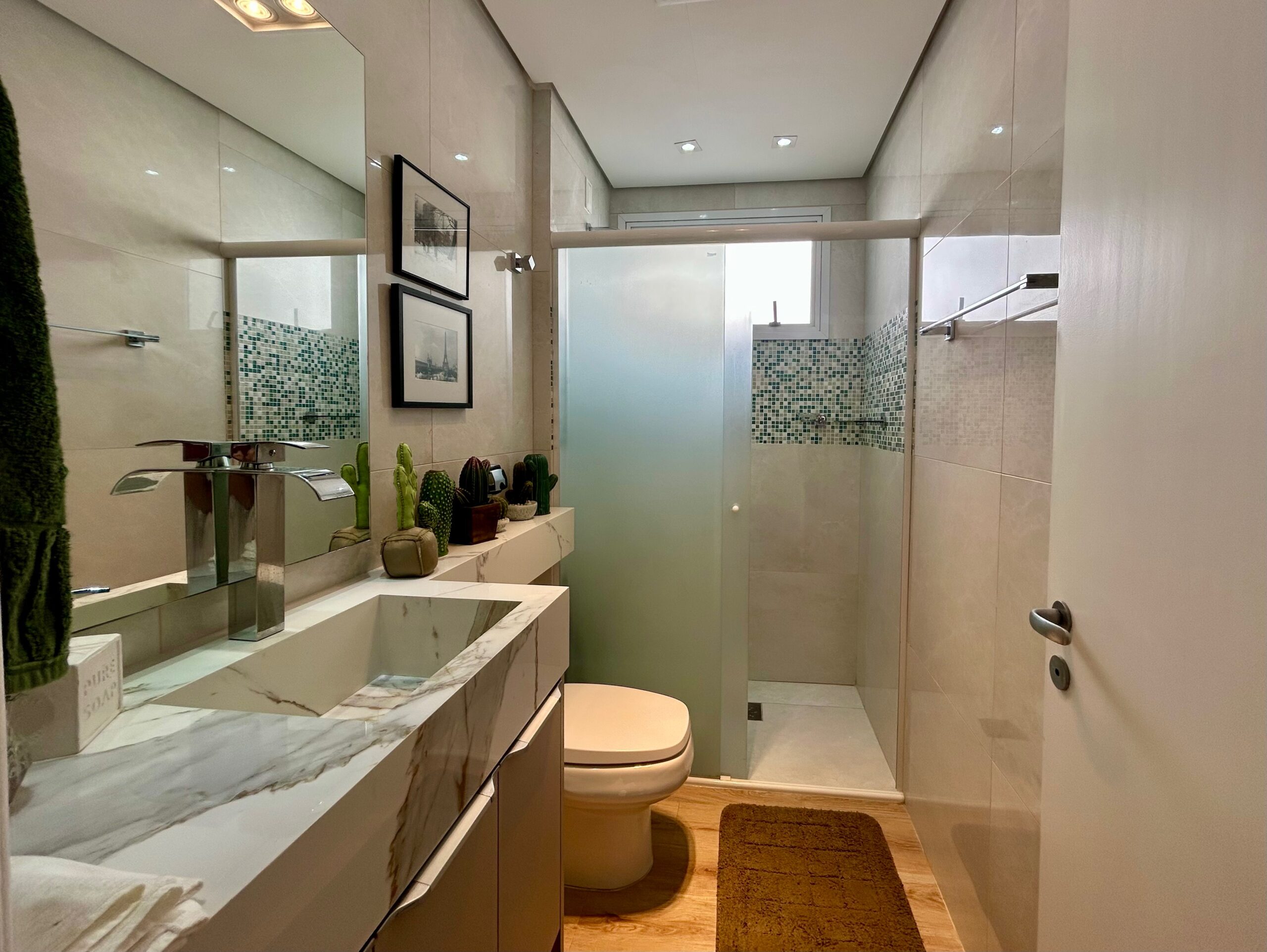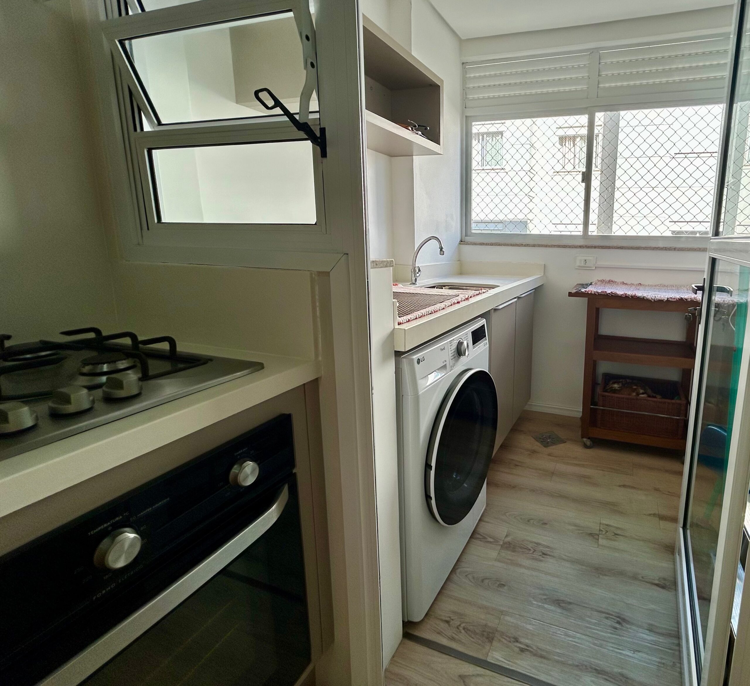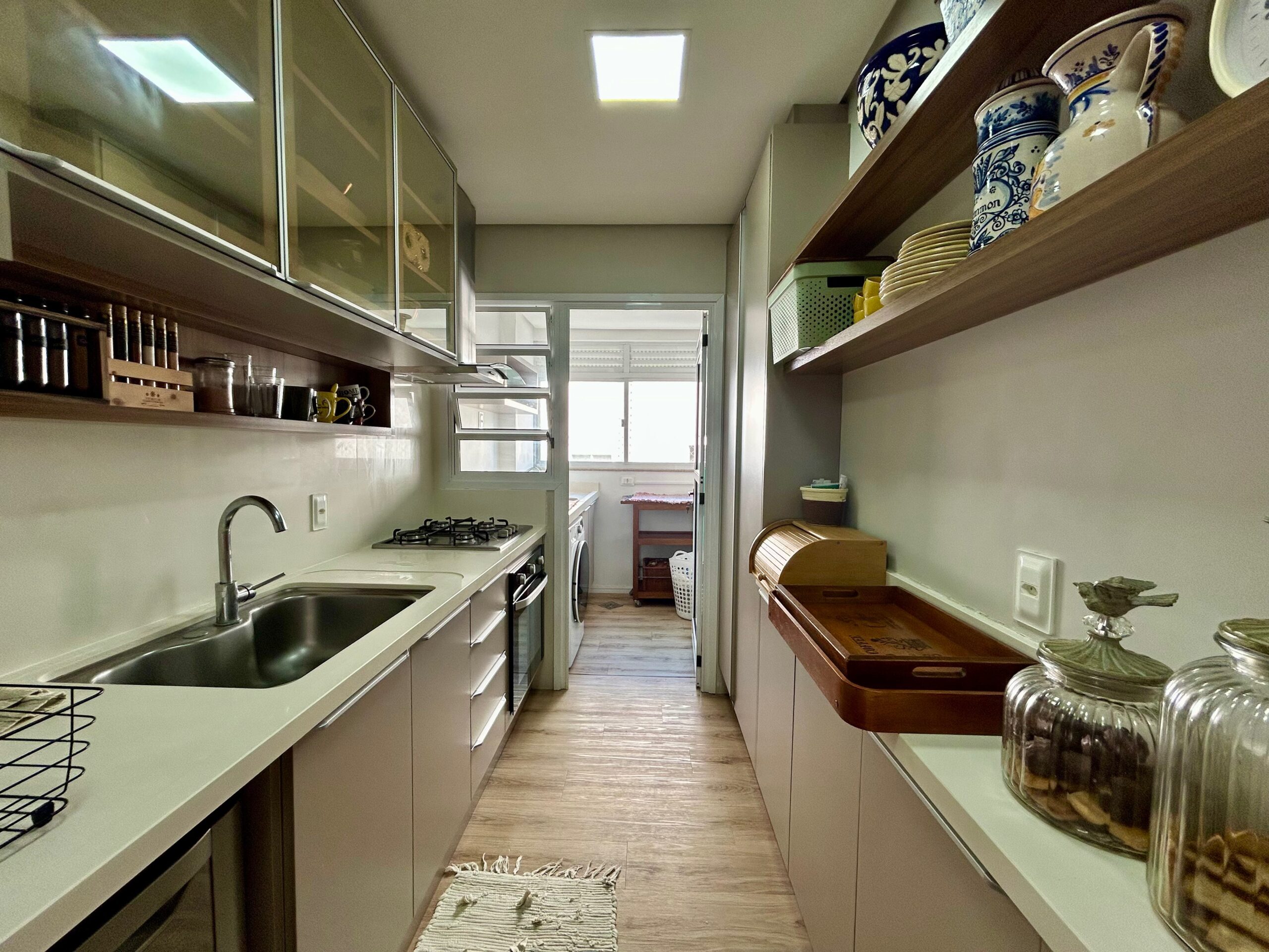 Apartamento à venda de três dormitórios, sendo uma suíte, lavabo, banheiro social, sala de estar, jantar, cozinha e área de serviço. Conta com sacada com churrasqueira, uma vaga de garagem estendida e depósito.
