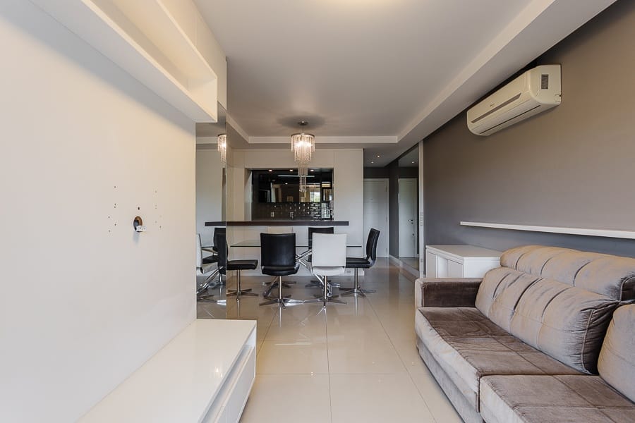 Apartamento com dois dormitórios, um banheiro, sala de estar e jantar que se integram com a cozinha, área de serviço, sacada, uma vaga de garagem, armários planejados na cozinha e área de serviço, último andar com vista para o bairro.