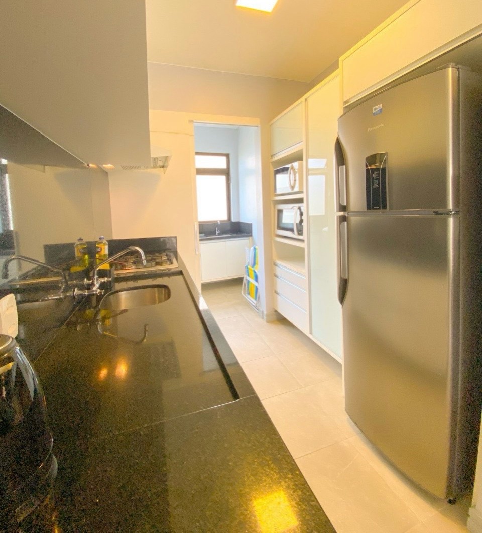 São 2 quartos, sendo 1 suíte, salas de estar e jantar integradas com a cozinha, sacada fechada com churrasqueira à carvão e vista lateral para o mar, 1 vaga de garagem coberta. Sem elevador, com 1 lance de escada.