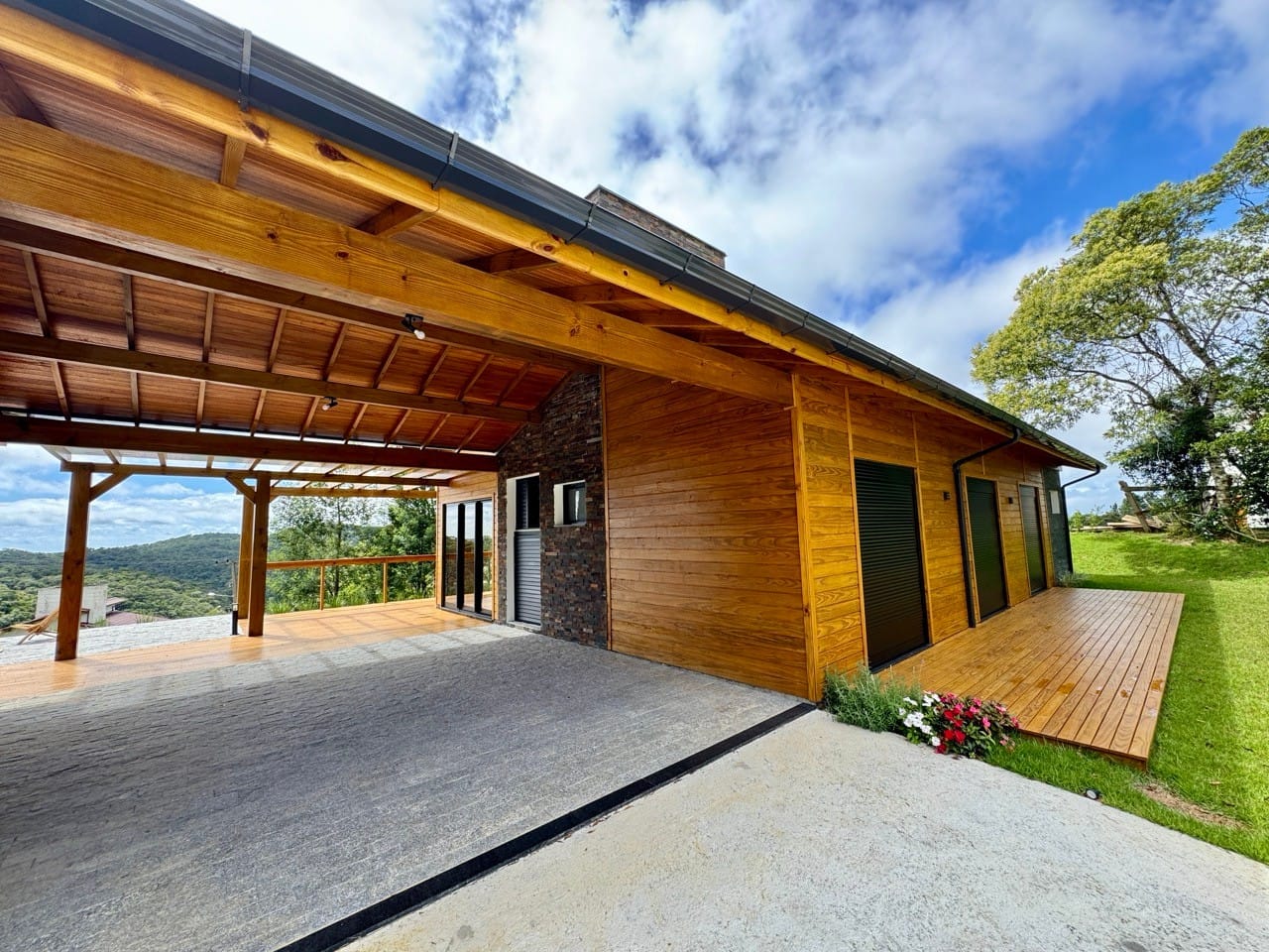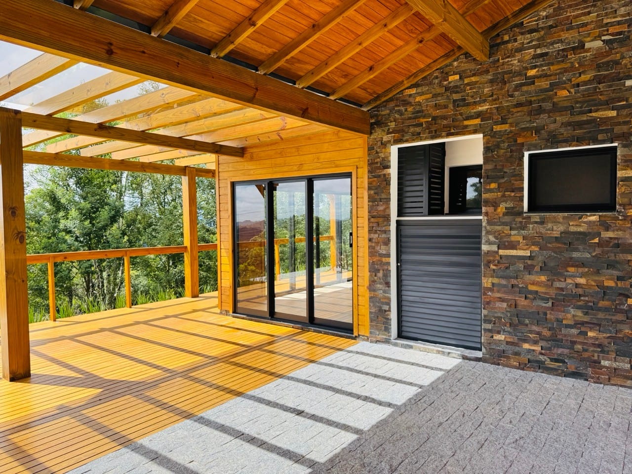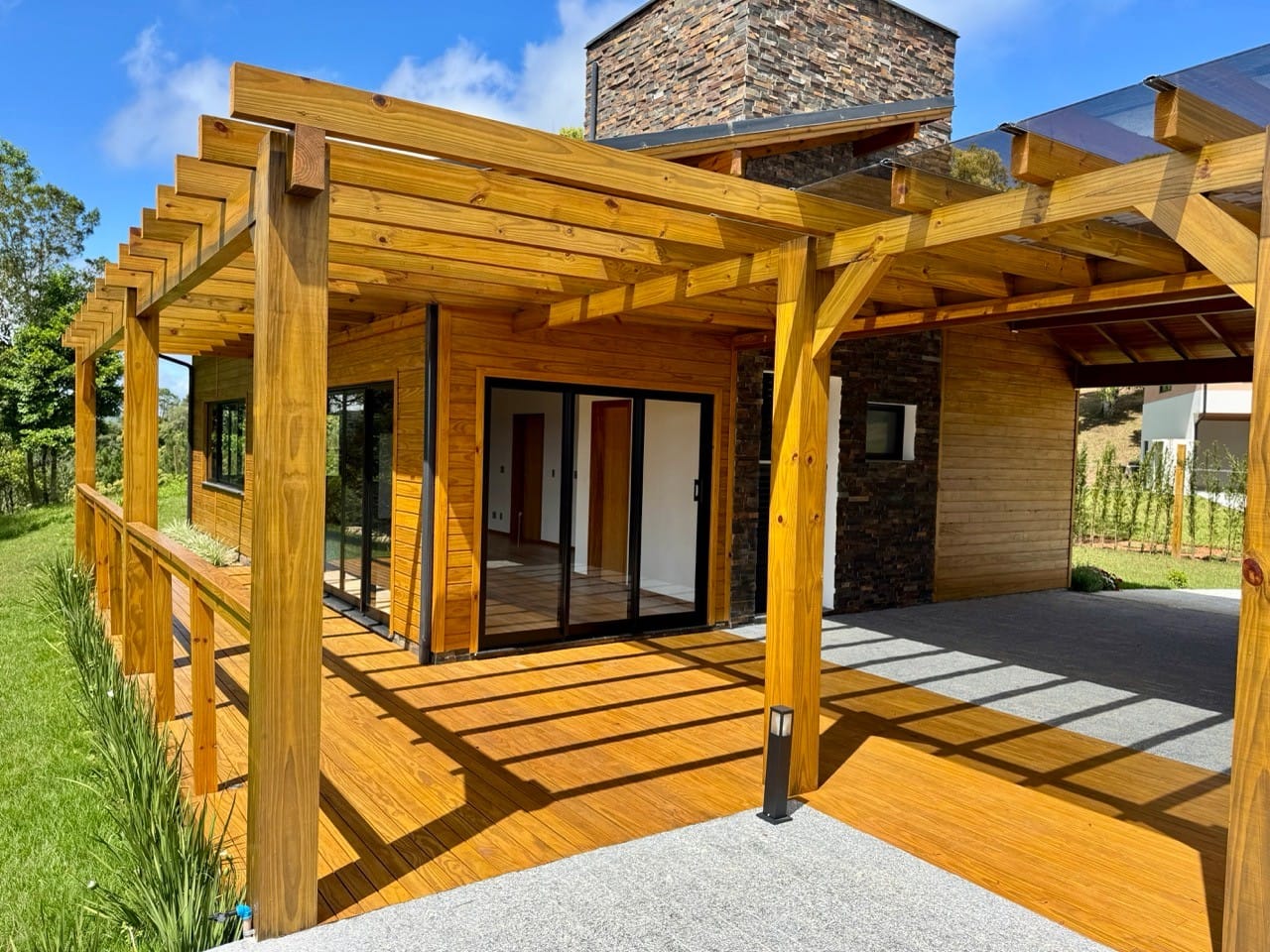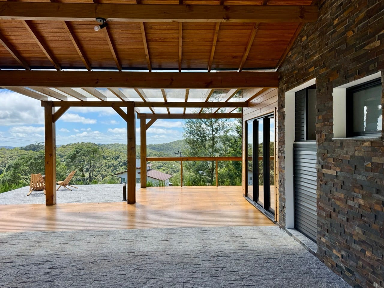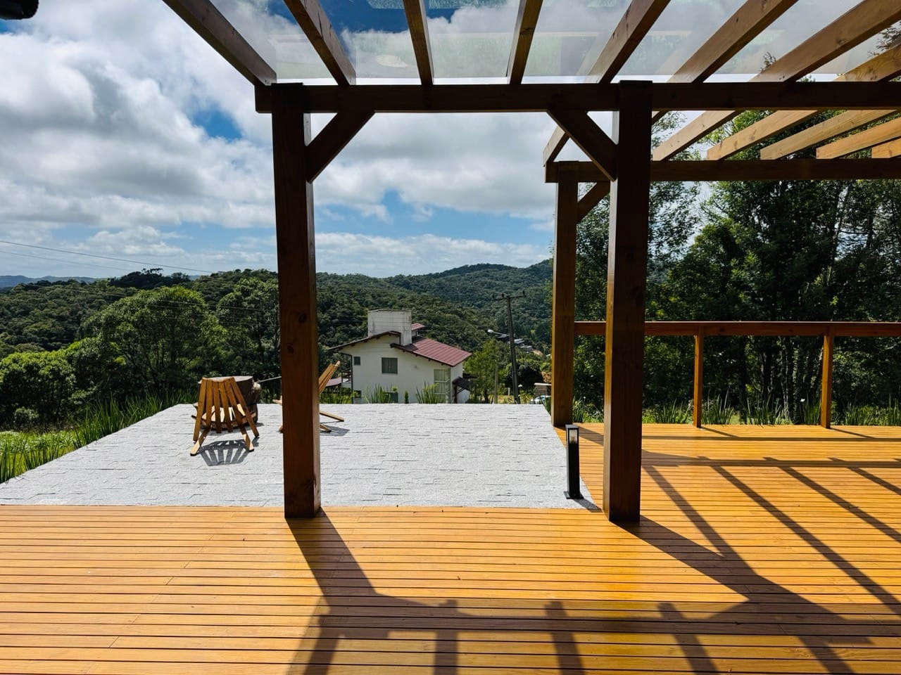 Ambiente externo com espaço fogo, deck frontal suspenso com pergolado e cercado por natureza.