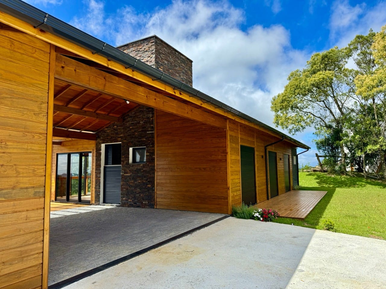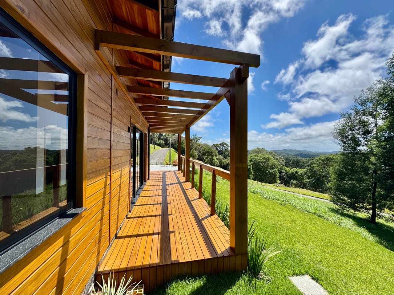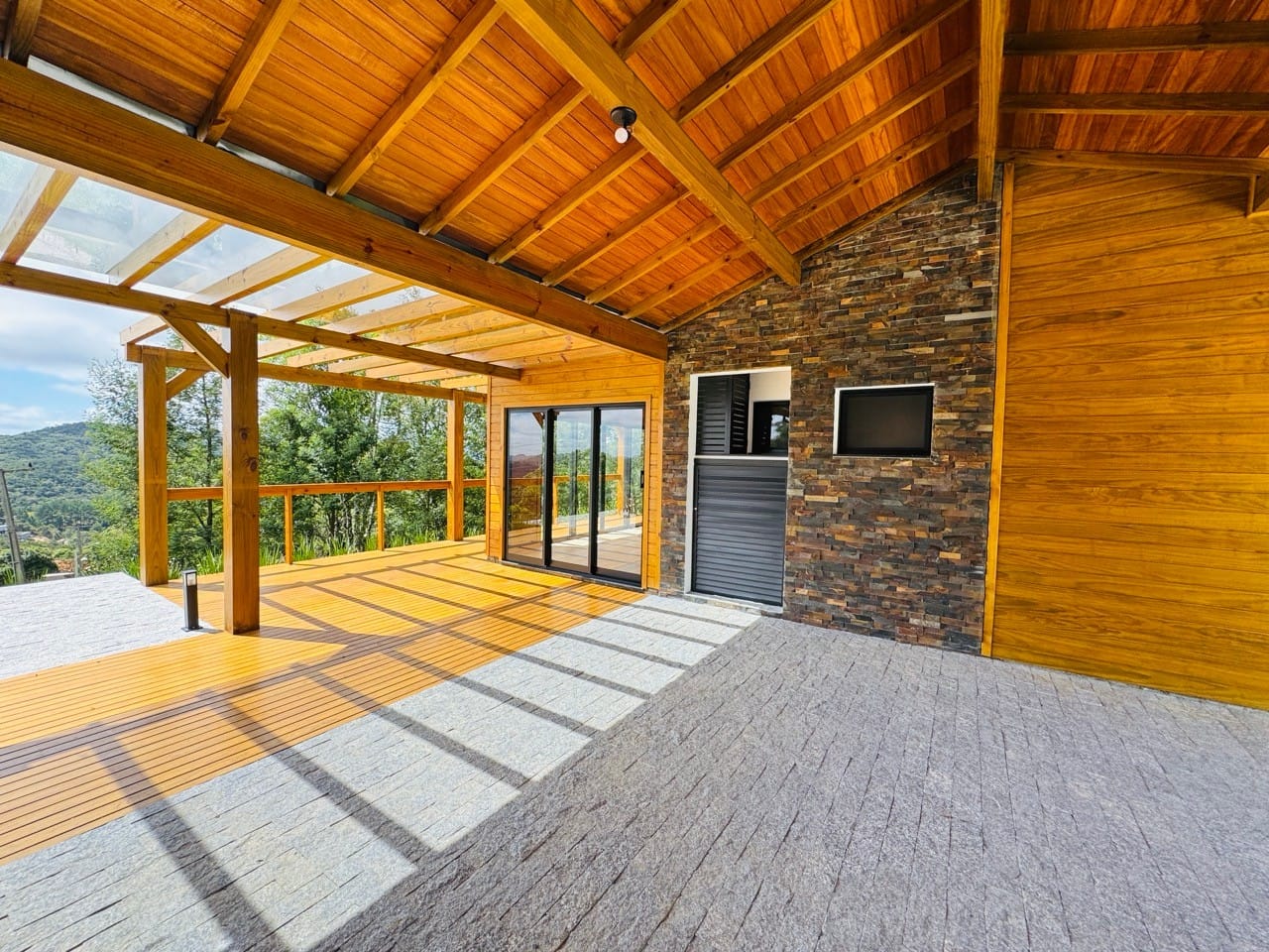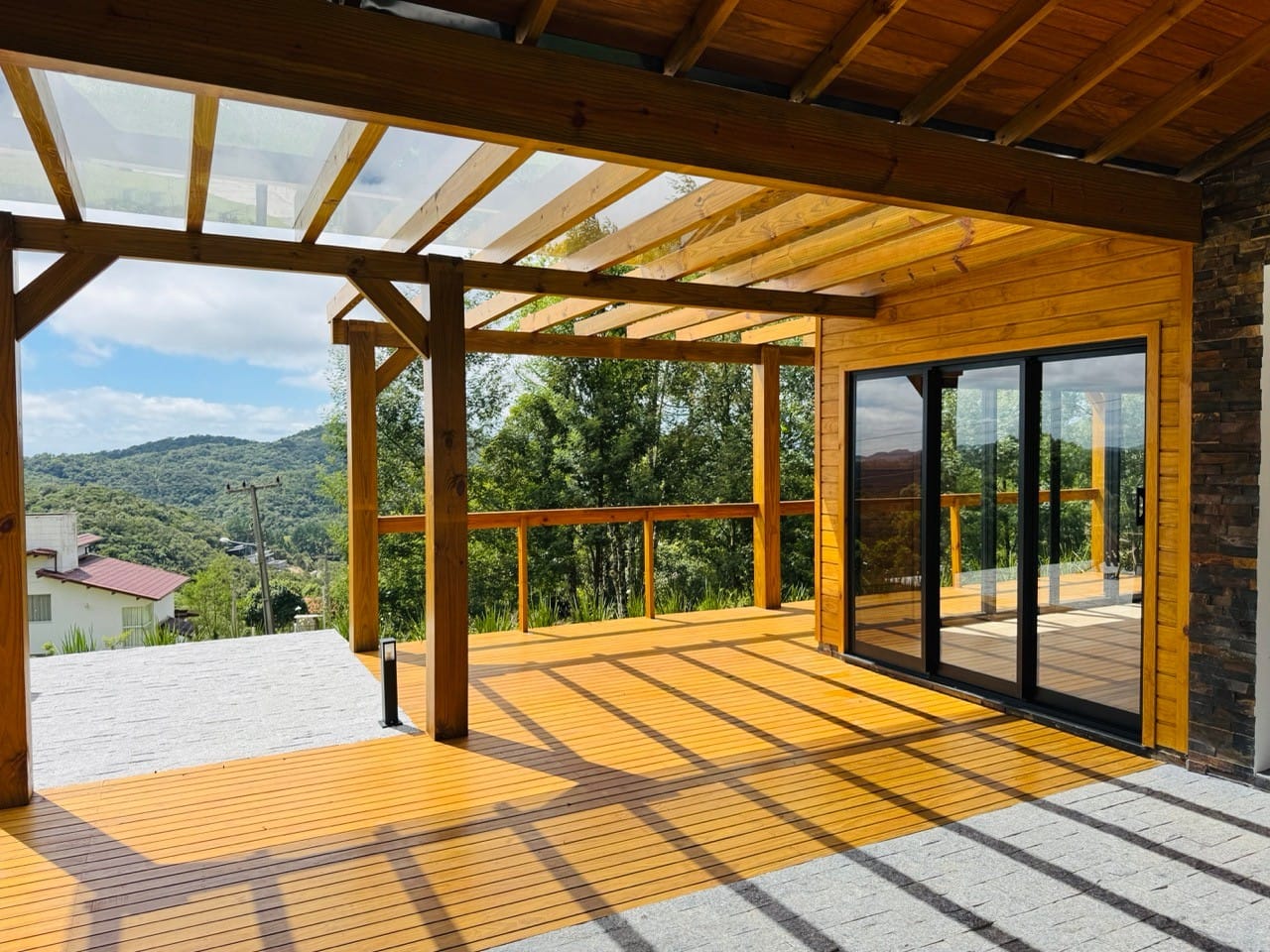 Ambiente externo com espaço fogo, deck frontal suspenso com pergolado e cercado por natureza.