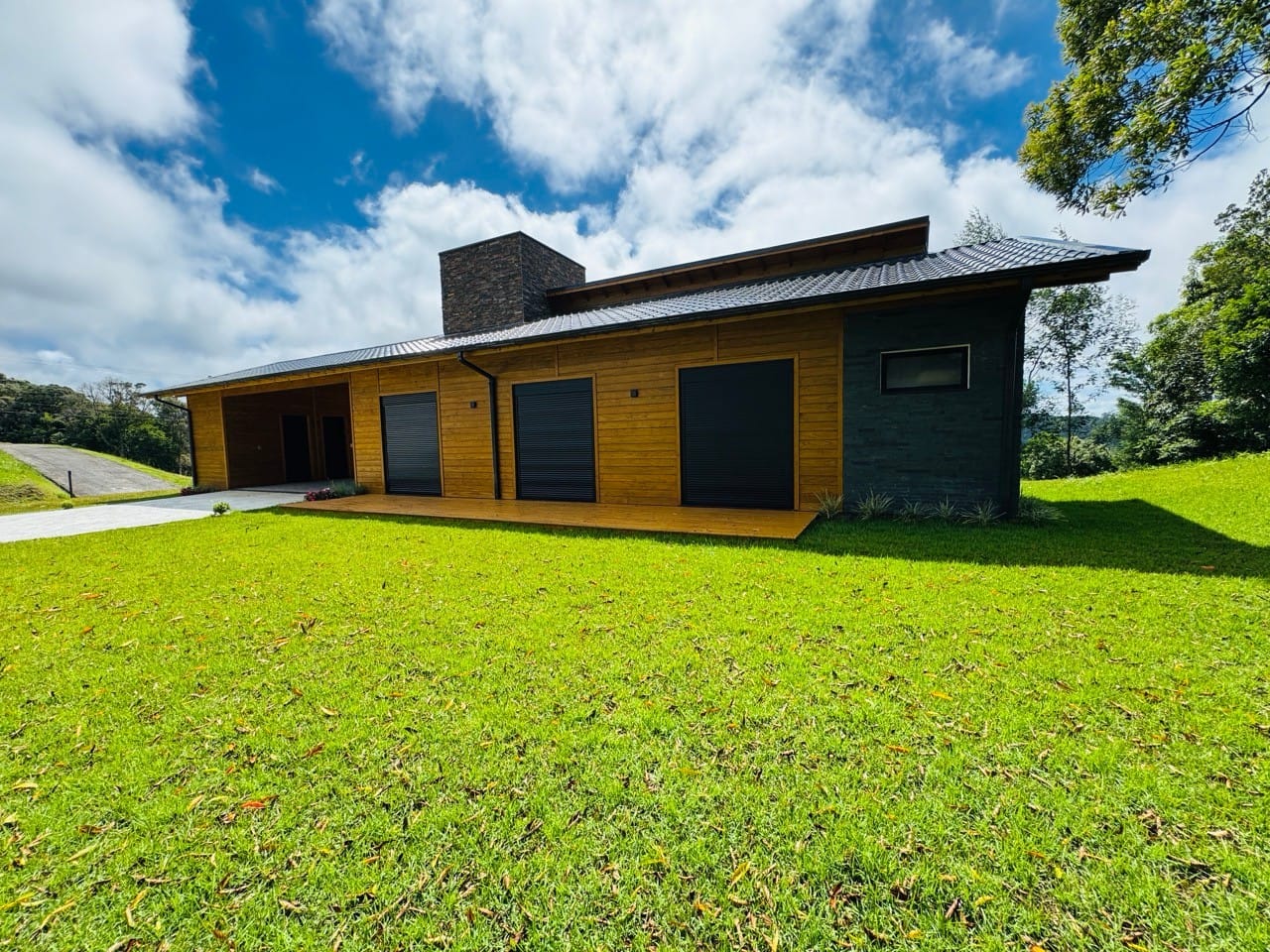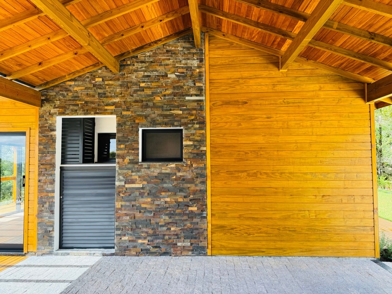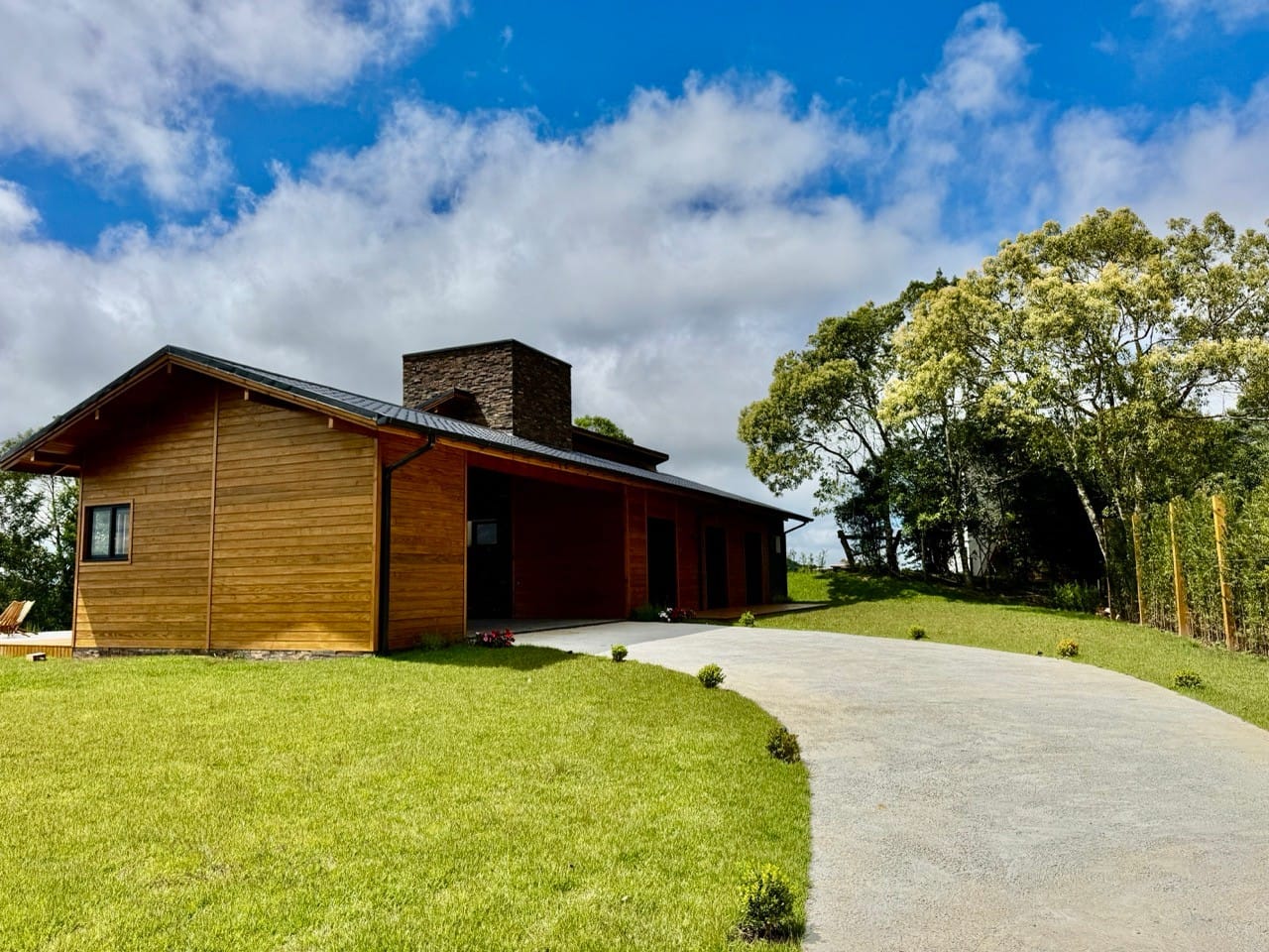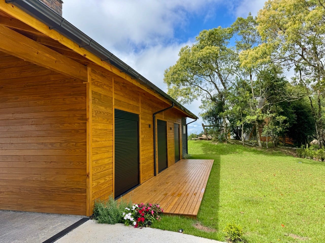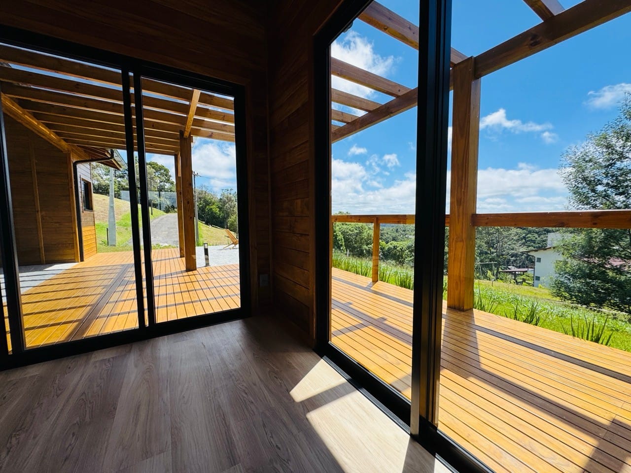 Ambiente externo com espaço fogo, deck frontal suspenso com pergolado e cercado por natureza.