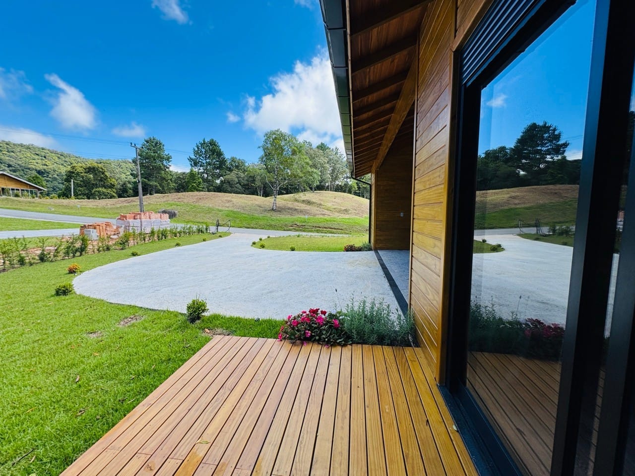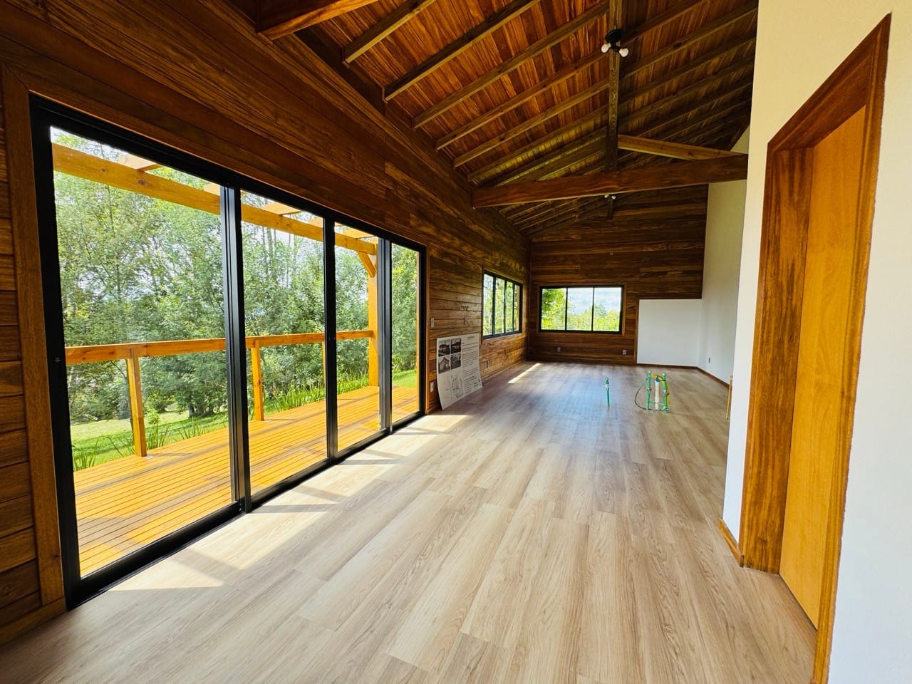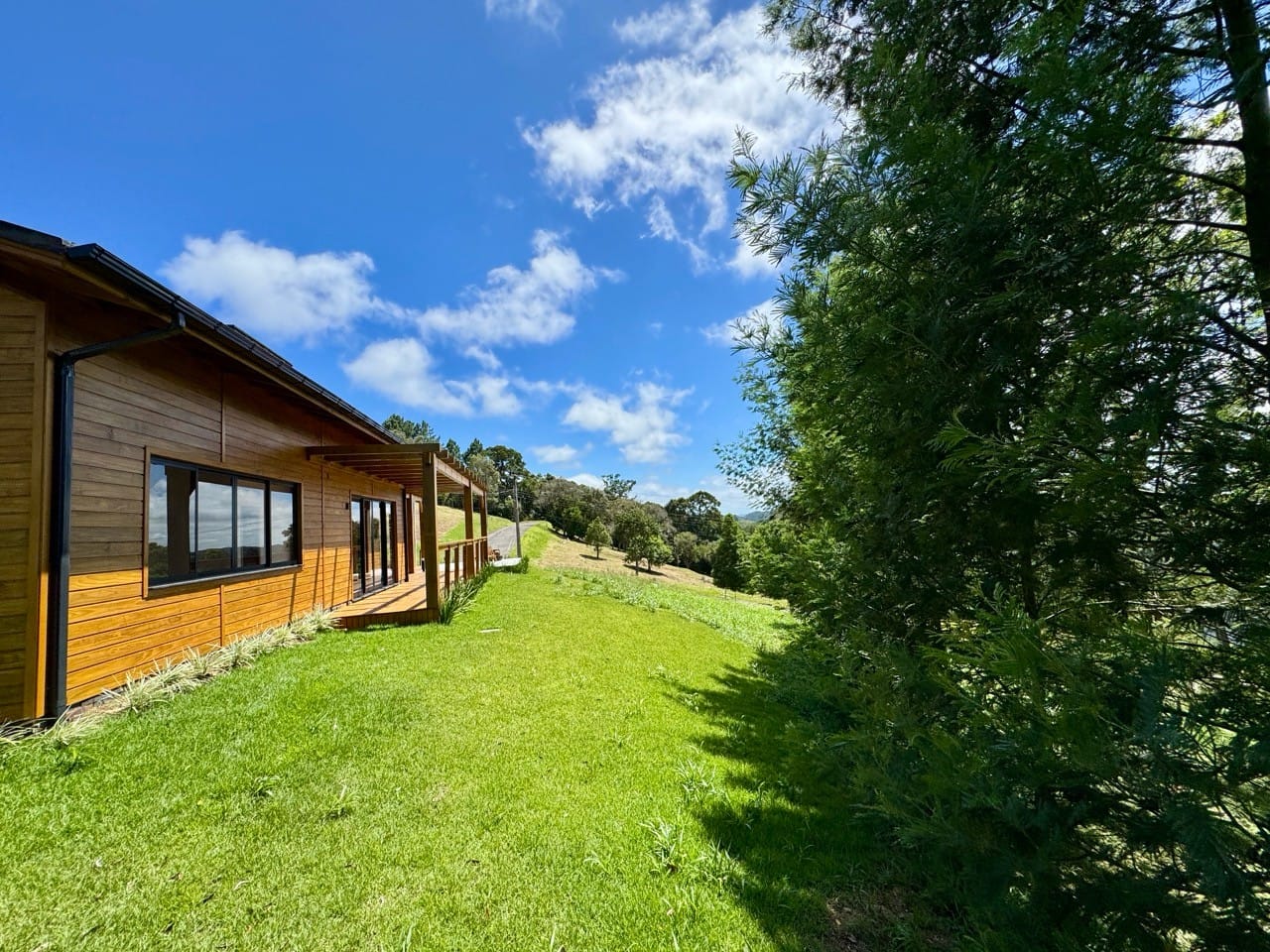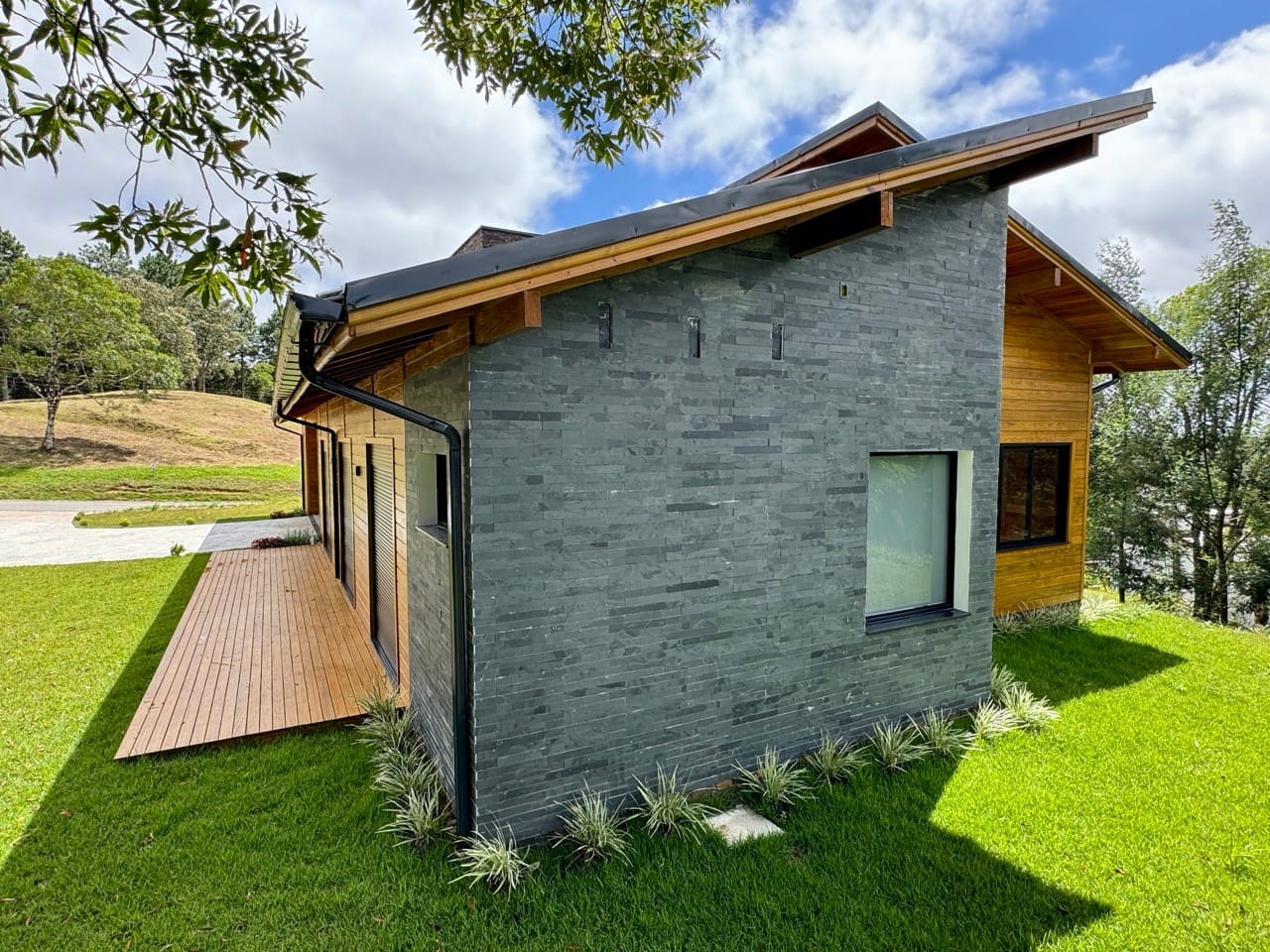 Ambiente externo com espaço fogo, deck frontal suspenso com pergolado e cercado por natureza.