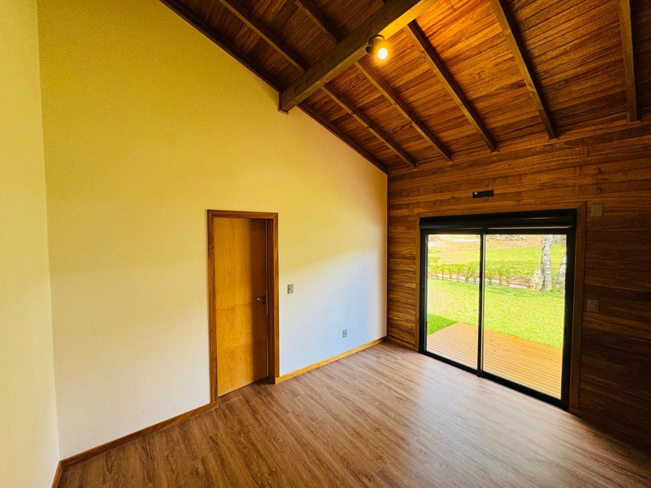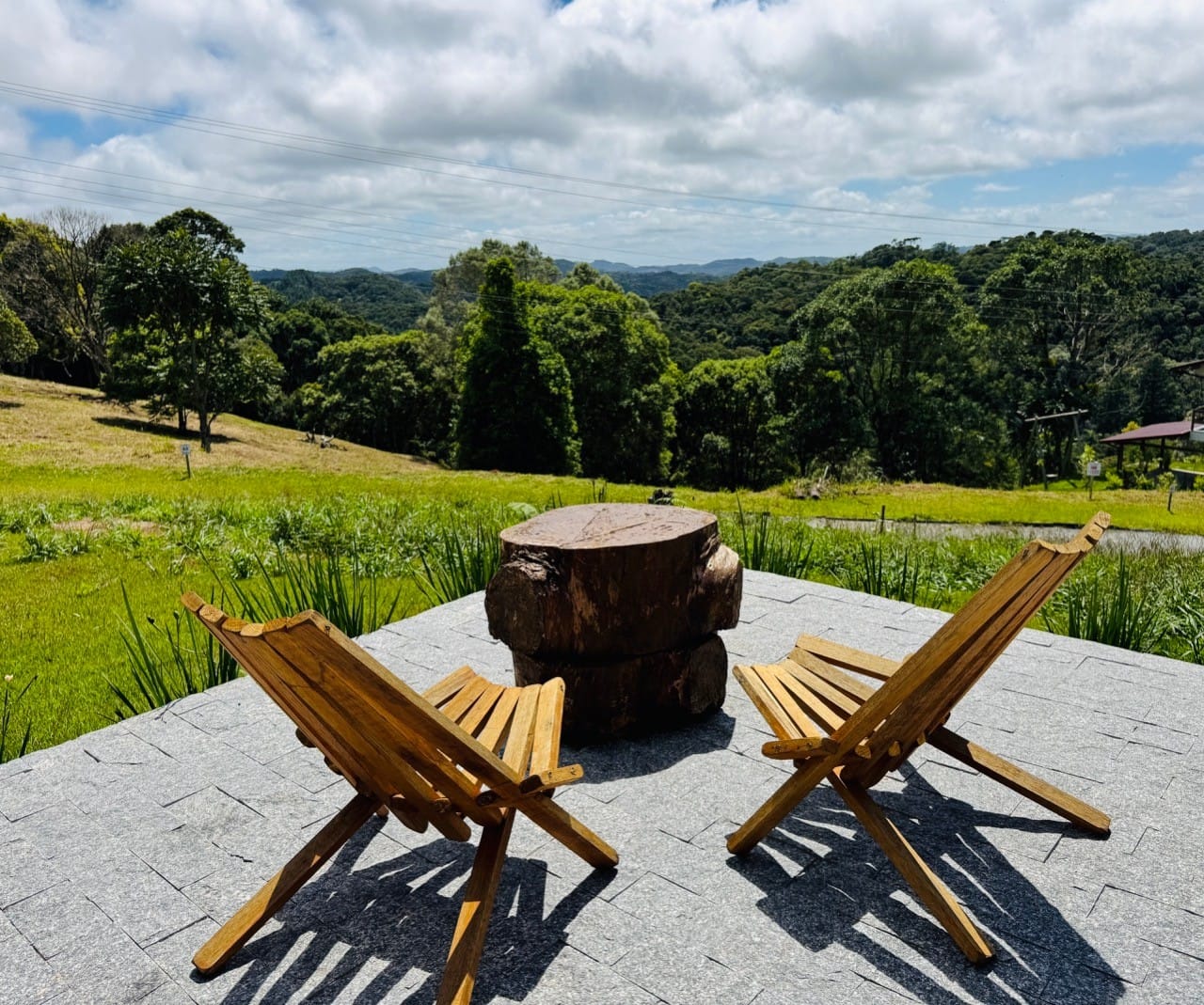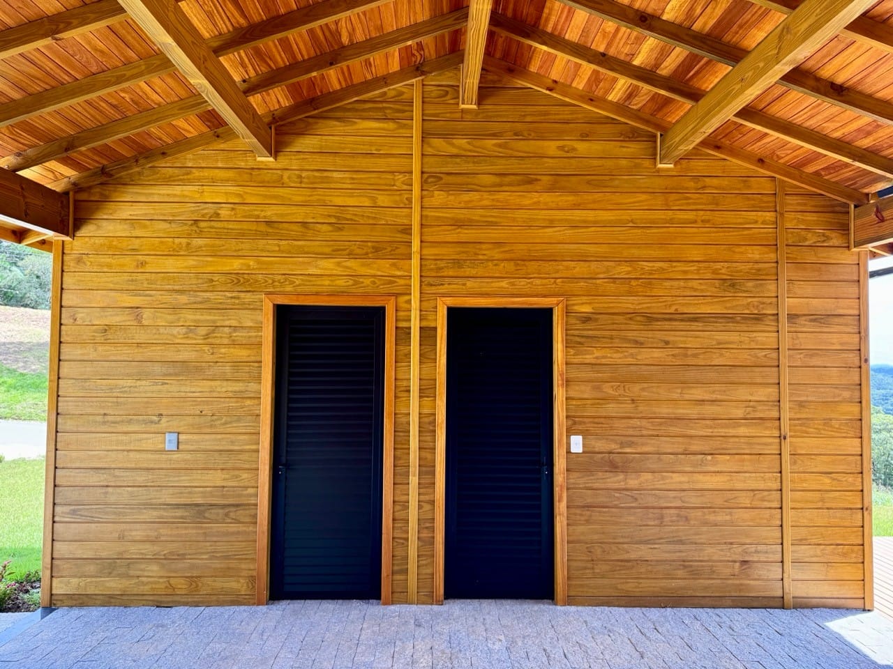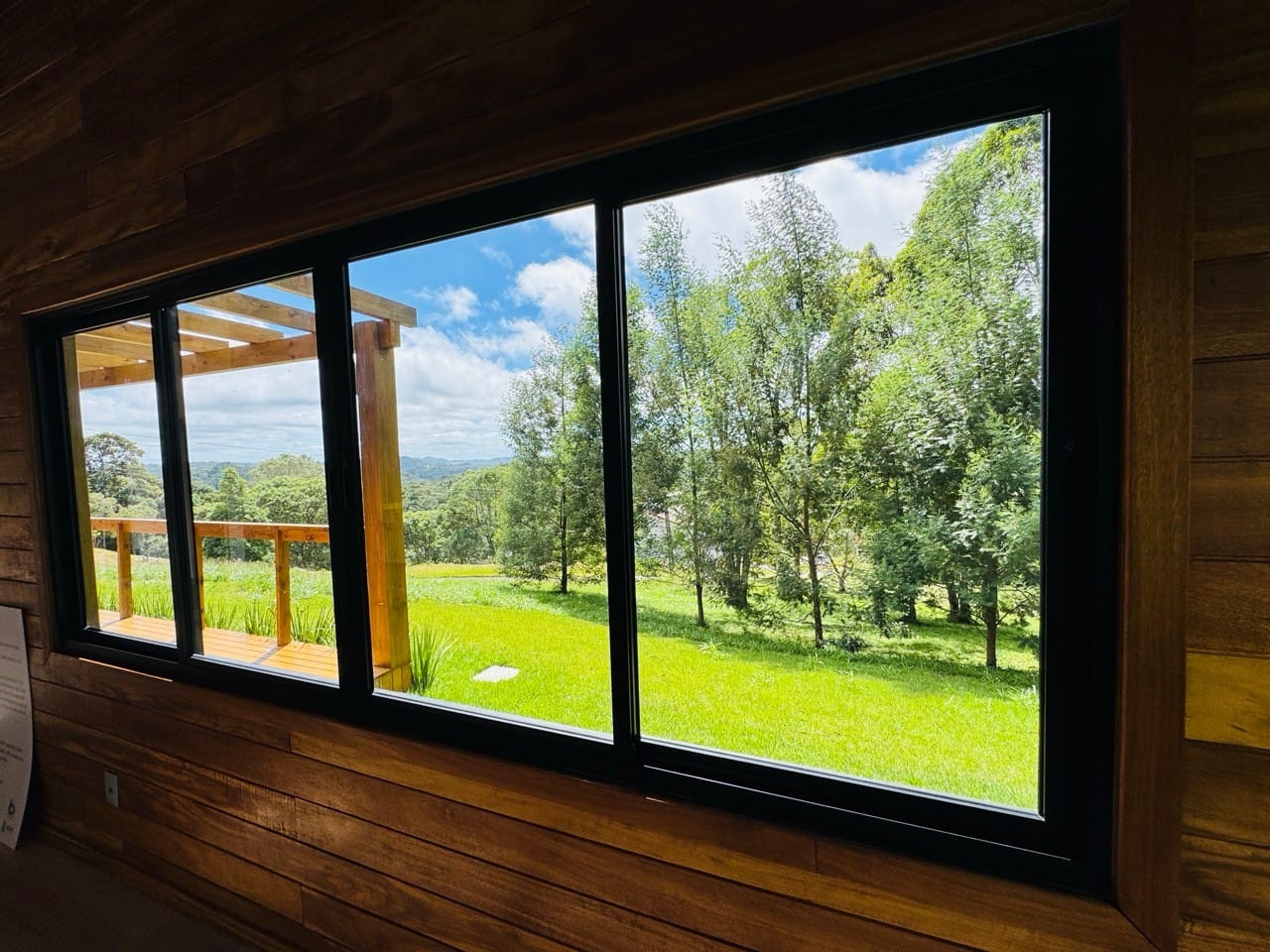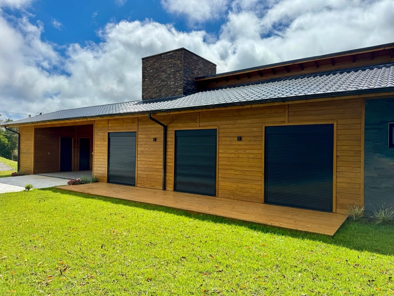 Ambiente externo com espaço fogo, deck frontal suspenso com pergolado e cercado por natureza.