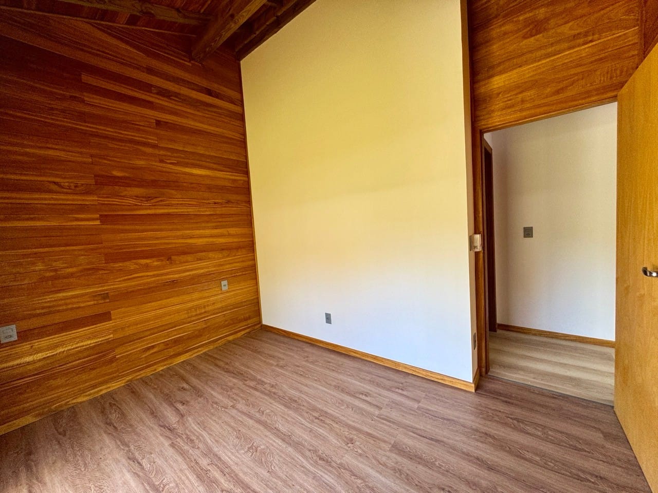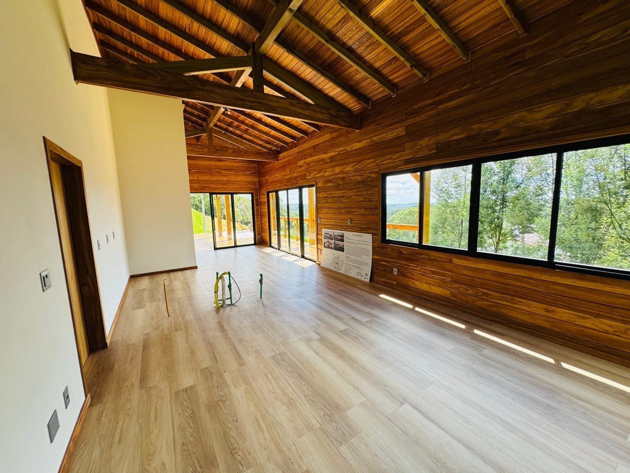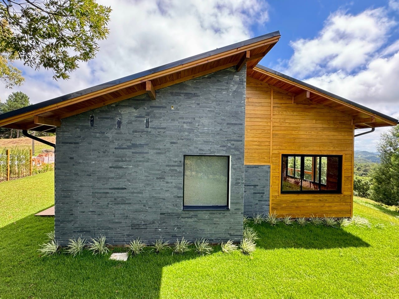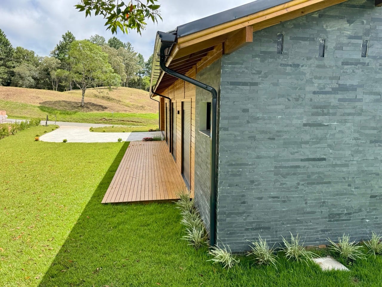 Casa à venda em Rancho Queimado. Situada em condomínio fechado e pavimentado localizado estrategicamente a 03 minutos do charmoso Centrinho de Rancho Queimado, a Casa de Serra é mista e feita com paredes duplas em todos os ambientes gerando conforto térmico e acústico. A parte interna foi toda construída utilizando madeira nobre de lei (Sucupira Amarela).