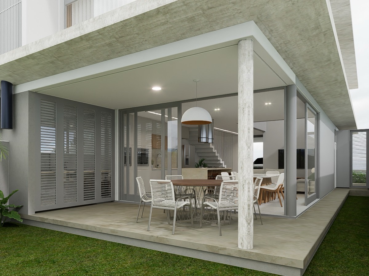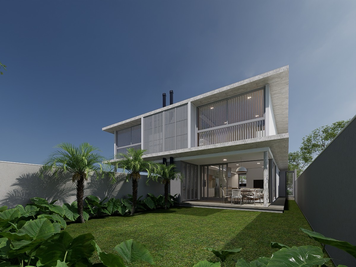 Casa geminada em construção de dois pavimentos, no andar superior, três dormitórios, sendo uma suíte com closet e sala de estar. No andar principal área social em conceito aberto com cozinha, lavanderia, lavabo, área gourmet externa com churrasqueira e jardim.