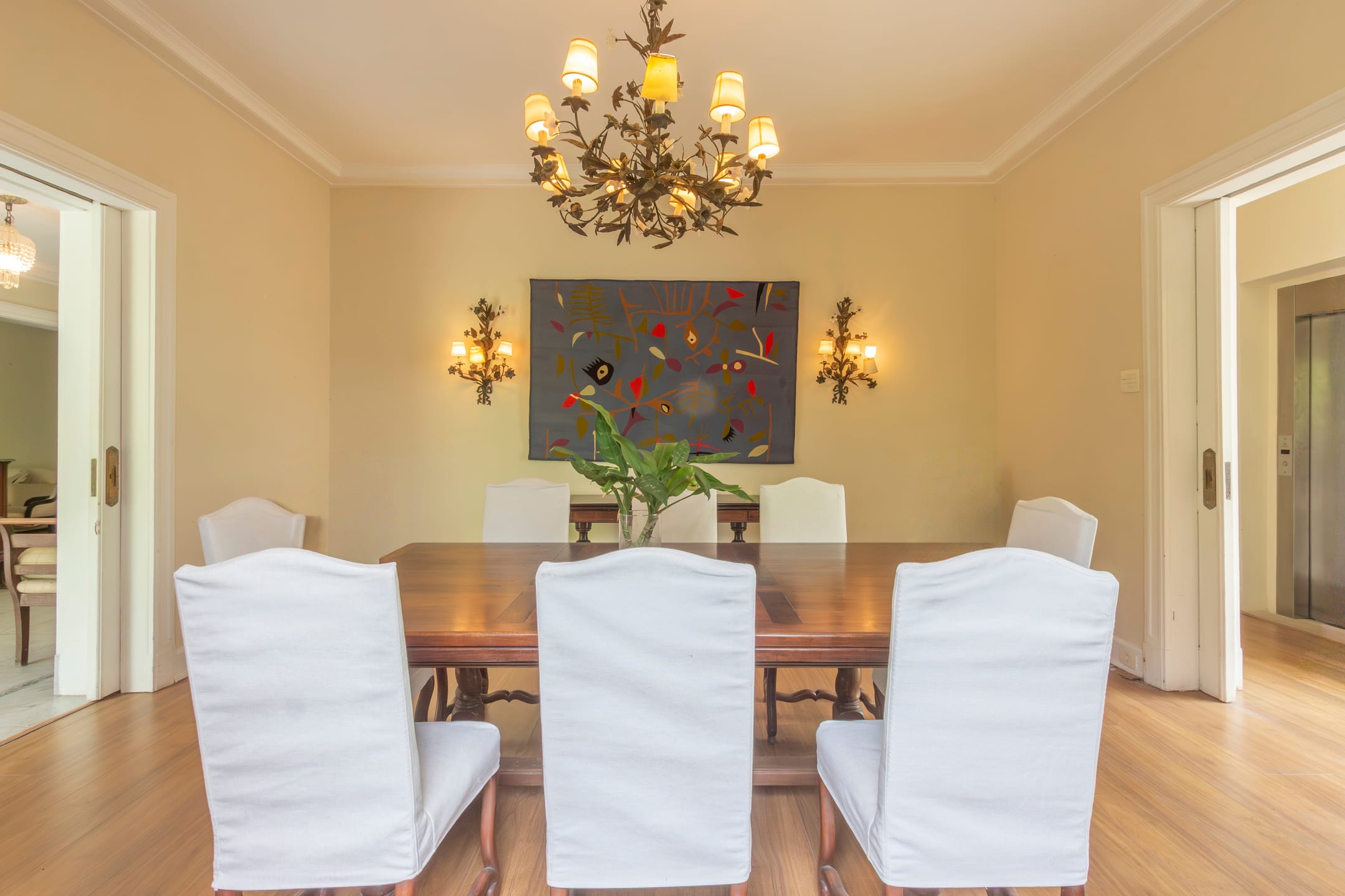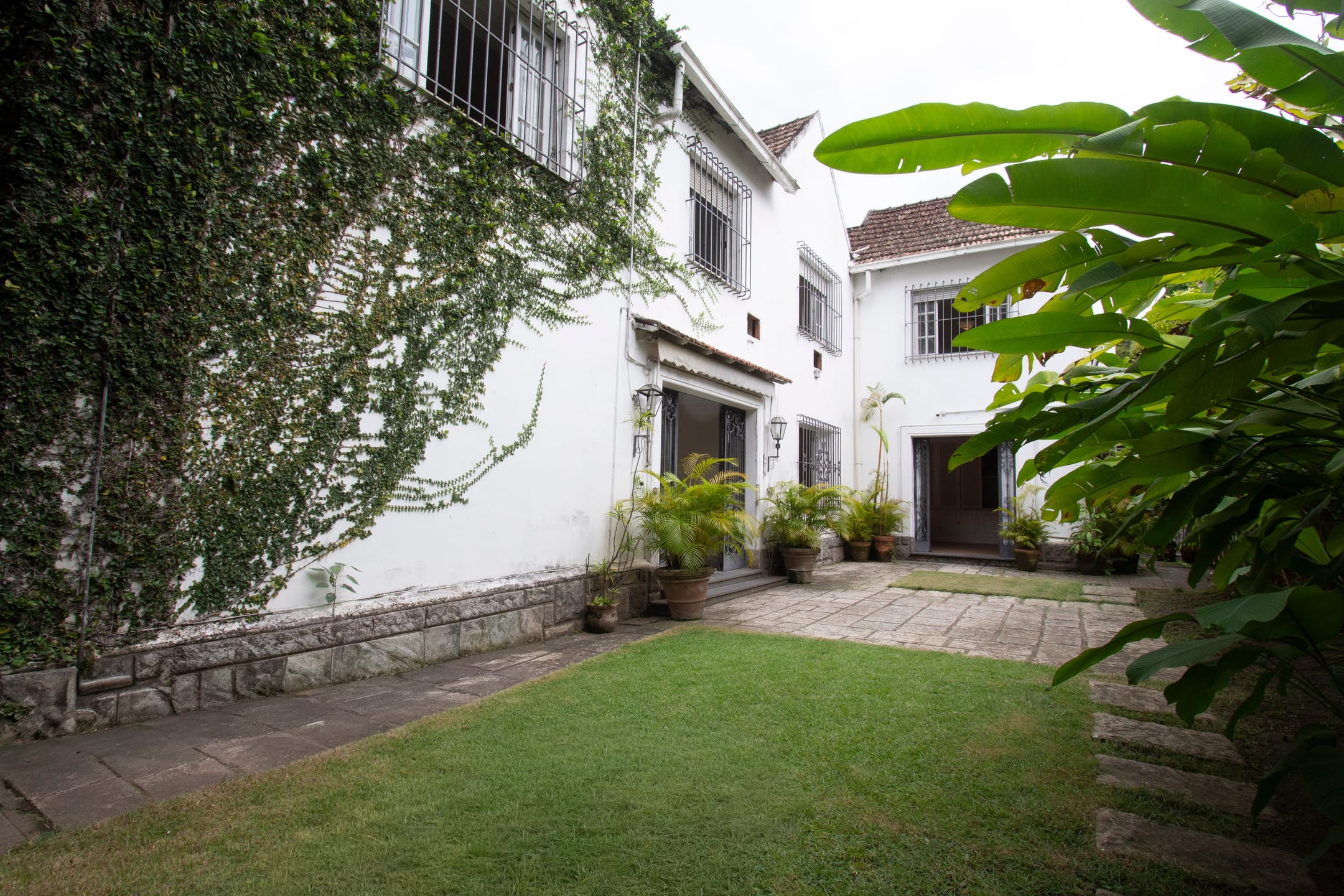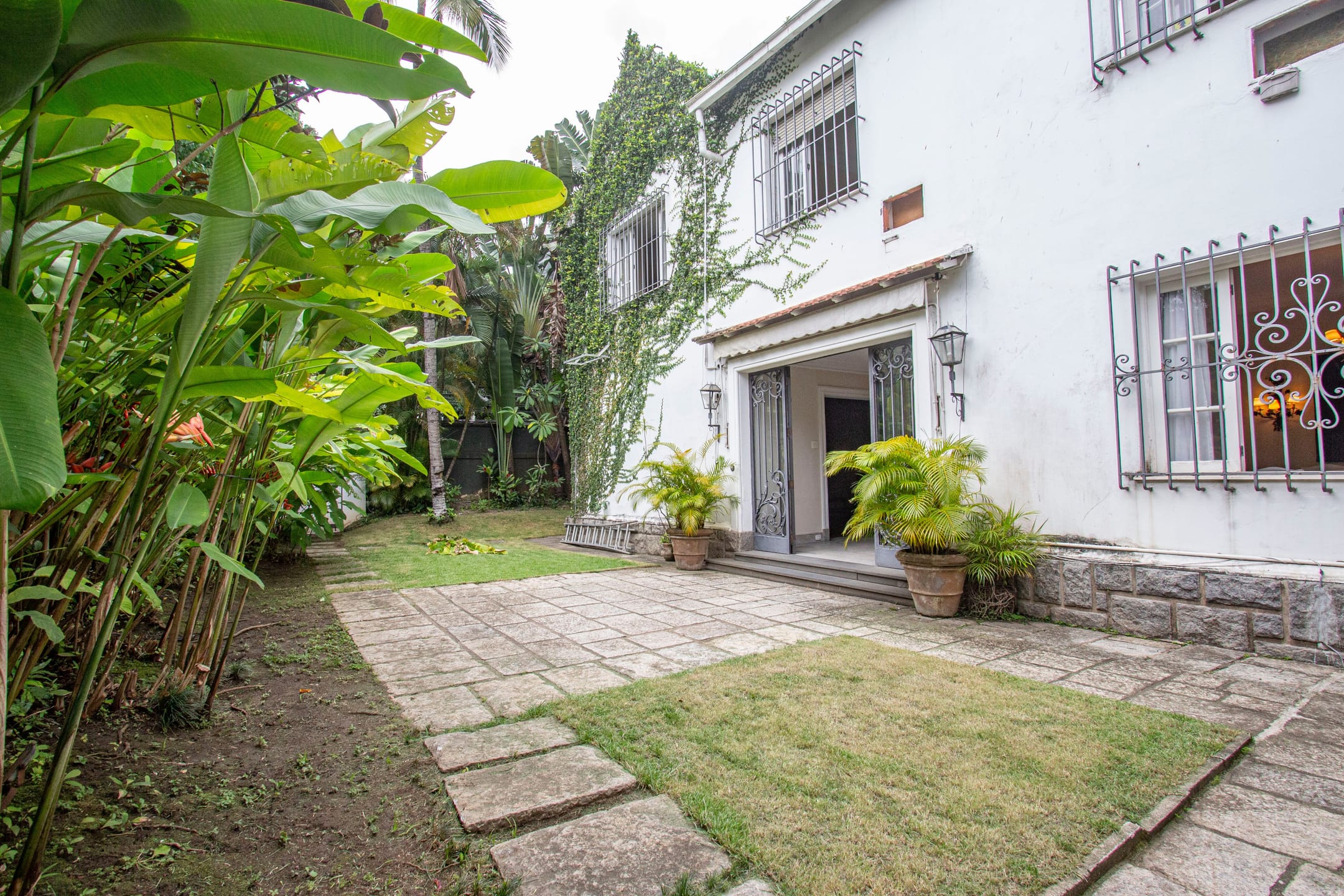 Imóvel em estilo clássico à venda no Leblon, Rio de Janeiro. A casa possui amplas salas de estar e jantar, cinco dormitórios, três banheiros sendo um lavabo, garagem para três veículos, jardim de inverno e elevador. Além disso, o lote conta com uma dependência anexa, com dois quartos, cozinha e banheiro.