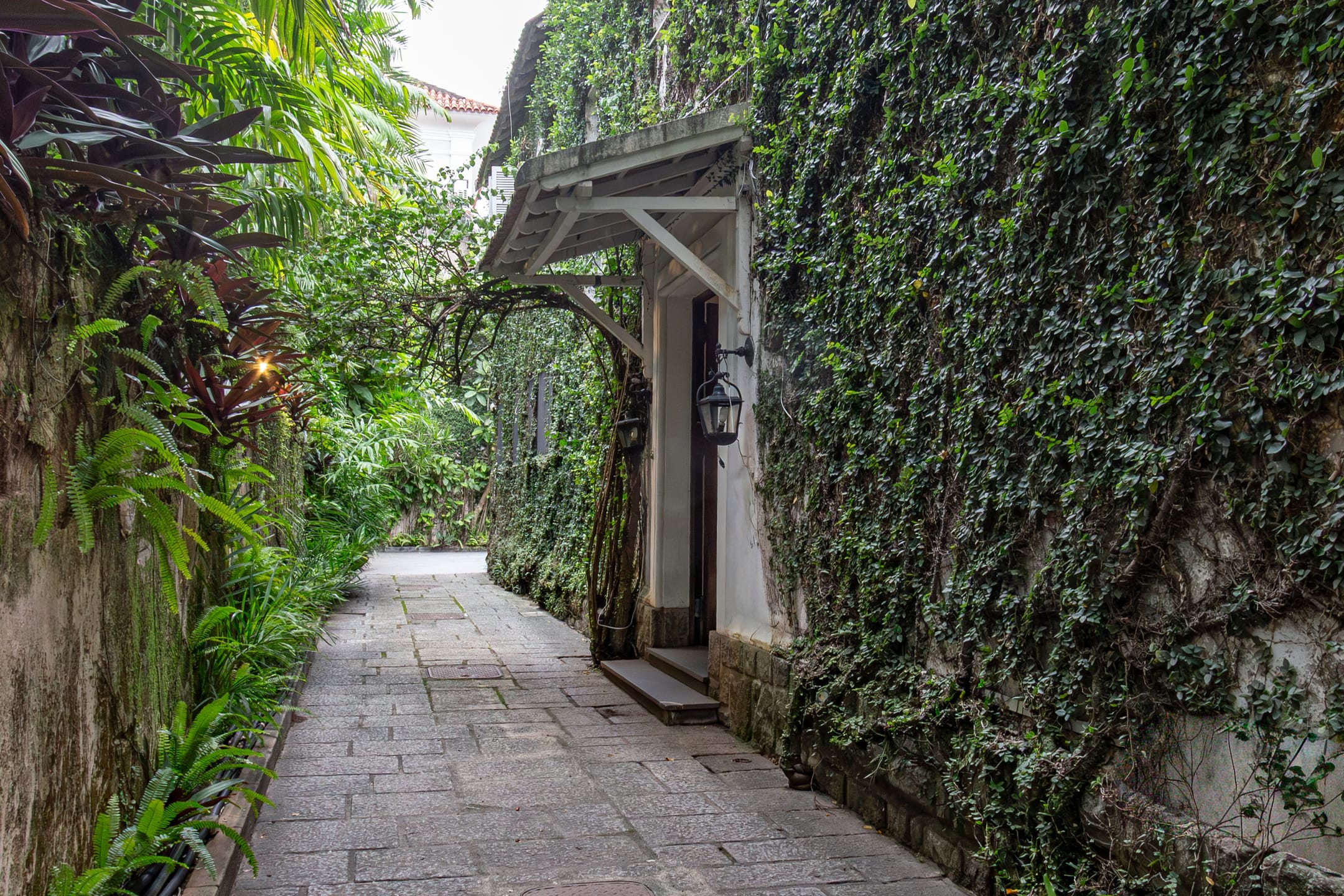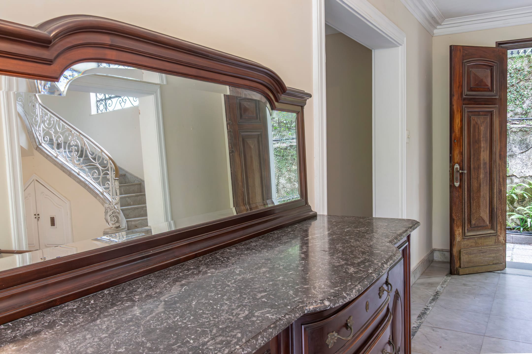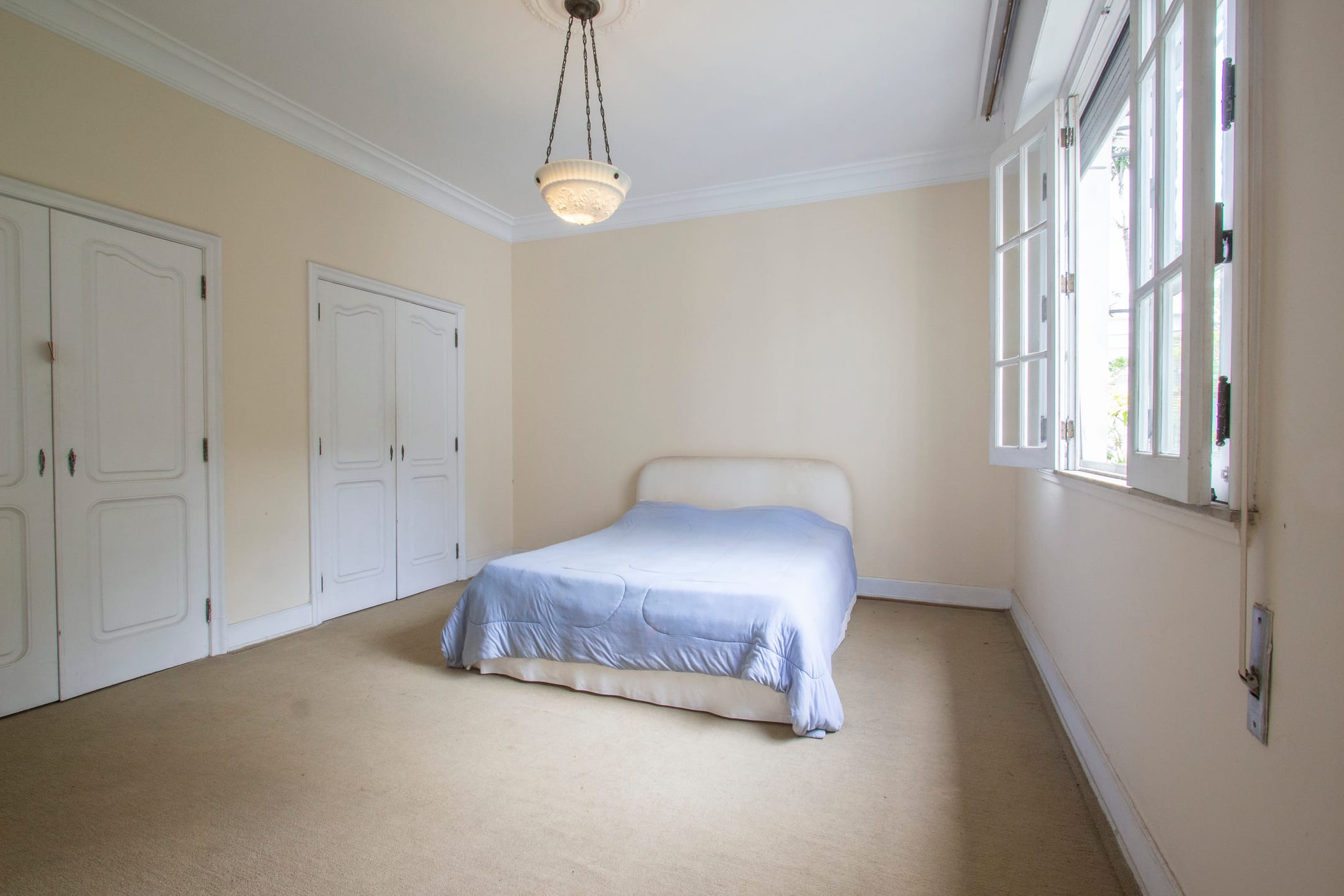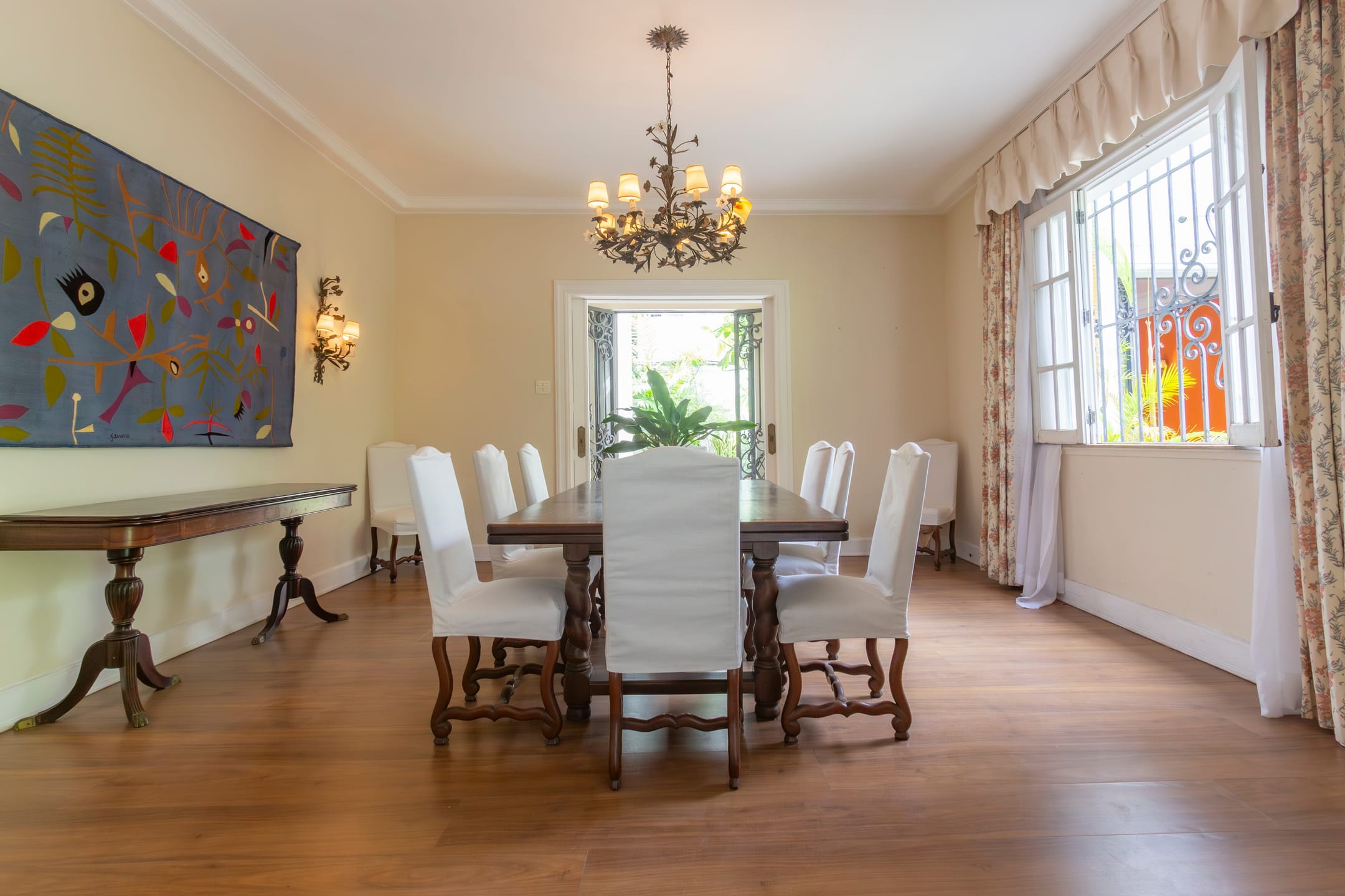Imóvel em estilo clássico à venda no Leblon, Rio de Janeiro. A casa possui amplas salas de estar e jantar, cinco dormitórios, três banheiros sendo um lavabo, garagem para três veículos, jardim de inverno e elevador. Além disso, o lote conta com uma dependência anexa, com dois quartos, cozinha e banheiro.