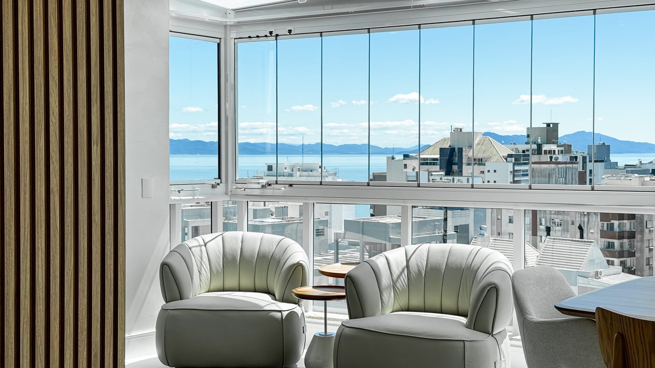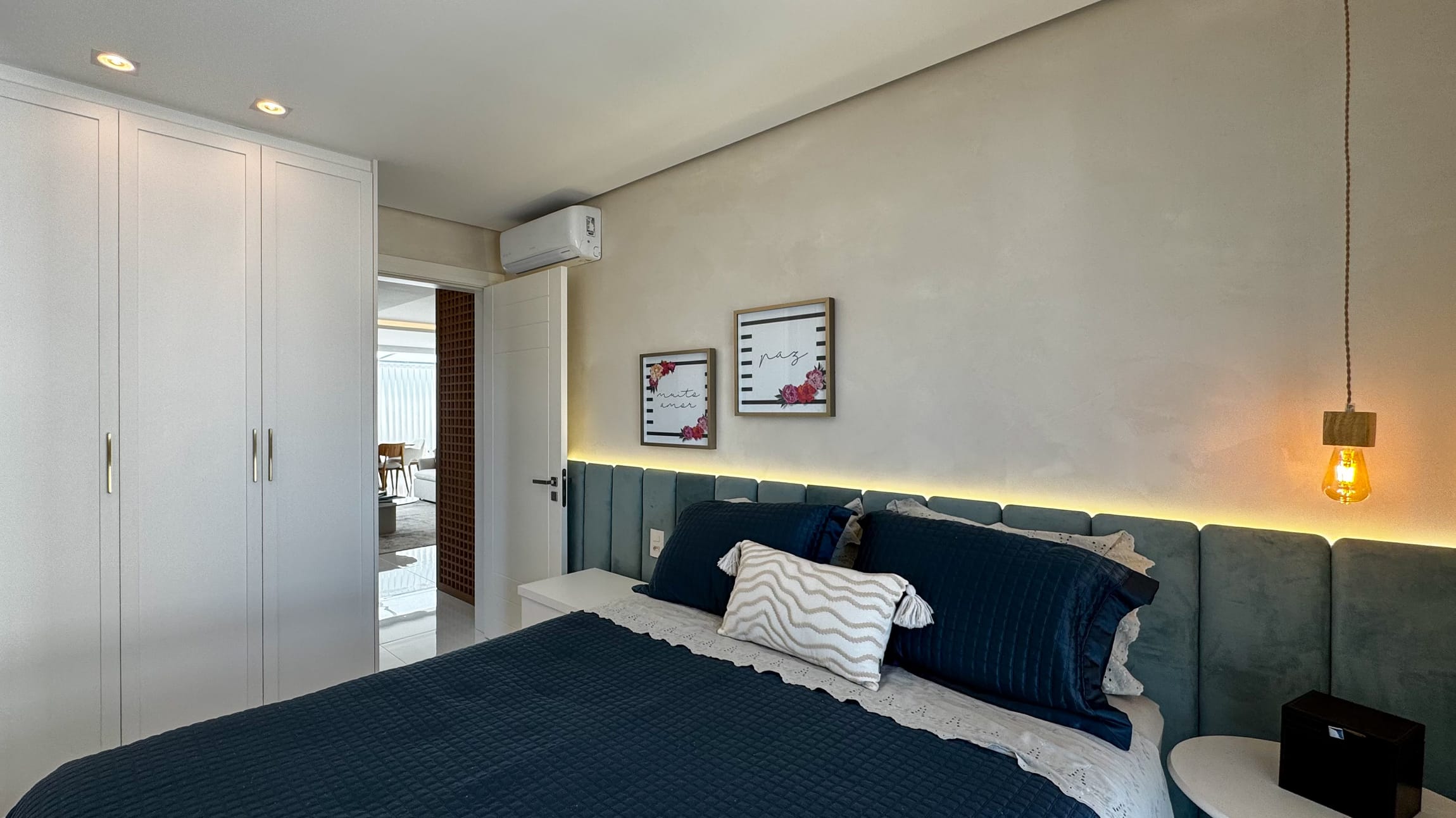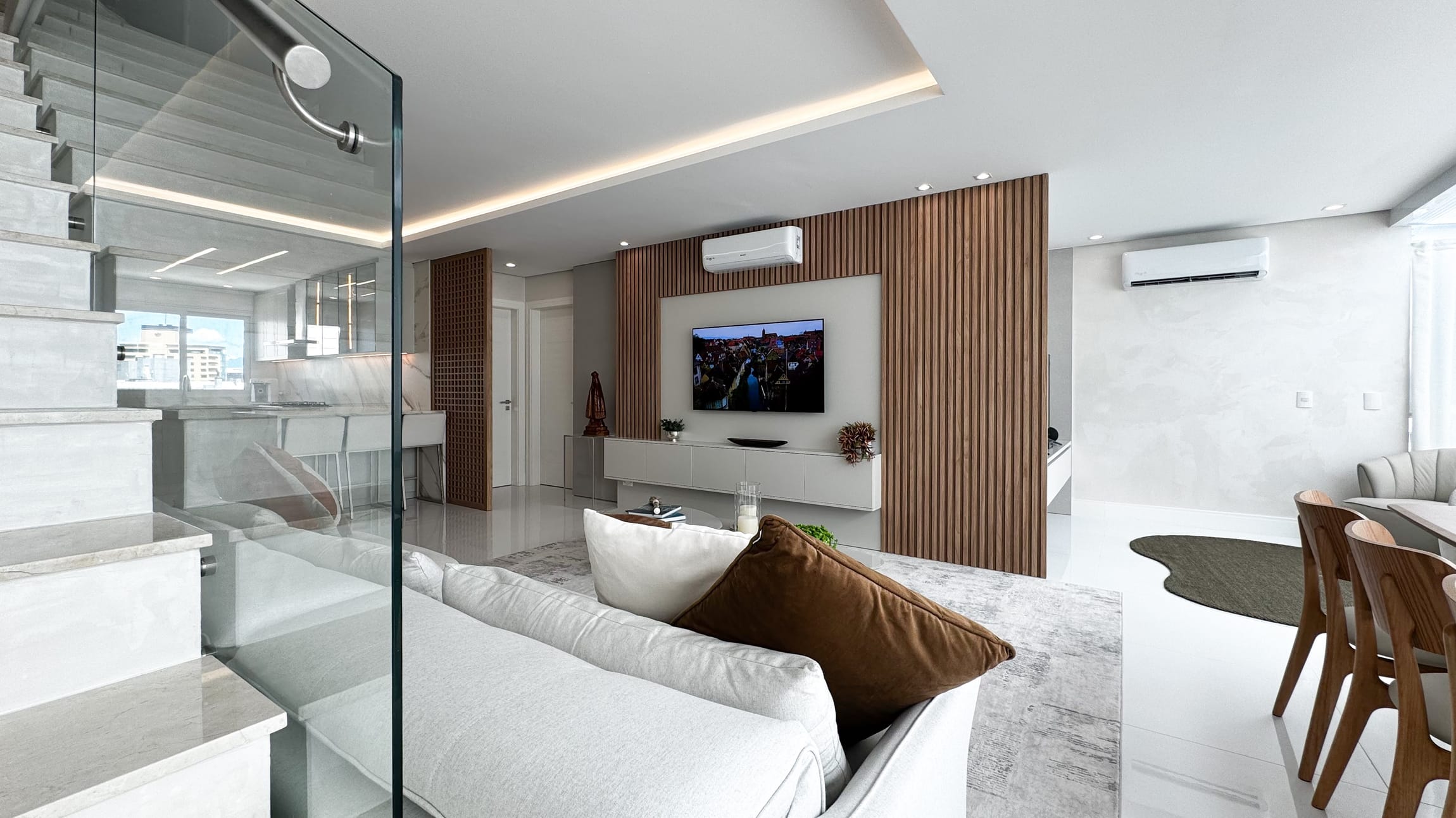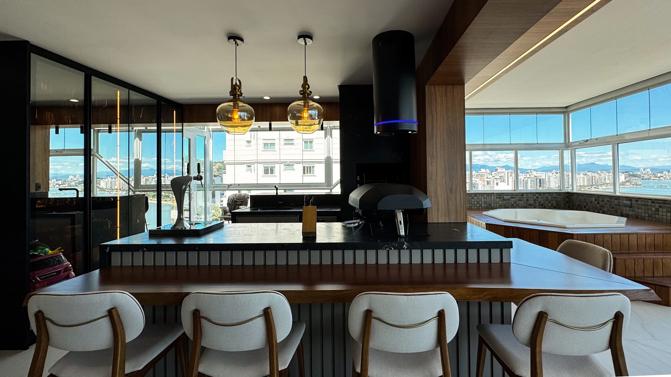 No pavimento superior, o espaço se transforma em um ambiente perfeito para receber: sala de estar, área gourmet completa e uma jacuzzi com vista para o mar, ideal para relaxar e apreciar o pôr do sol sobre a Beira-Mar.