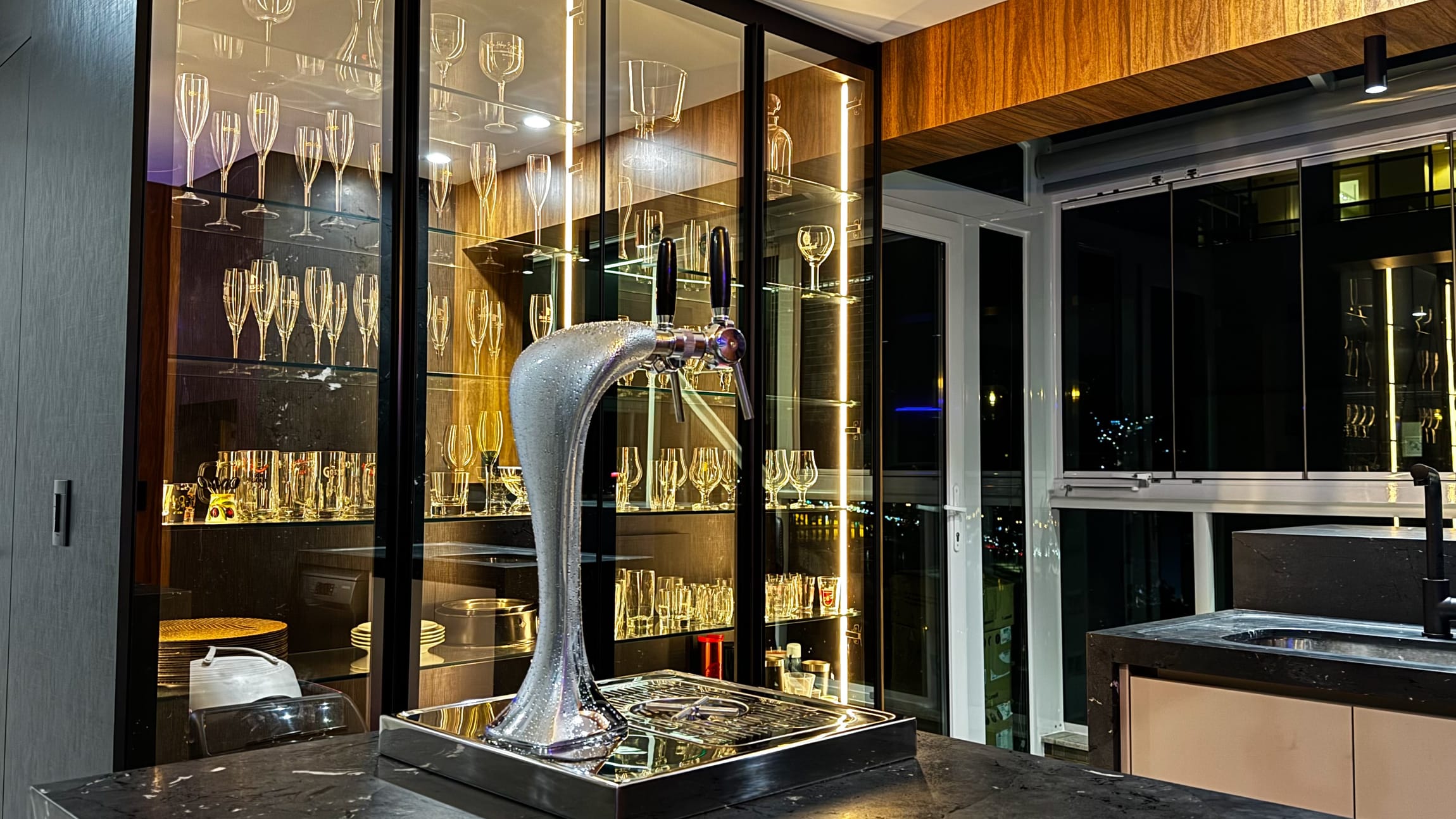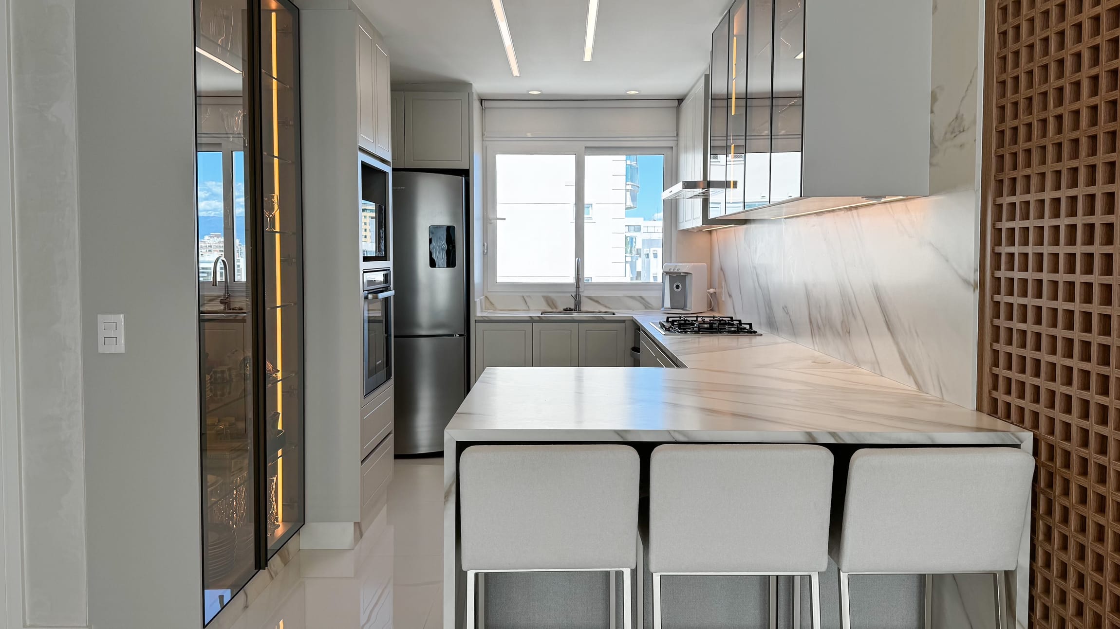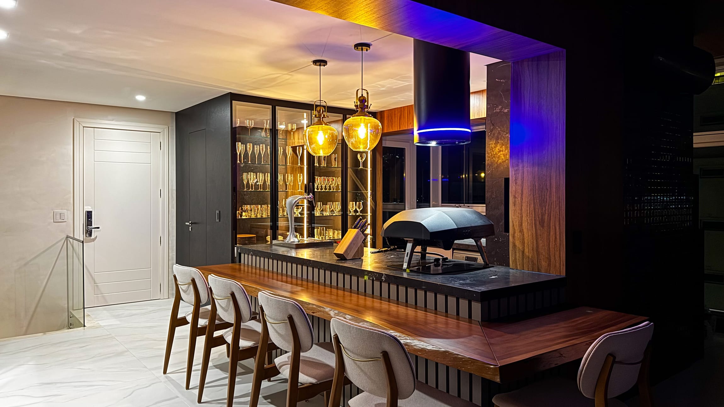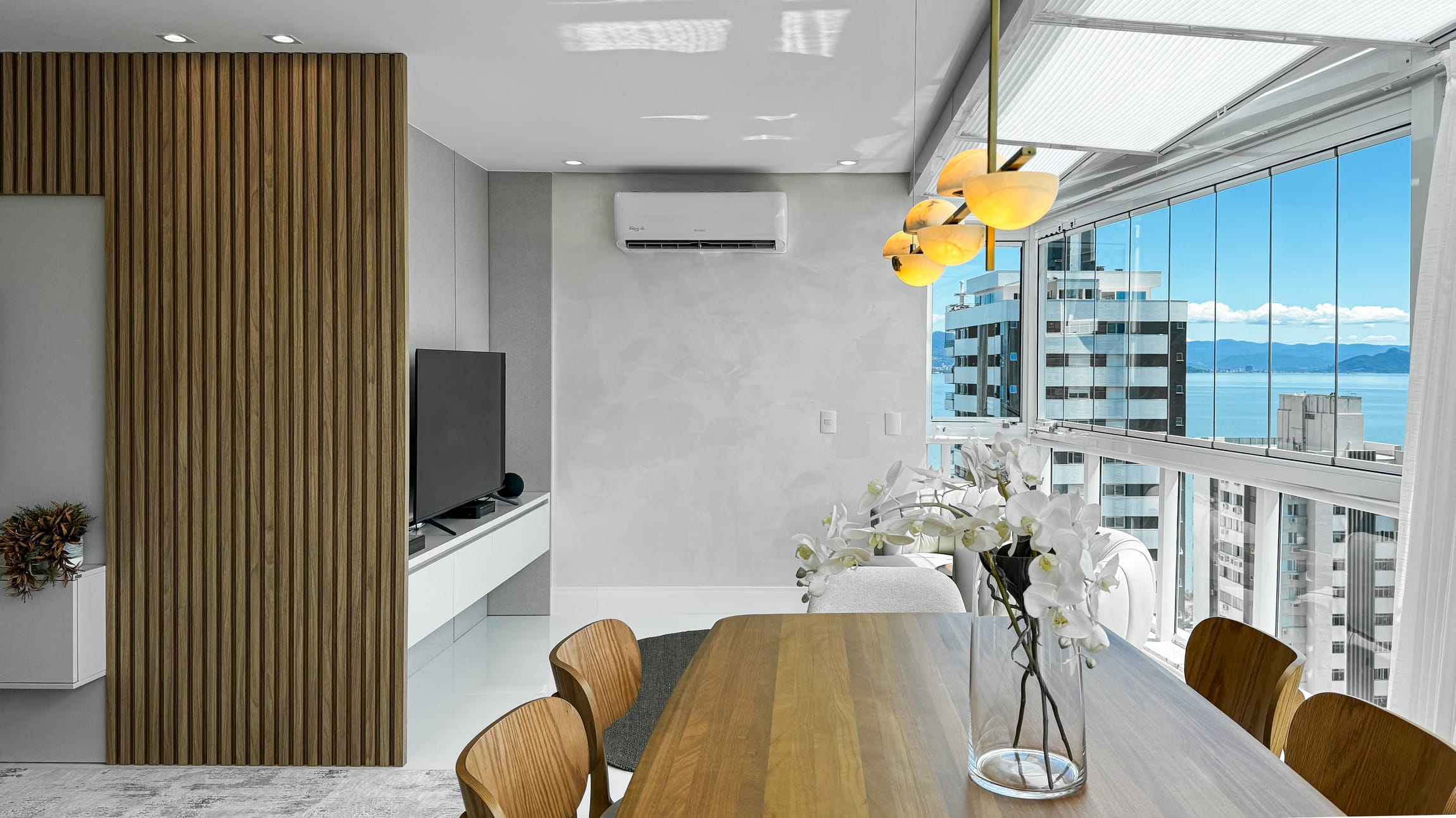No pavimento superior, o espaço se transforma em um ambiente perfeito para receber: sala de estar, área gourmet completa e uma jacuzzi com vista para o mar, ideal para relaxar e apreciar o pôr do sol sobre a Beira-Mar.