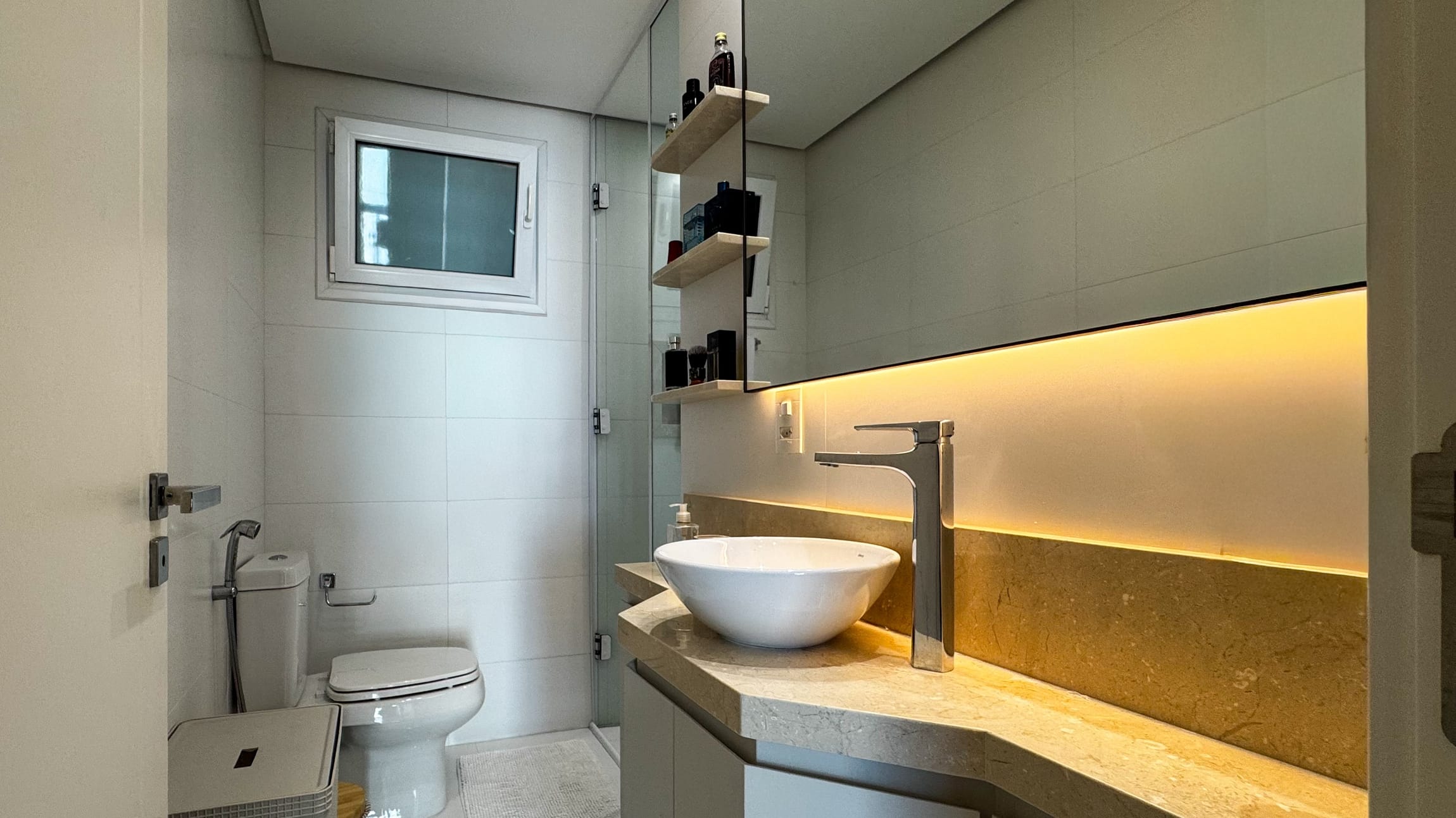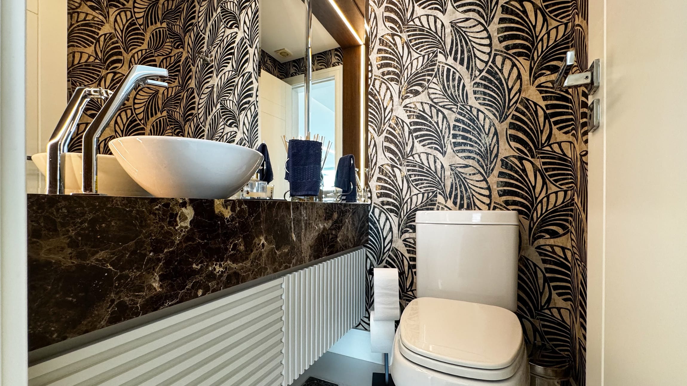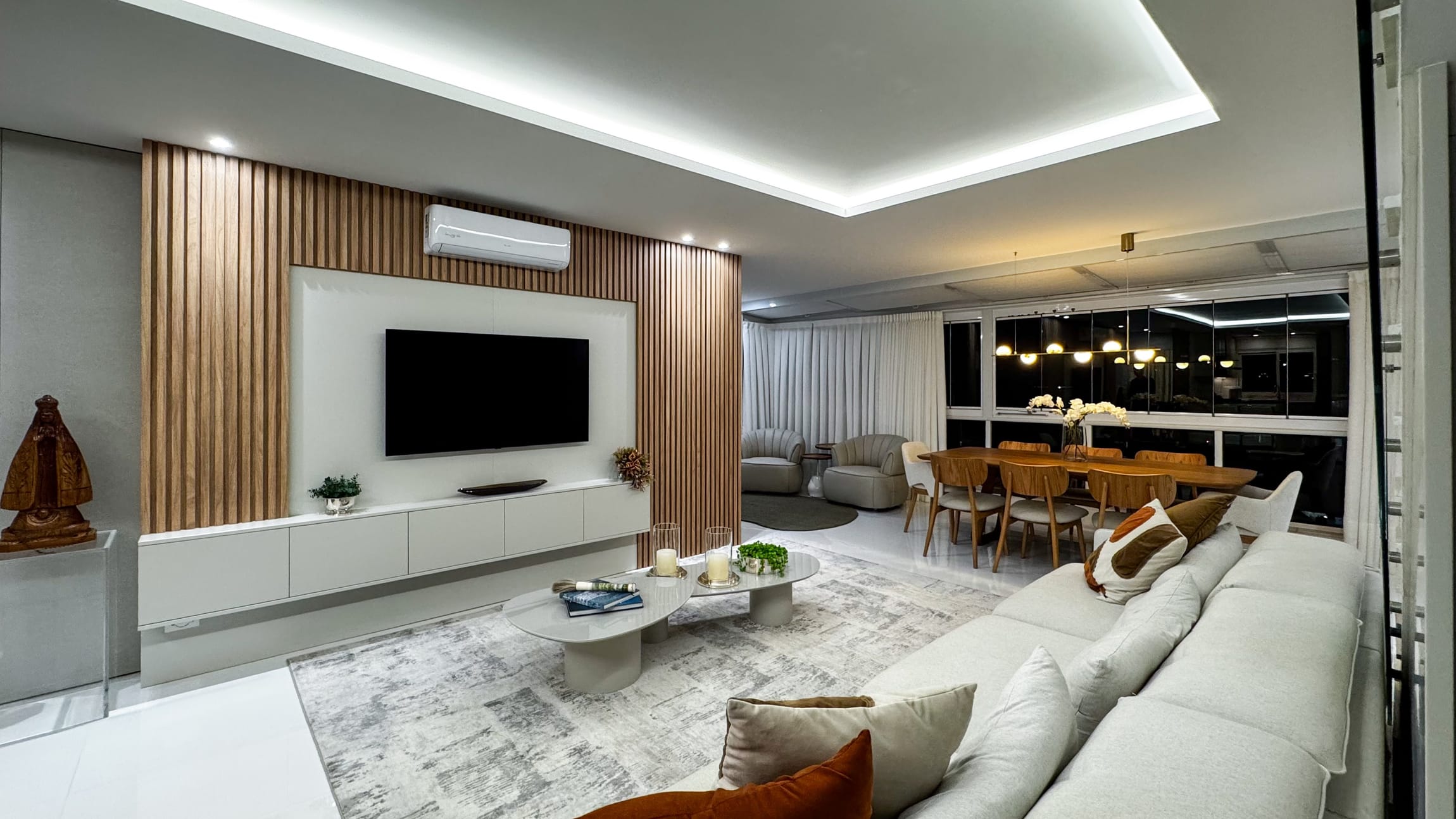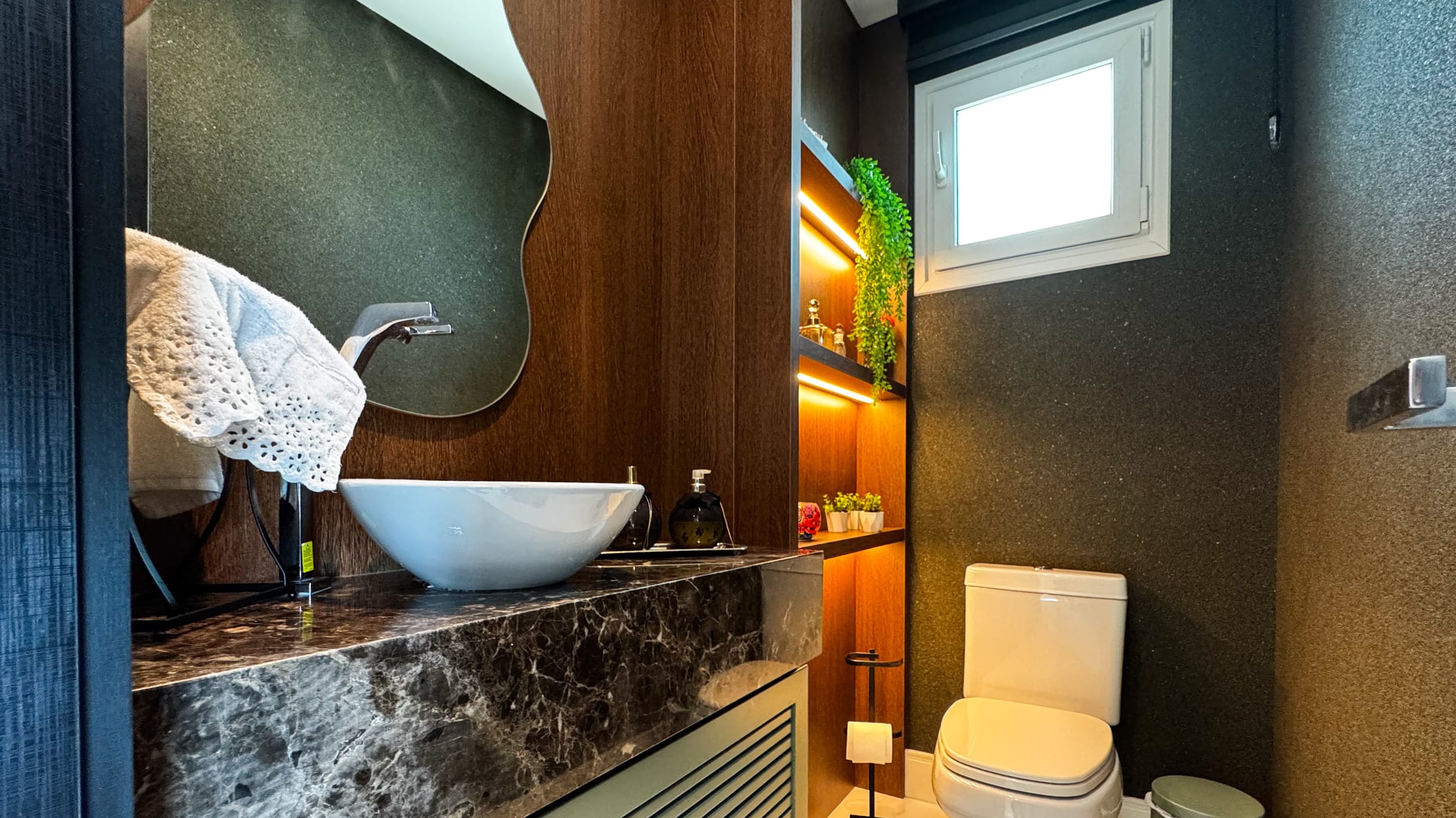 No pavimento inferior, são 3 suítes amplas, um living integrado para dois ambientes, cozinha moderna e funcional, além de 5 banheiros, 2 lavabos e área de serviço.