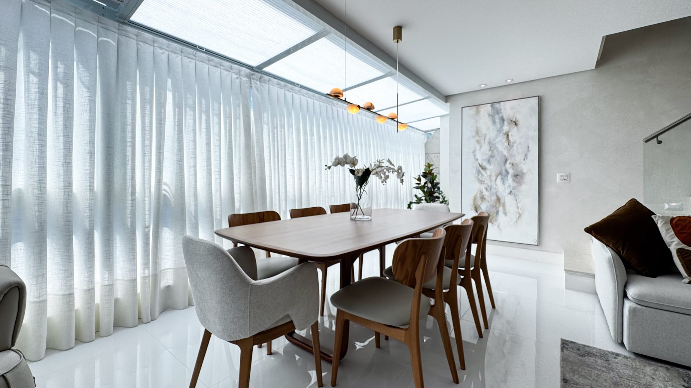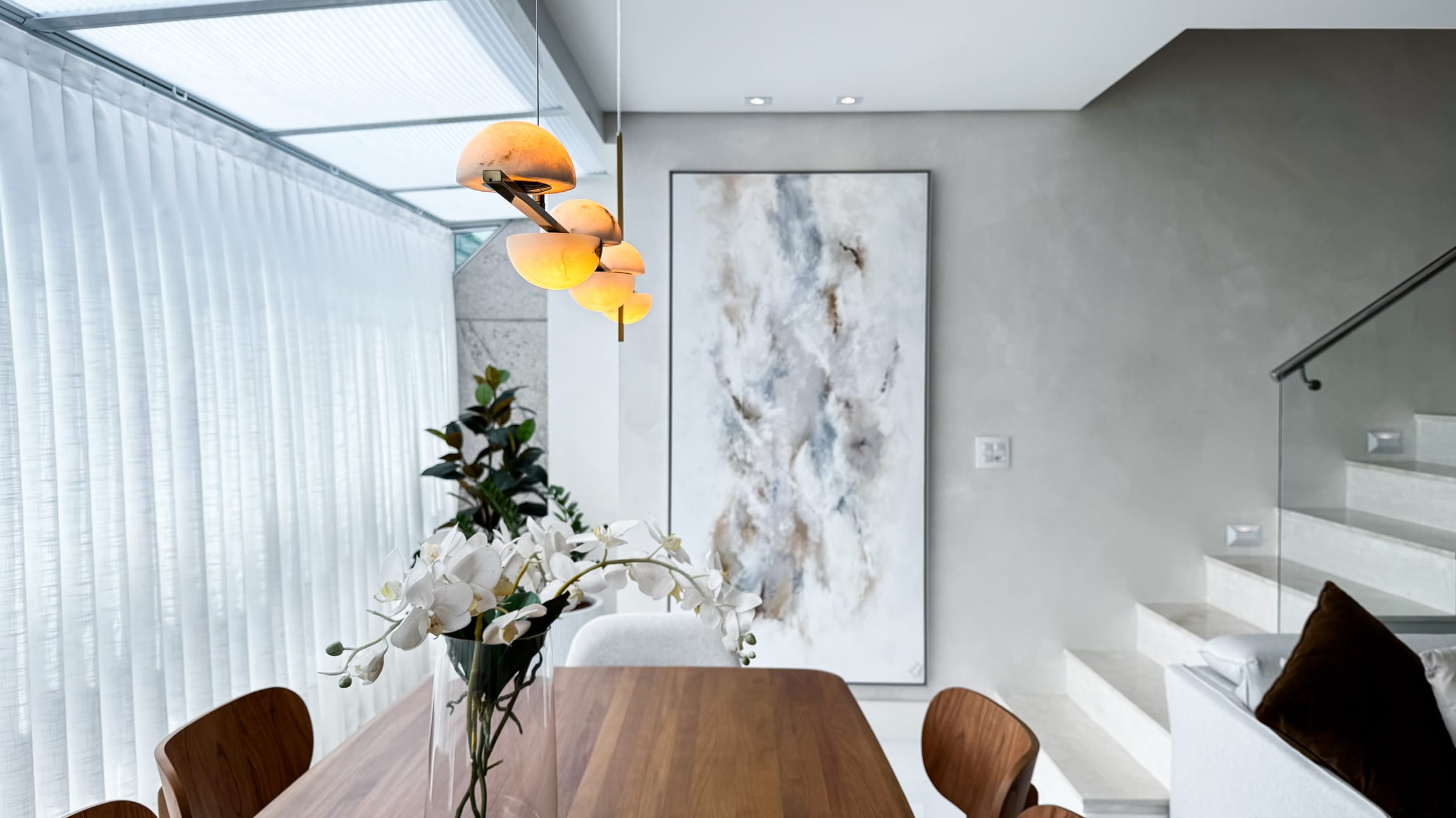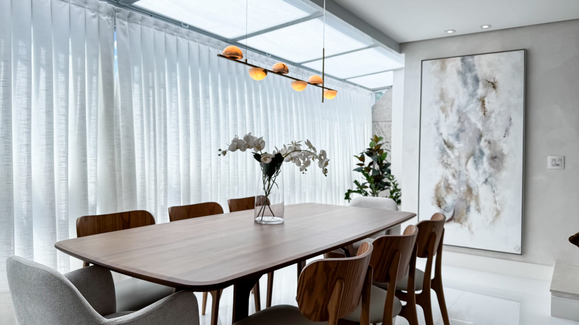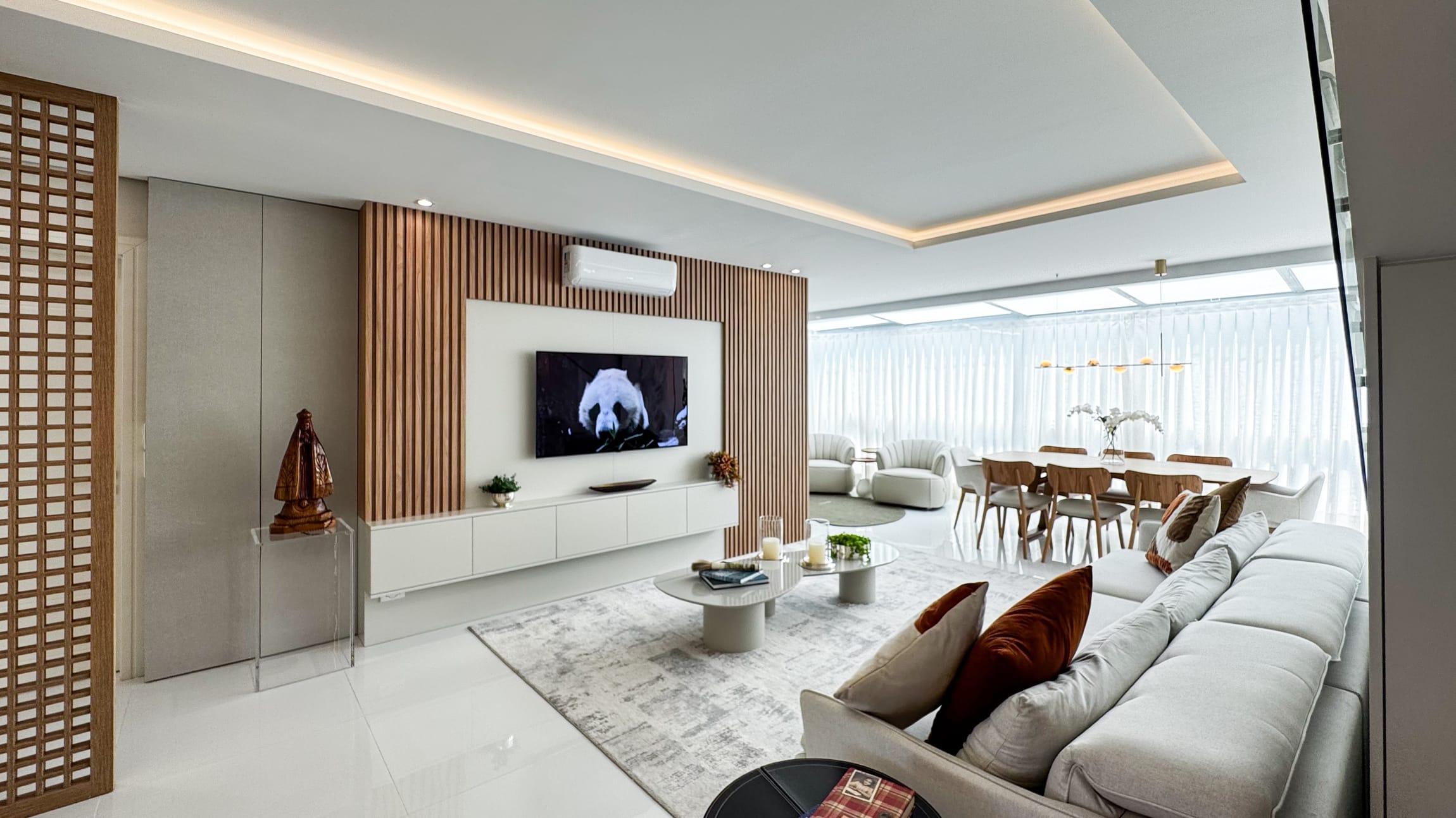 No pavimento inferior, são 3 suítes amplas, um living integrado para dois ambientes, cozinha moderna e funcional, além de 5 banheiros, 2 lavabos e área de serviço.