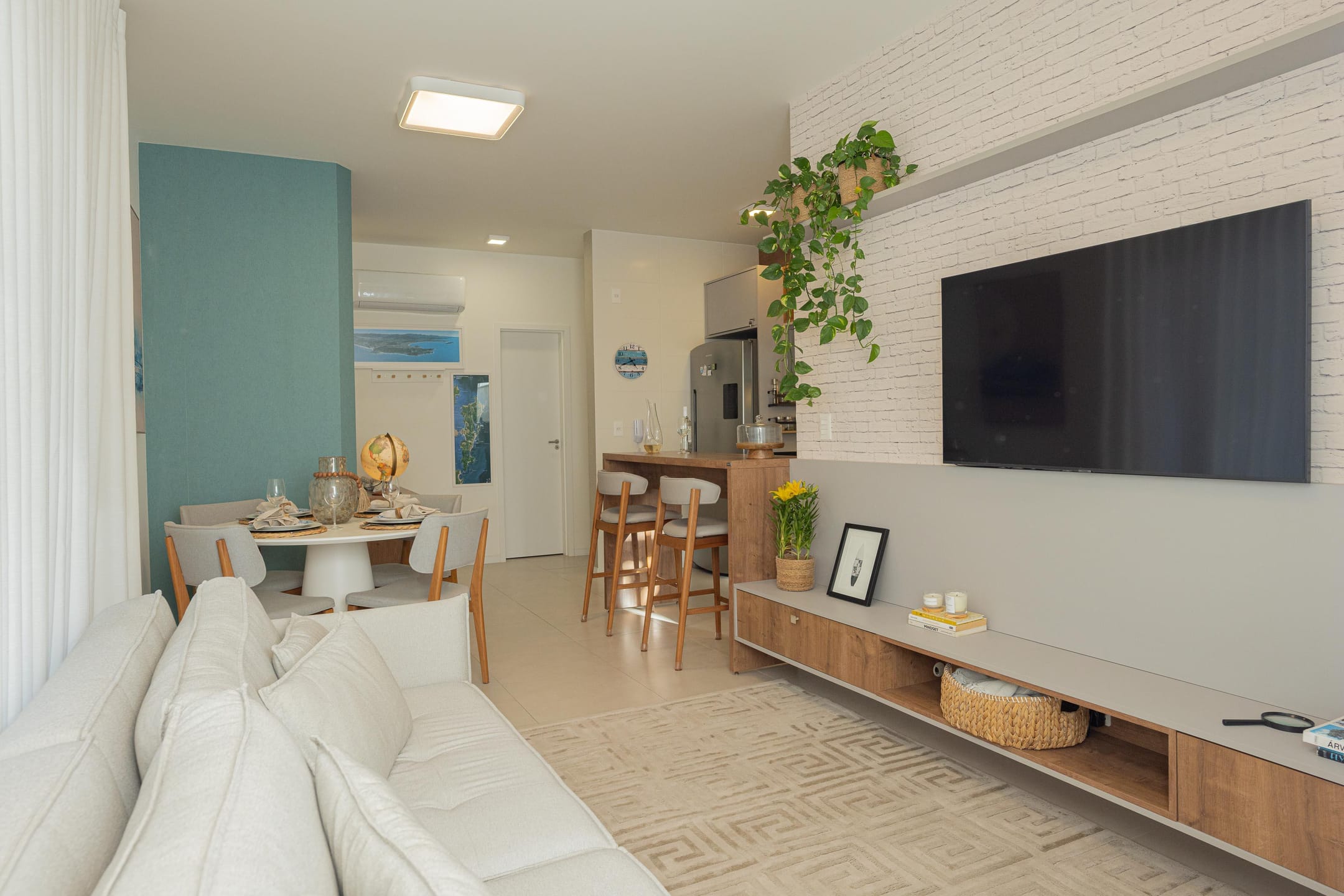 Cobertura de três dormitórios, sendo uma suíte, salas integradas, cozinha em conceito aberto com lavanderia, lavabo. Terraço aberto com churrasqueira à carvão, espera para hidromassagem e vista para o mar.