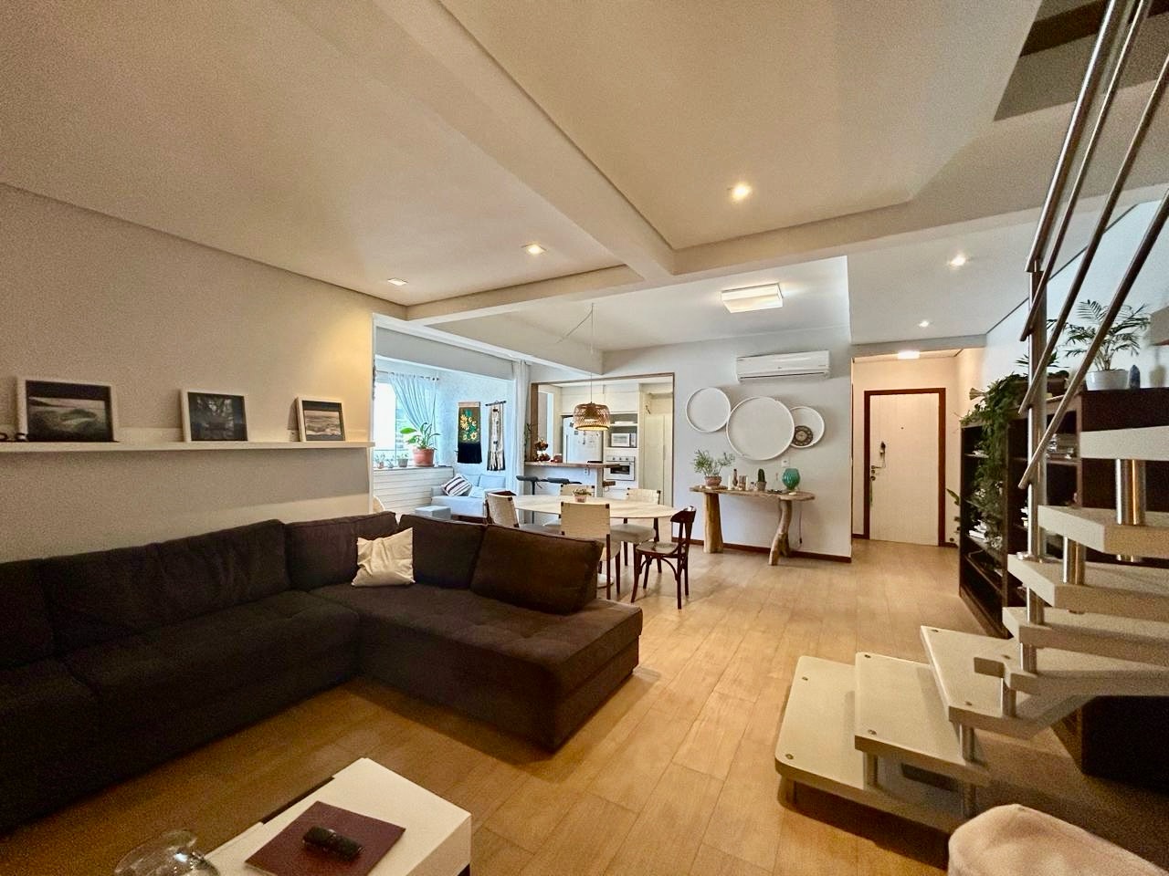 Linda cobertura duplex com elevador à venda com 4 suítes, sendo 2 no térreo e 2 no piso superior, totalizando com 164 m² úteis. Ambientes amplos, 2 salas, 5 banheiros, e vista para a Lagoa. Acabamentos de alto padrão, excelente iluminação natural e elevador privativo.