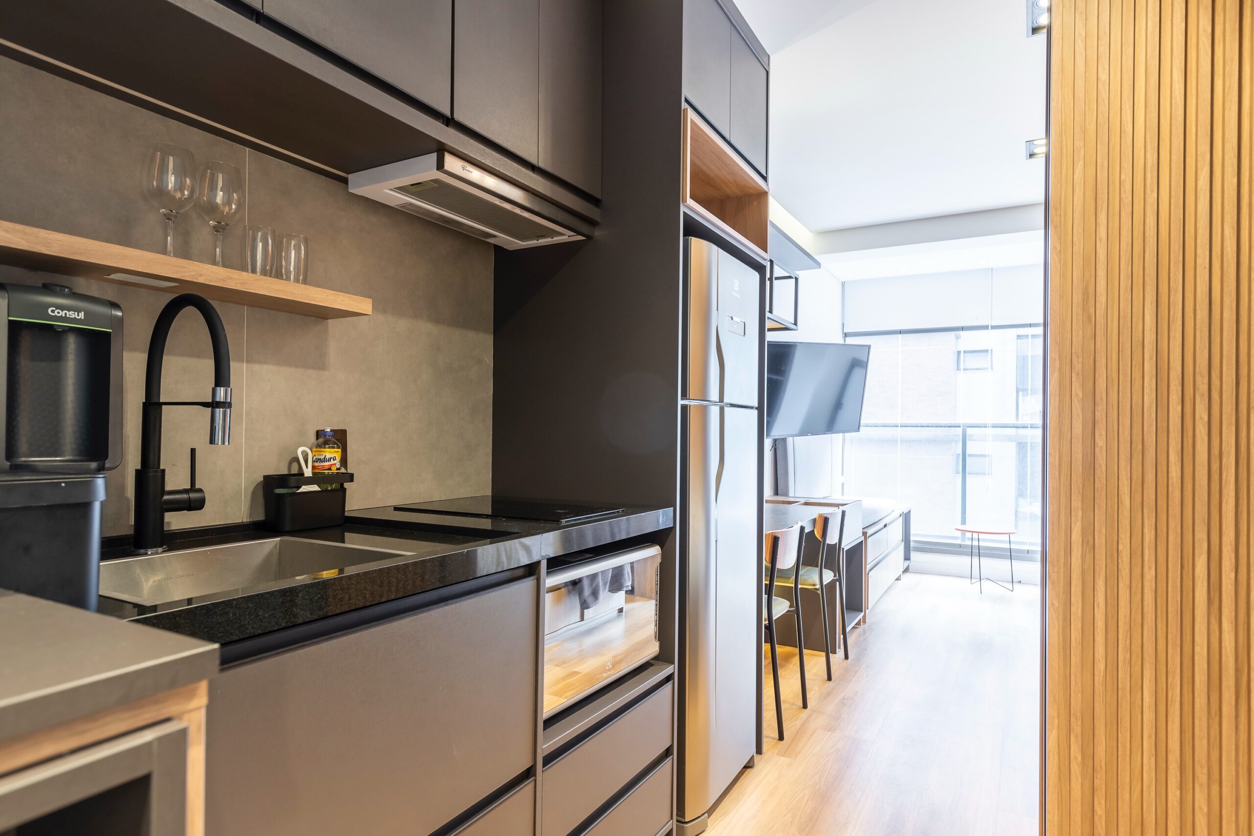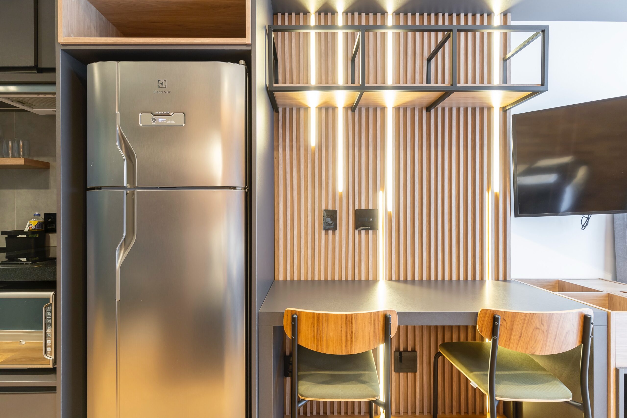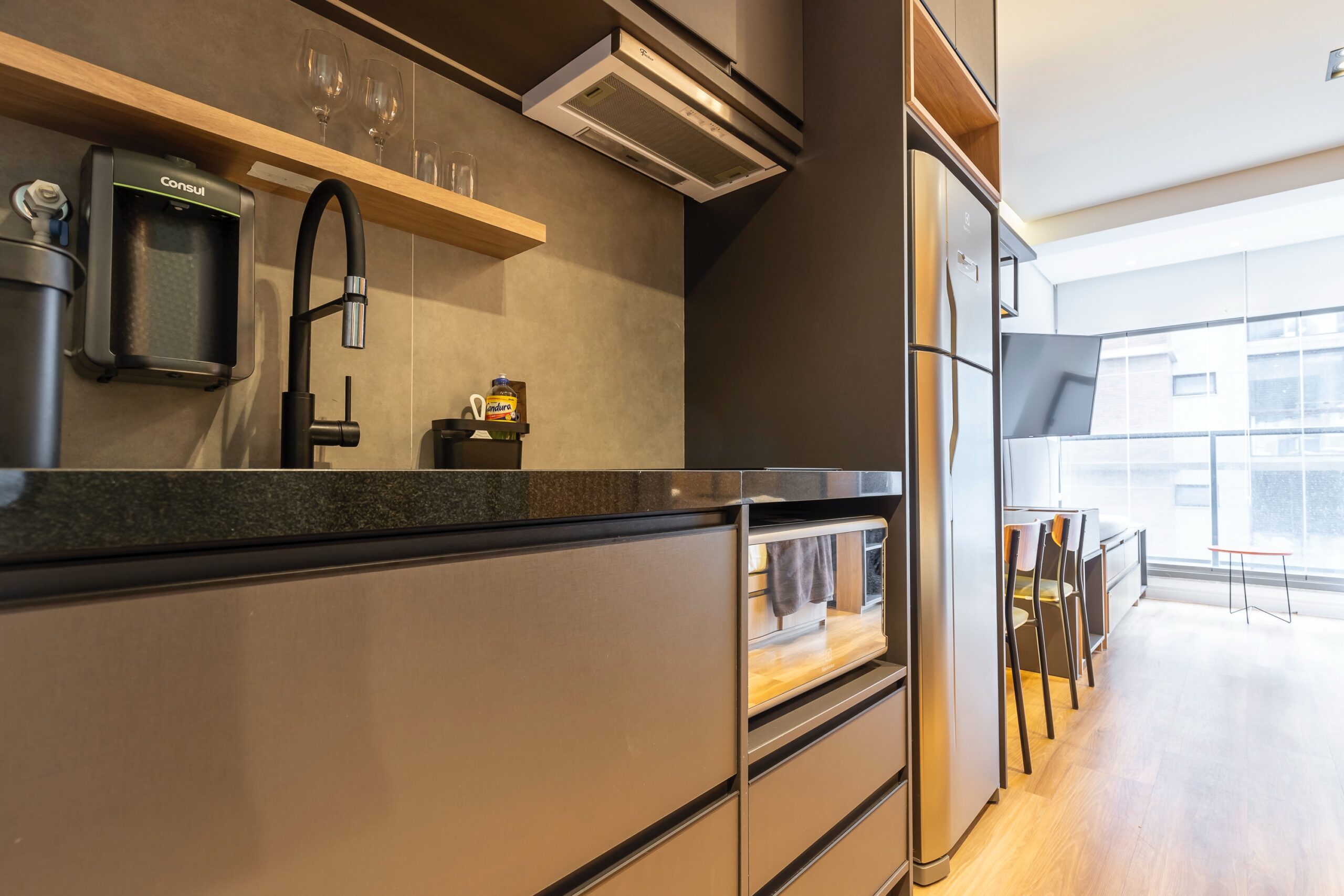 O imóvel oferece marcenaria planejada funcional e está equipado com micro-ondas, geladeira, cooktop, TV, sofá, mesa com duas cadeiras e cama box, oferecendo praticidade e conforto em um ambiente moderno e bem aproveitado. No banheiro, tenha a comodidade de um toalheiro elétrico. Além disto, você encontra muita luz natural e confortável espaço para trabalhar remotamente.