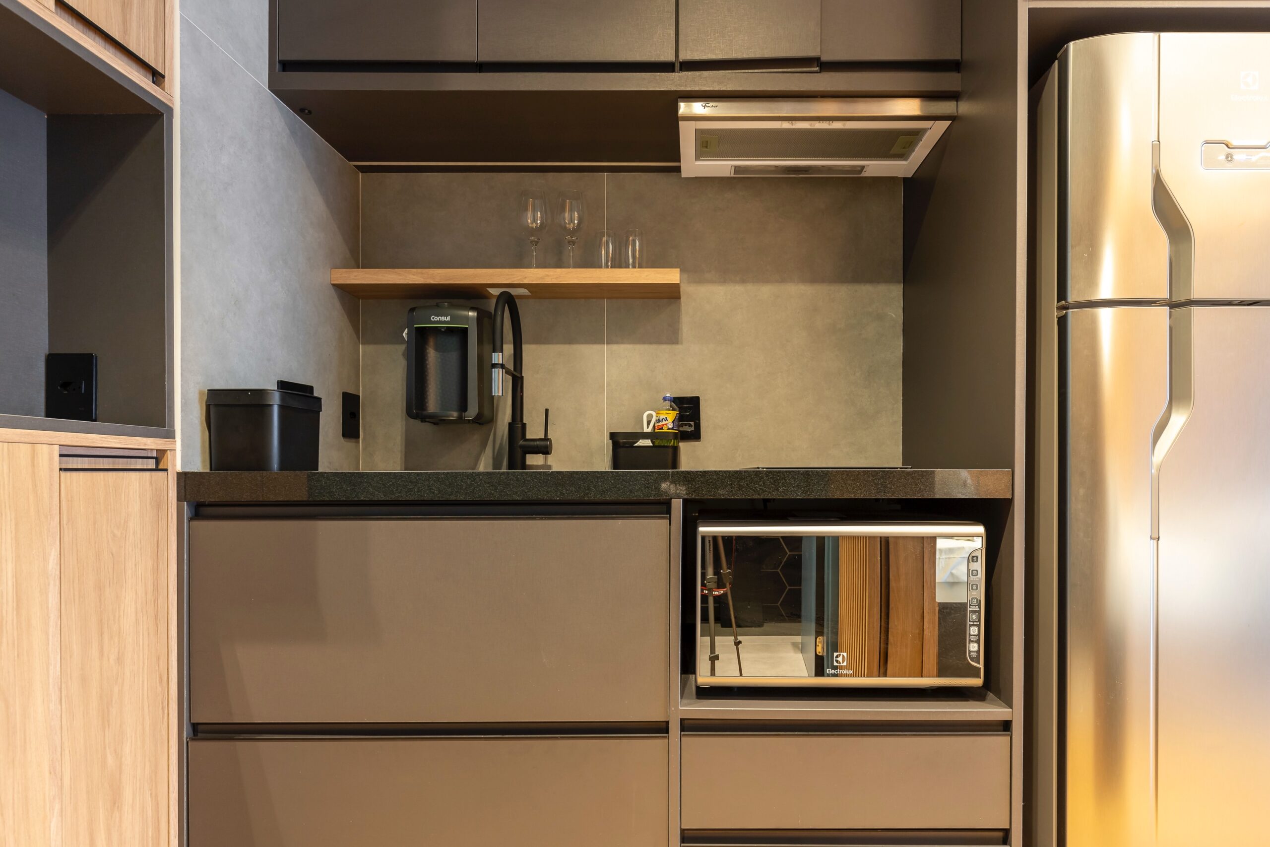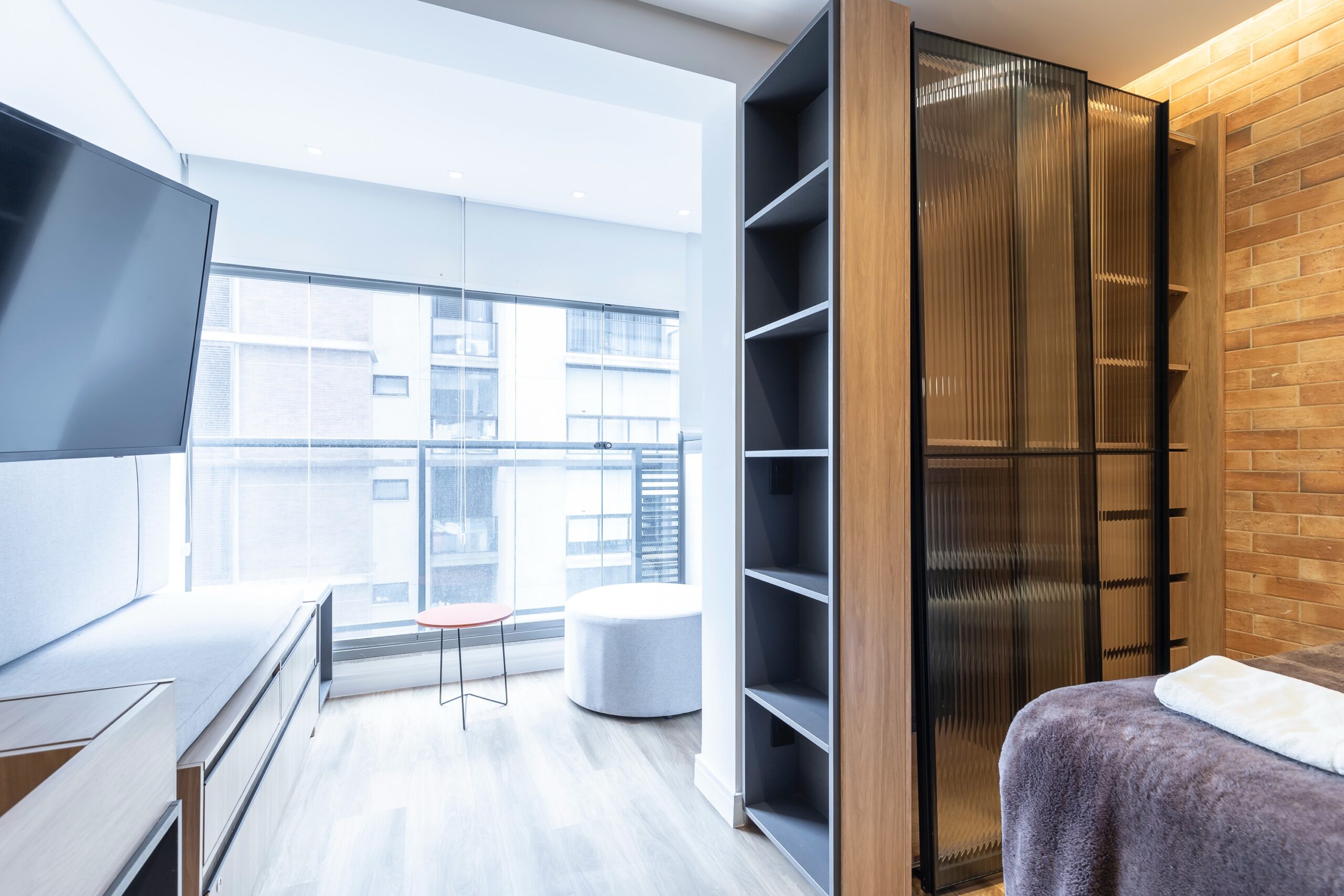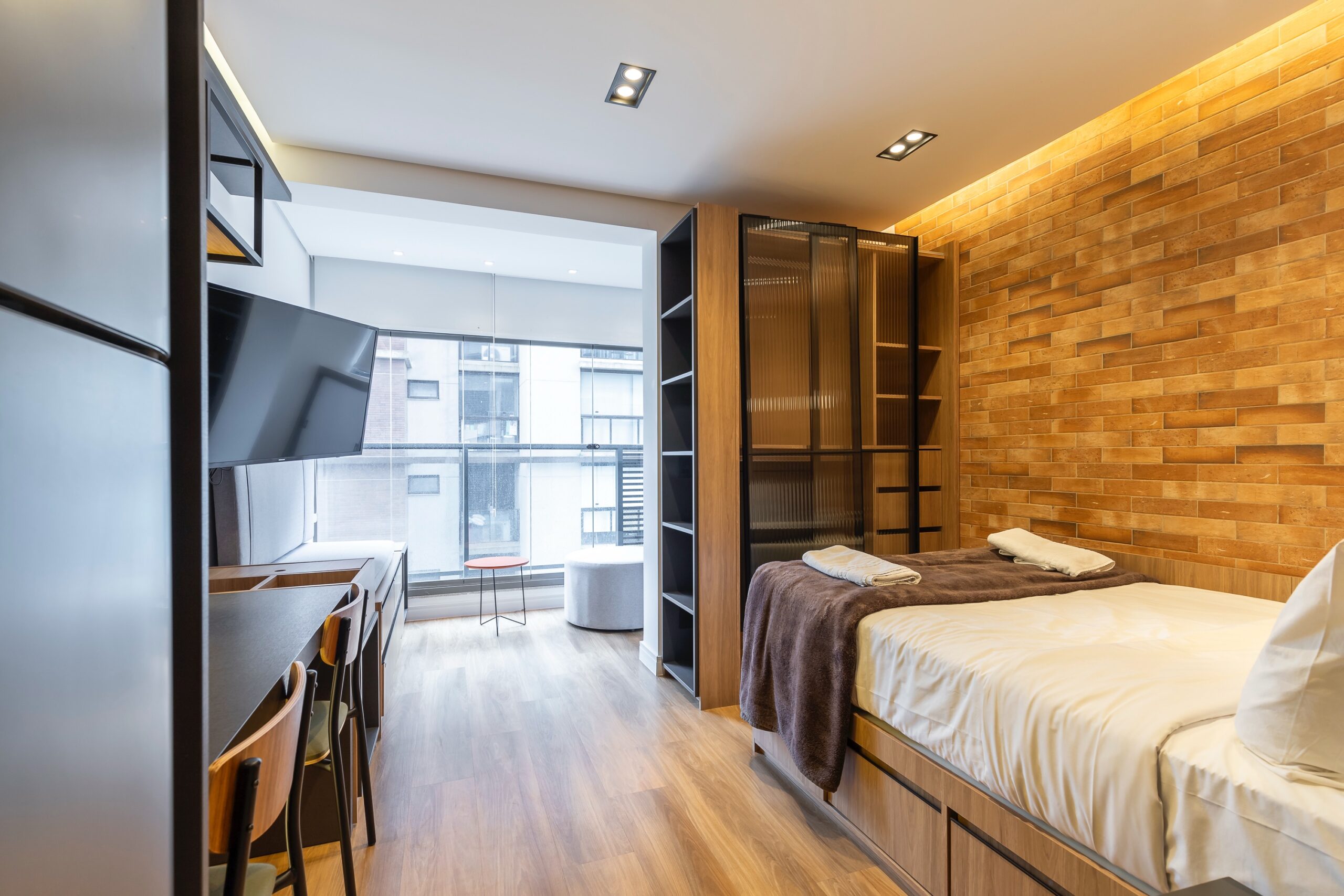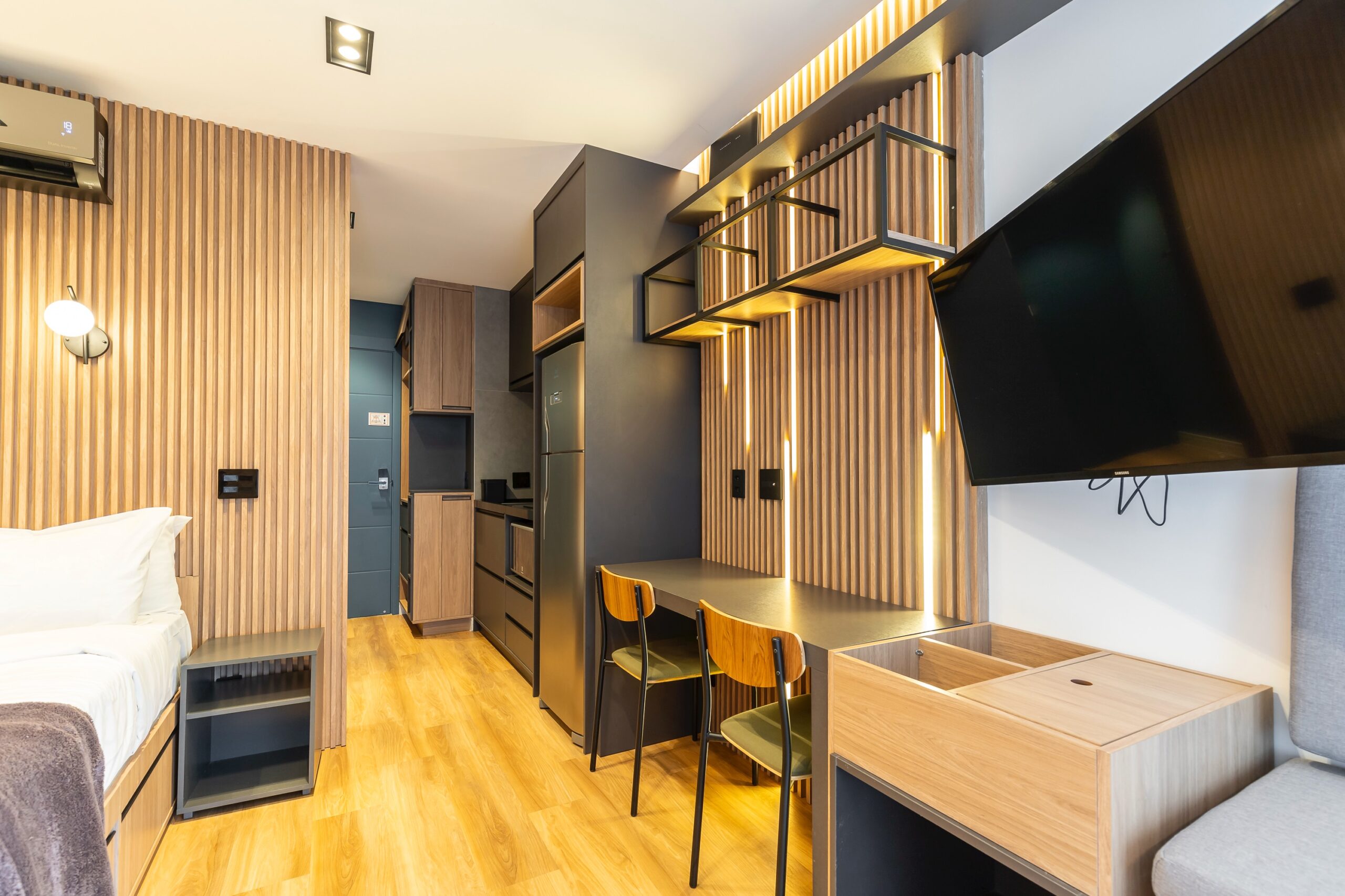 O imóvel oferece marcenaria planejada funcional e está equipado com micro-ondas, geladeira, cooktop, TV, sofá, mesa com duas cadeiras e cama box, oferecendo praticidade e conforto em um ambiente moderno e bem aproveitado. No banheiro, tenha a comodidade de um toalheiro elétrico. Além disto, você encontra muita luz natural e confortável espaço para trabalhar remotamente.